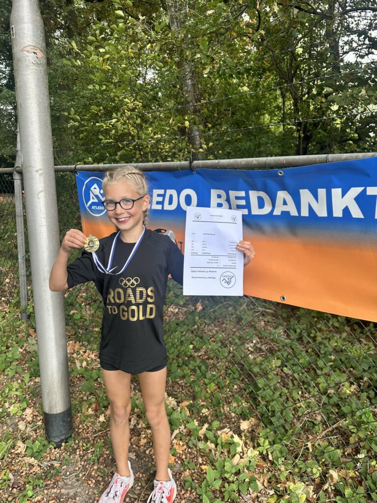 Laure traint met veel plezier bij AV Weert en doet regelmatig mee aan wedstrijden. Afgelopen zondag deed ze in Dongen mee bij de U10 Pupillen aan de meerkamp. Deze bestond uit vier onderdelen: 40 meter sprint, verspringen, vortexwerpen en de 1000 meter.
