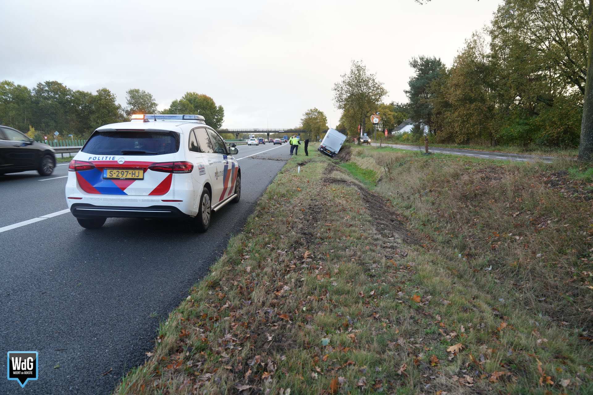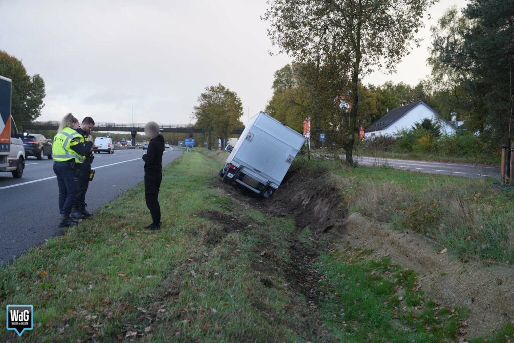 Update – Rond 17.45 uur werd een rijstrook afgesloten voor het verkeer zodat de berger het voertuig veilig uit de greppel kan halen. De overlast op de snelweg valt vooralsnog mee.