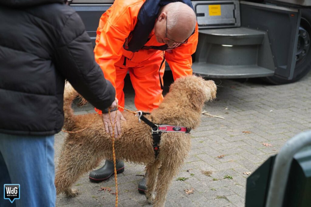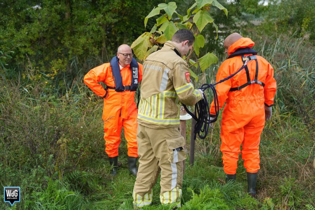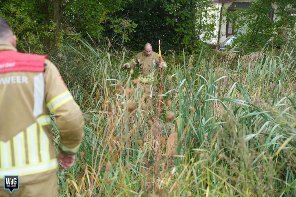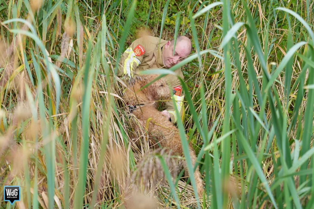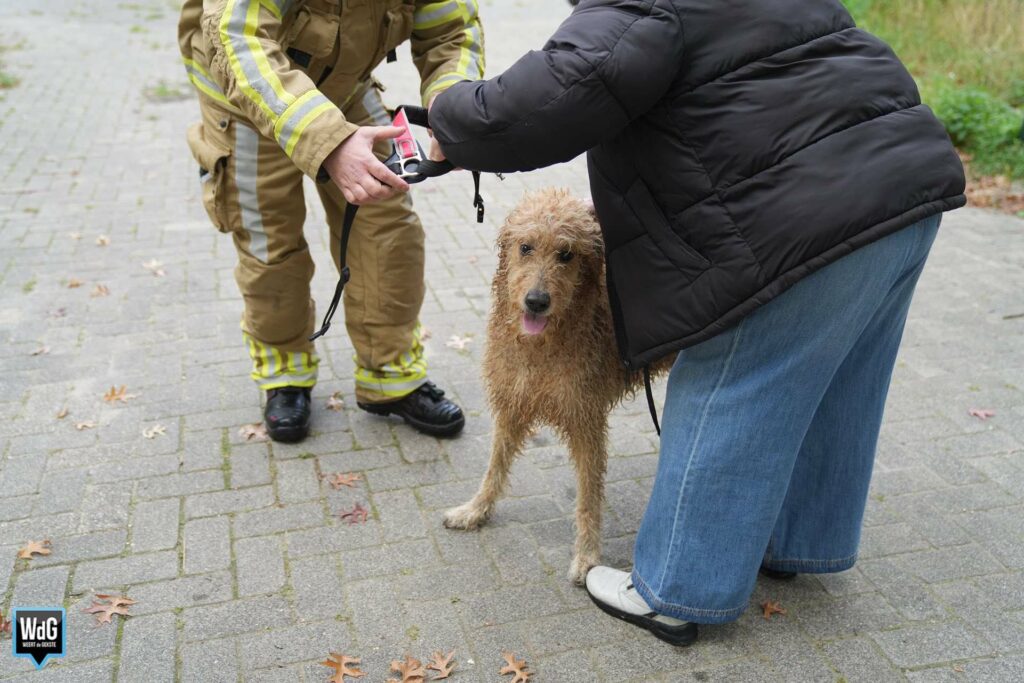 Via de Vijverhof wist een van de brandweerlieden de hond naar zich toe te lokken, waarna Rex veilig uit de sloot werd gehaald. Ook de achtergebleven riem werd nog netjes uit het water gevist door de brandweer.