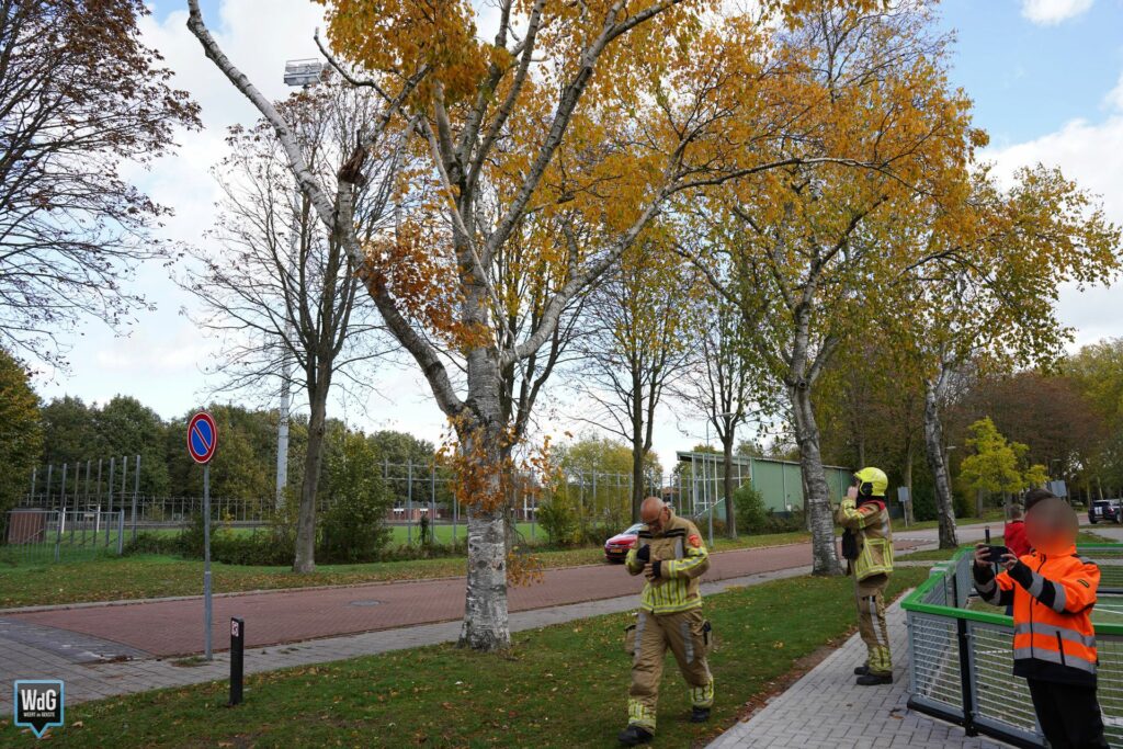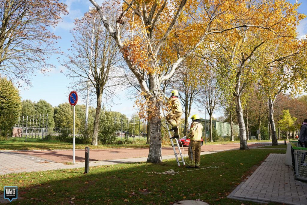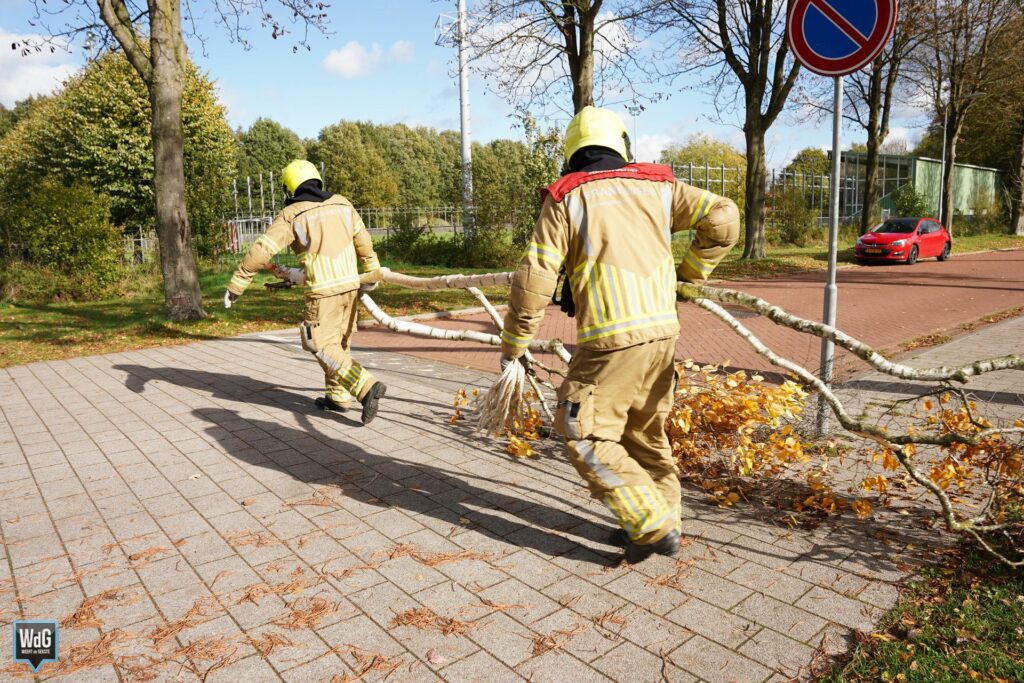 De brandweer ging met een ladder omhoog, bond een touw om de tak en wist deze voorzichtig uit de boom te trekken. De situatie was daarmee snel onder controle.