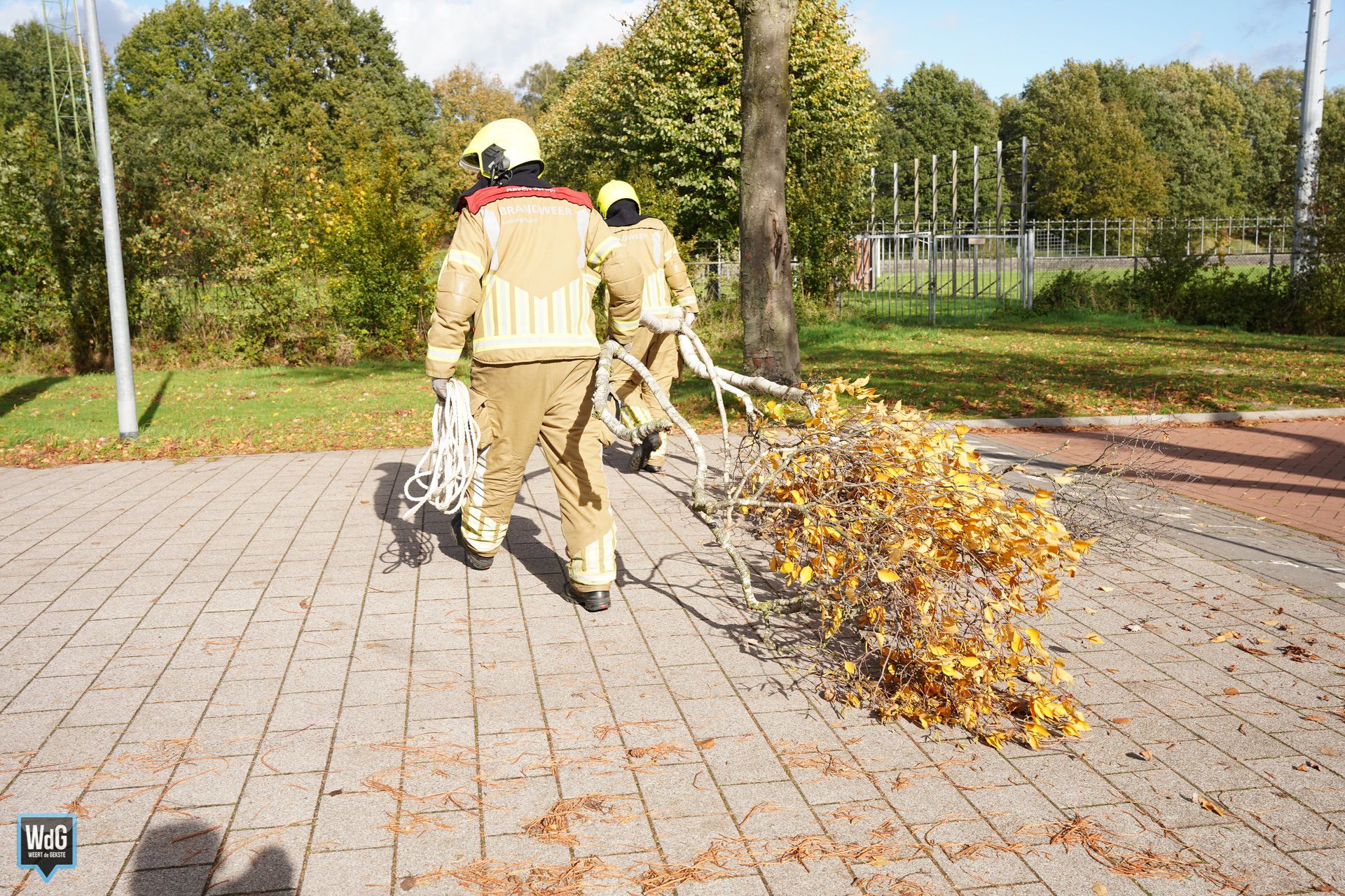 De brandweer ging met een ladder omhoog, bond een touw om de tak en wist deze voorzichtig uit de boom te trekken. De situatie was daarmee snel onder controle.