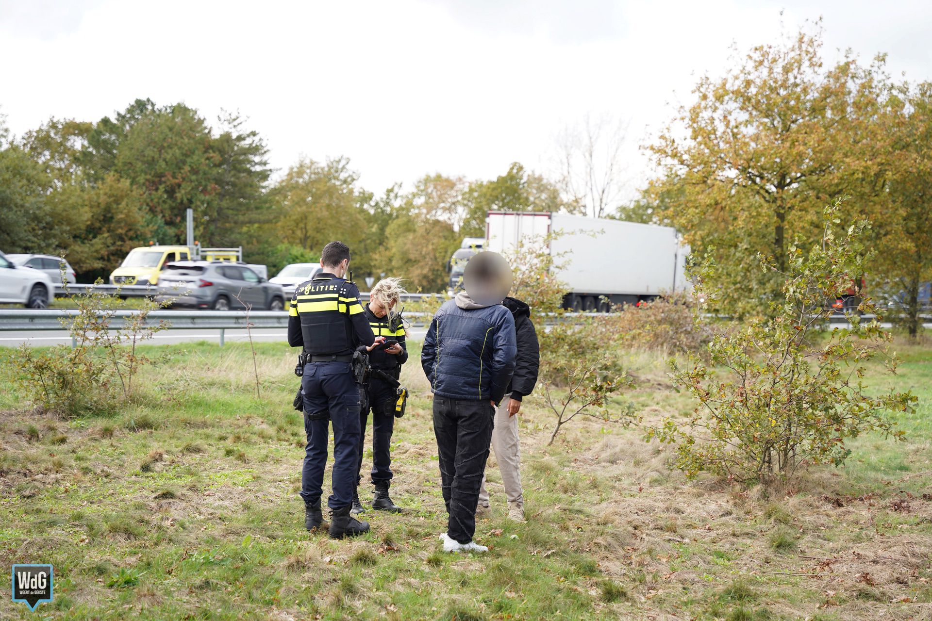 Twee personen afkomstig uit het nabijgelegen AZC probeerden de snelweg over te steken. Ze zijn staande gehouden door de politie en kregen een boete opgelegd. Toen zij vervolgens weigerden mee te werken, greep de politie in.