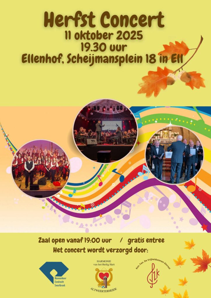 Ell – Op zaterdag 11 oktober verzorgen Harmonie van het Heilig Hart (o.l.v.. Henny Kusters), Mannenkoor Eendracht Swartbroek (o.l.v. Paul Koolen) en Fanfare de Vrijheidszonen uit het Belgische Kinrooi (o.l.v. Stefan Arits) een herfstconcert in de Ellenhof in Ell.