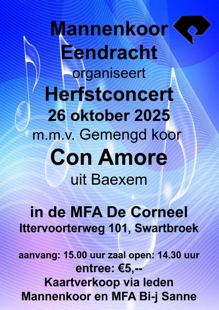 Dit concert vindt plaats op zondag 26 oktober in de MFA de Corneel, aan de Ittervoorterweg 101 in Swartbroek. De zaal gaat open om 14.30 uur. Het concert begint om 15.00.