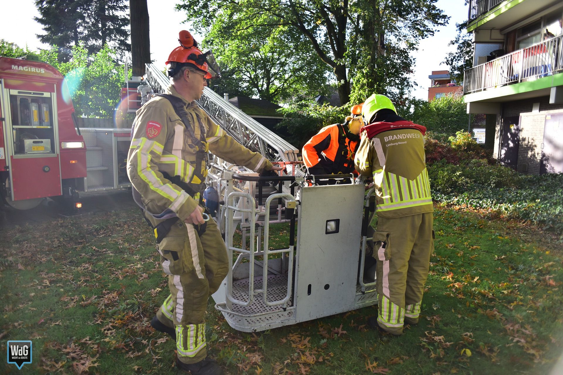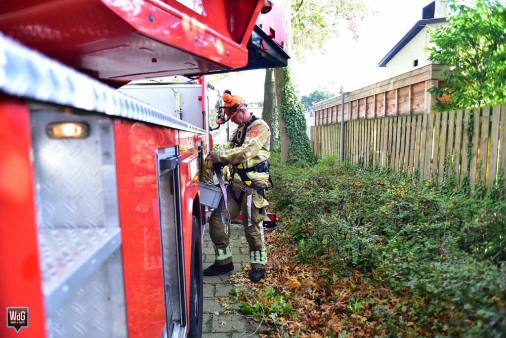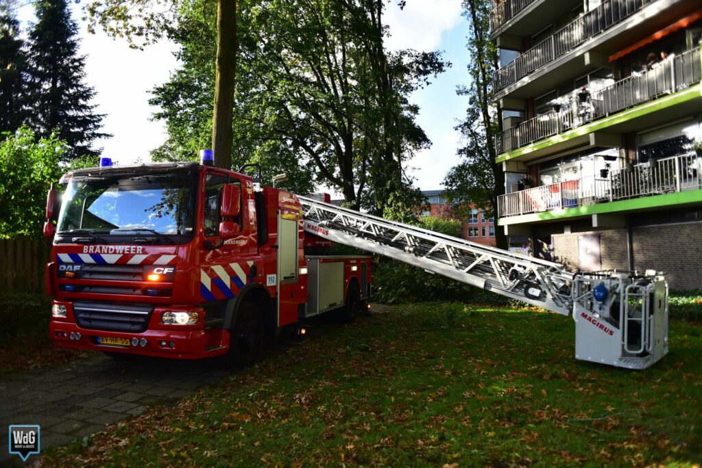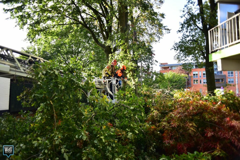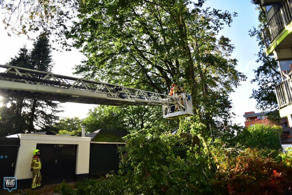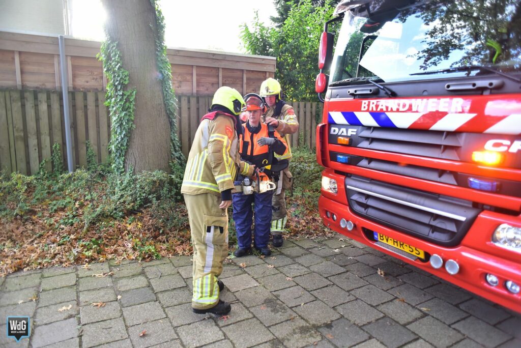 De brandweer kwam met een ladderwagen ter plaatse en heeft de tak met behulp van een zaag uit de boom verwijderd.