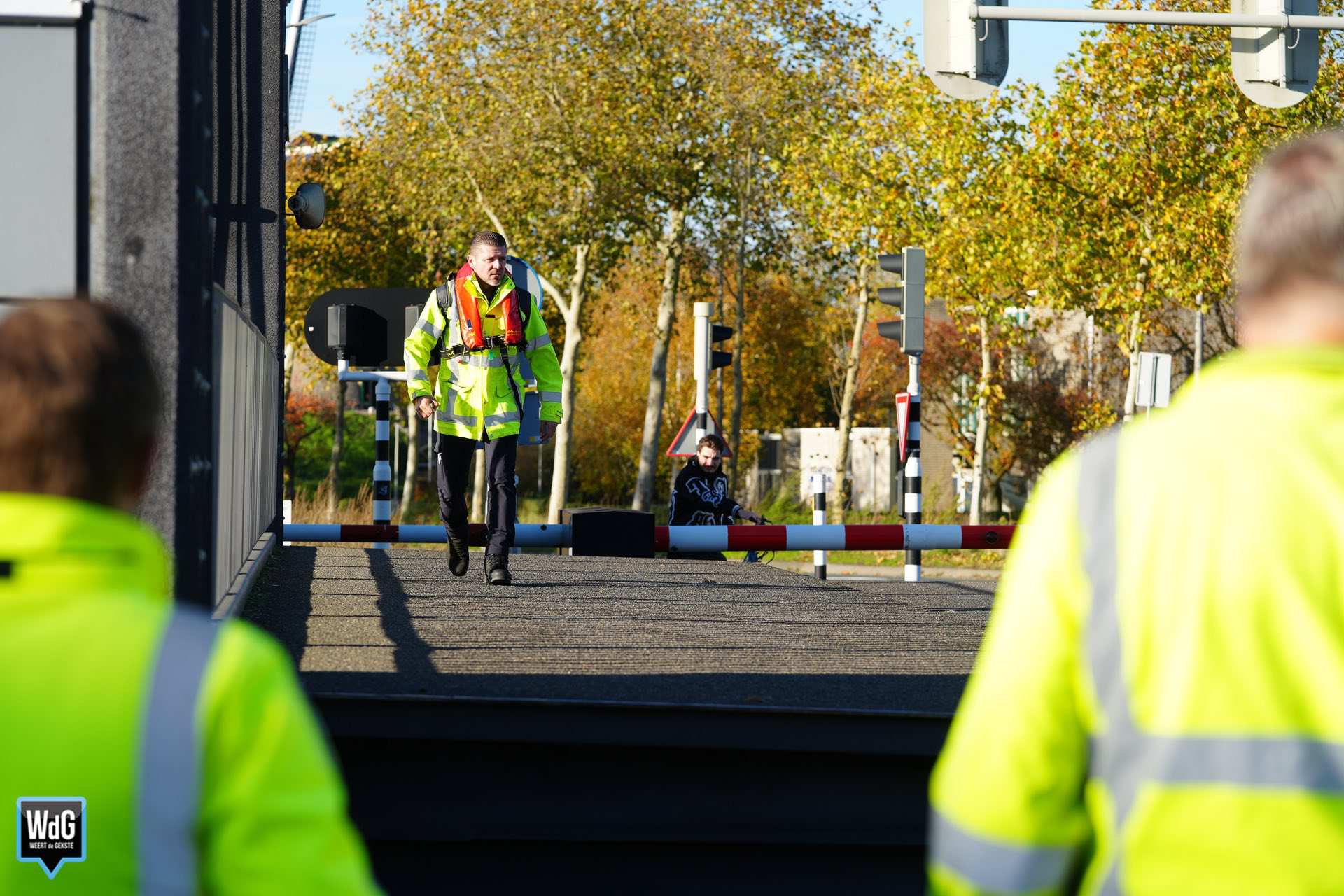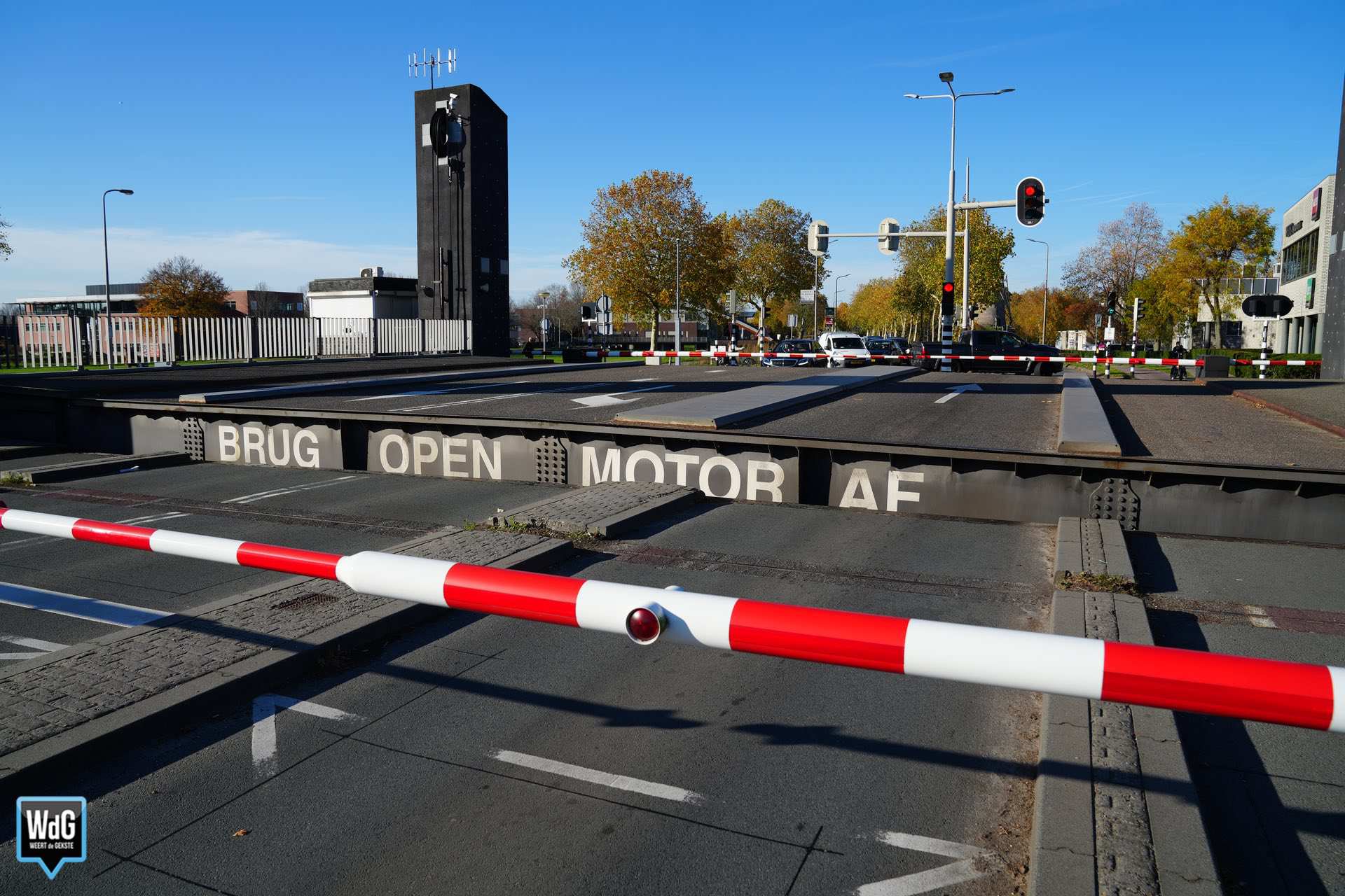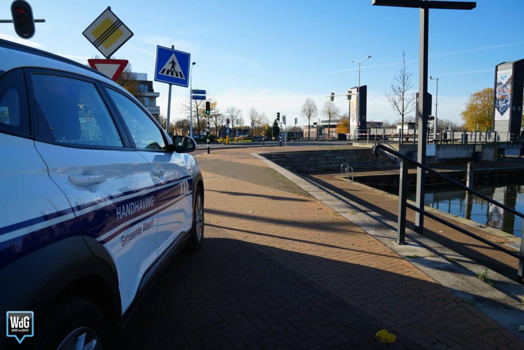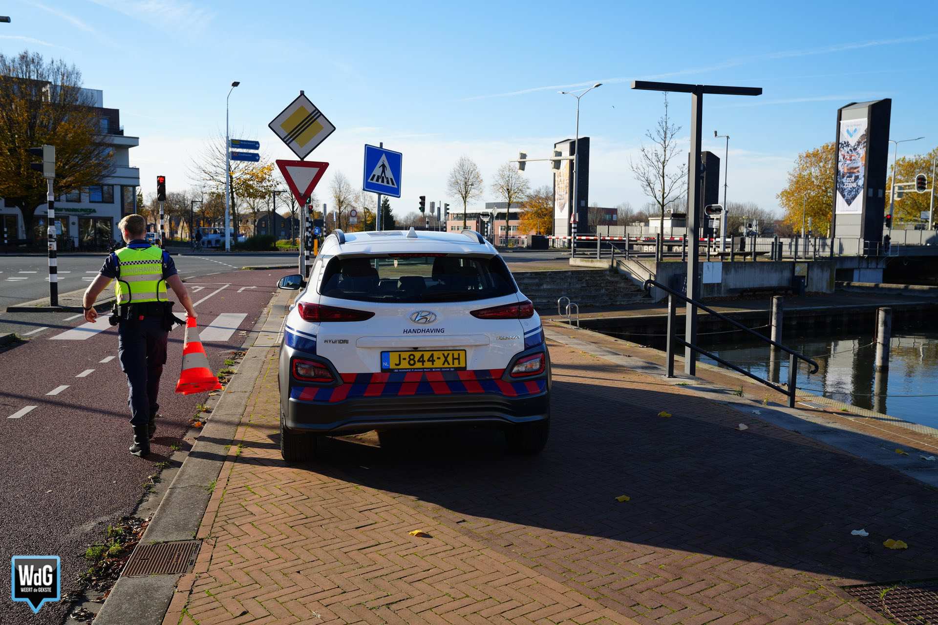 Rijkswaterstaat liet de brug op afstand zakken, maar die kwam daarna vast te zitten en hangt nu scheef. Medewerkers van Handhaving zijn aanwezig om het verkeer te regelen. Ook een medewerker van Rijkswaterstaat is ter plaatse.