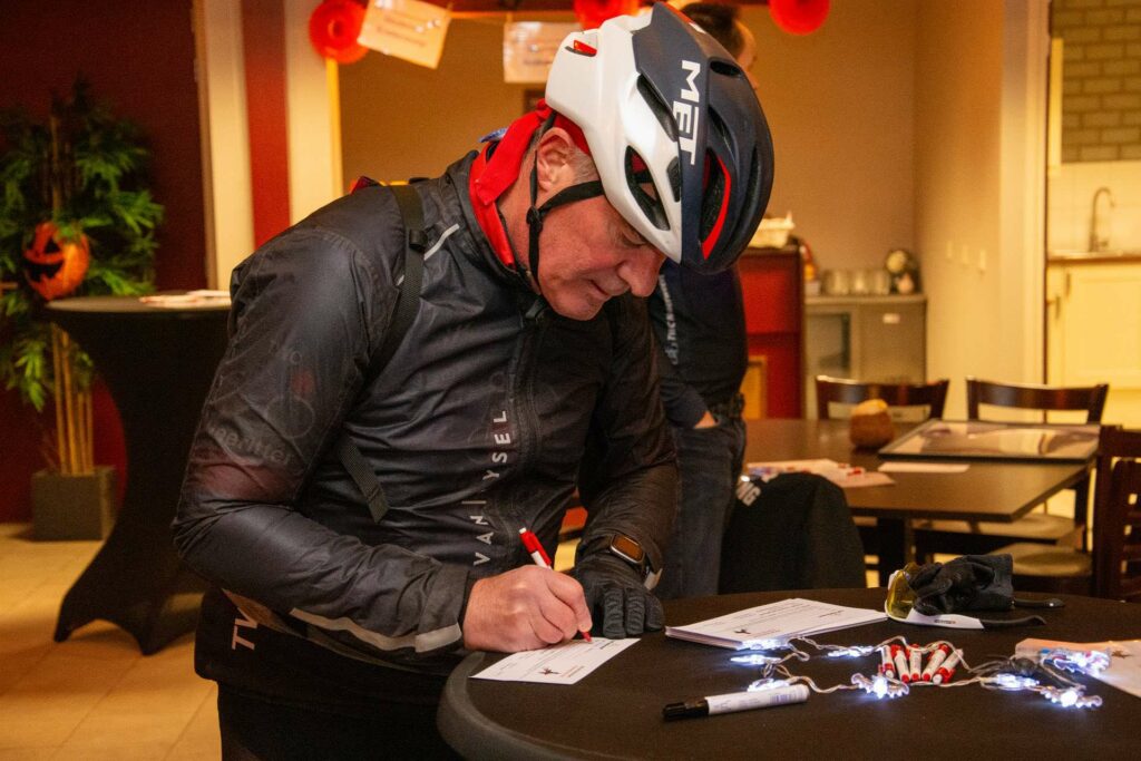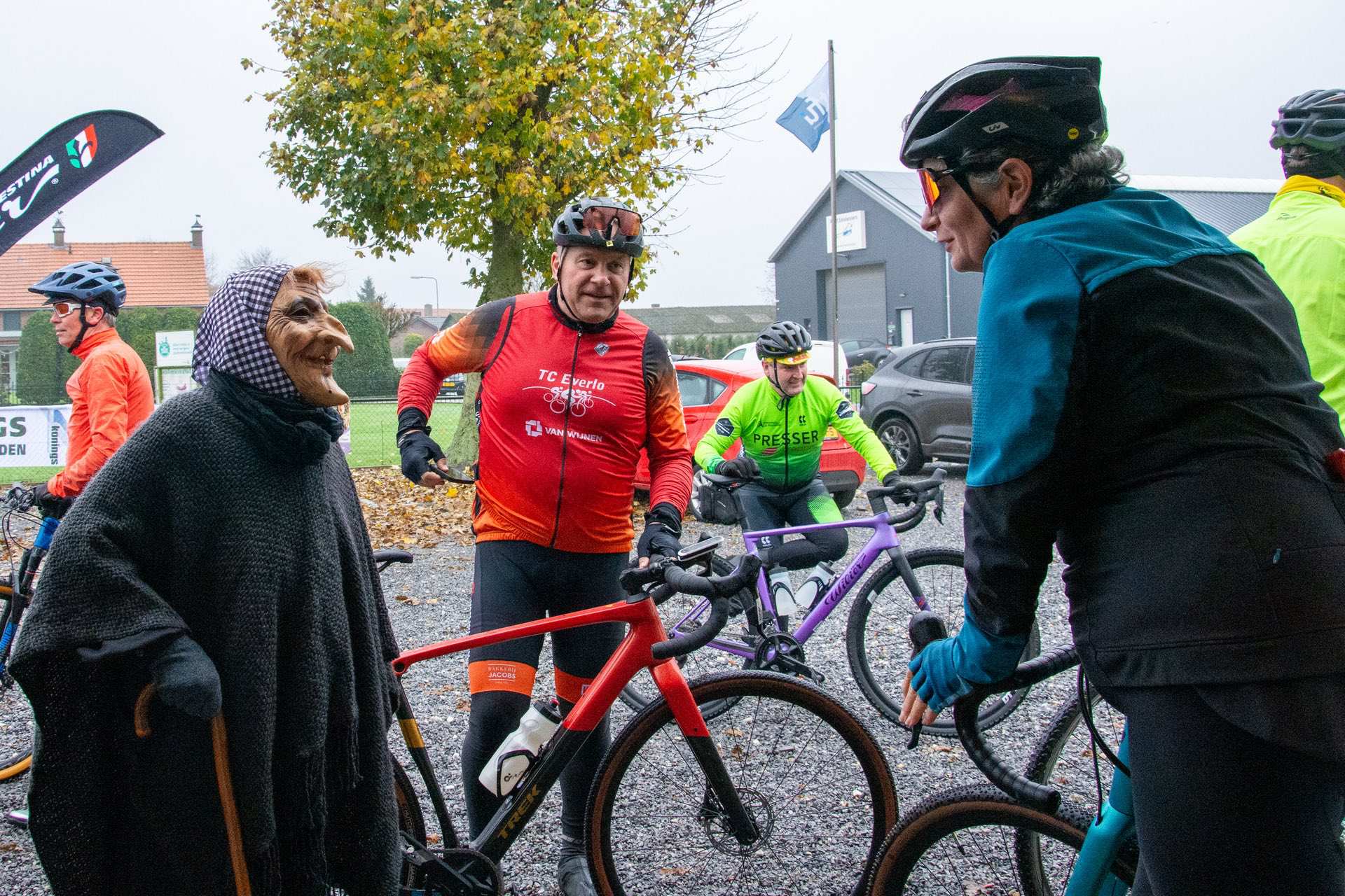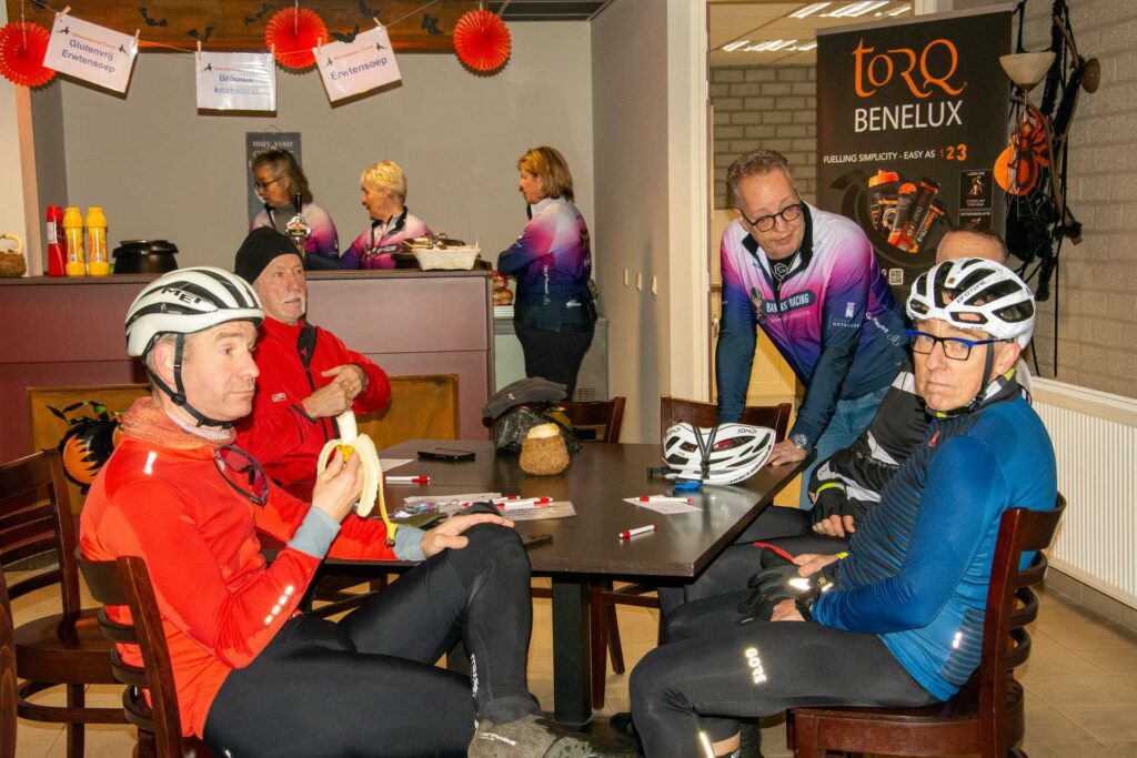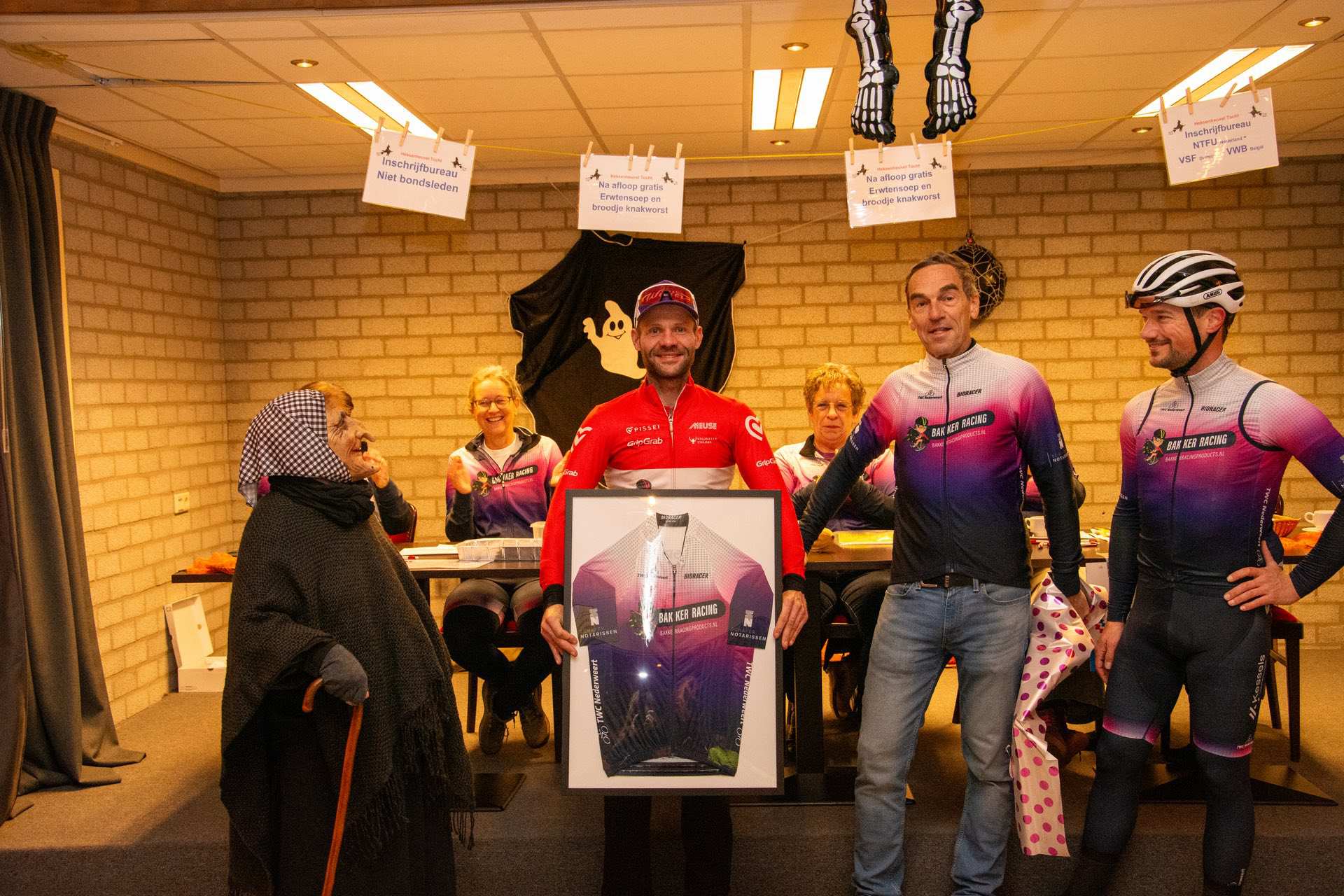 Heks Aldje Hendrikx en Erwin Bakker, de Nederlands kampioen MTB 2025 Masters 40+ en winnaar van de bronzen medaille bij het WK Gravel Masters 40+ van afgelopen zomer, toeterden de fietsers weg. Voorzitter Kees Helderman stond stil bij de prestaties van Erwin Bakker en overhandigde hem het ingelijste nieuwe wielershirt van TWC Nederweert.