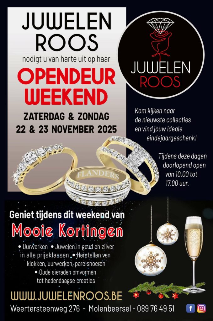 Wie nieuwsgierig is geworden kan vrijblijvend een kijkje nemen bij Juwelen Roos tijdens het opendeur weekend op 22 en 23 november. De deuren aan de Weertersteenweg 276 in Molenbeersel zijn dan van 10.00 tot 17.00 uur geopend.