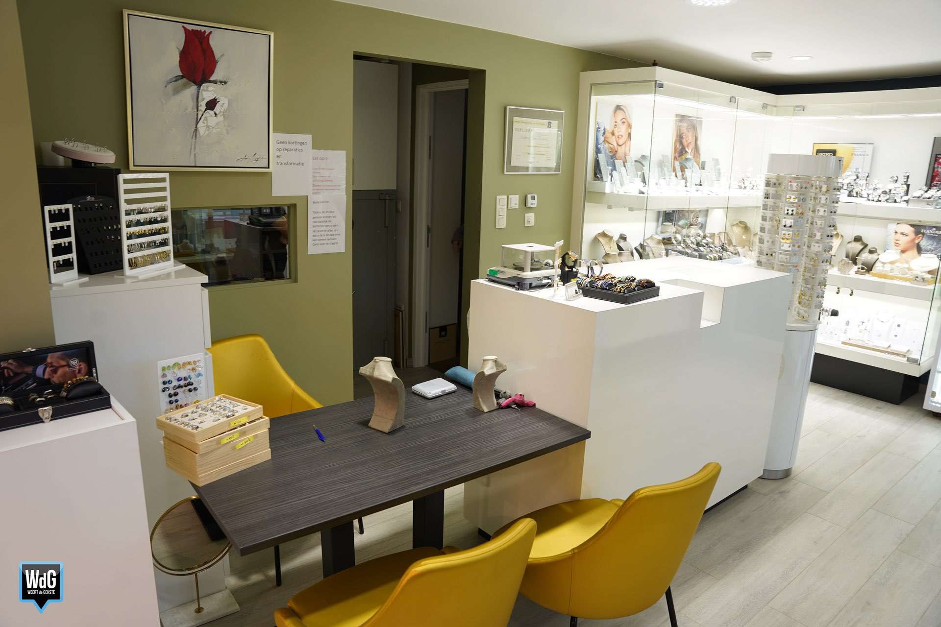 Een ouderwetse juwelier in een modern jasje, zo noemt Roos zichzelf. Ze verkoopt ook zilveren en vergulden sieraden, maar presenteert het liefst de betere juwelen van bijvoorbeeld 18 karaat goud met diamanten. “Een collega van mij was laatst enthousiast over een product van een bepaald merk. Ze vertelde dat als het kapot ging, je het gewoon terug kon sturen en een nieuwe zou ontvangen. Maar daar sta ik dus niet achter: ik wil niet dat iets kapotgaat. Je moet een juweel natuurlijk dragen zoals je het hoort te dragen en dan hoort het in principe niet stuk te gaan. Van het merk waar deze collega het over had bleken de juwelen dus wel regelmatig stuk te gaan – dat is voor mij een reden om verder te zoeken naar een product dat degelijker is en waar ik wél voor 100% achter kan staan.”