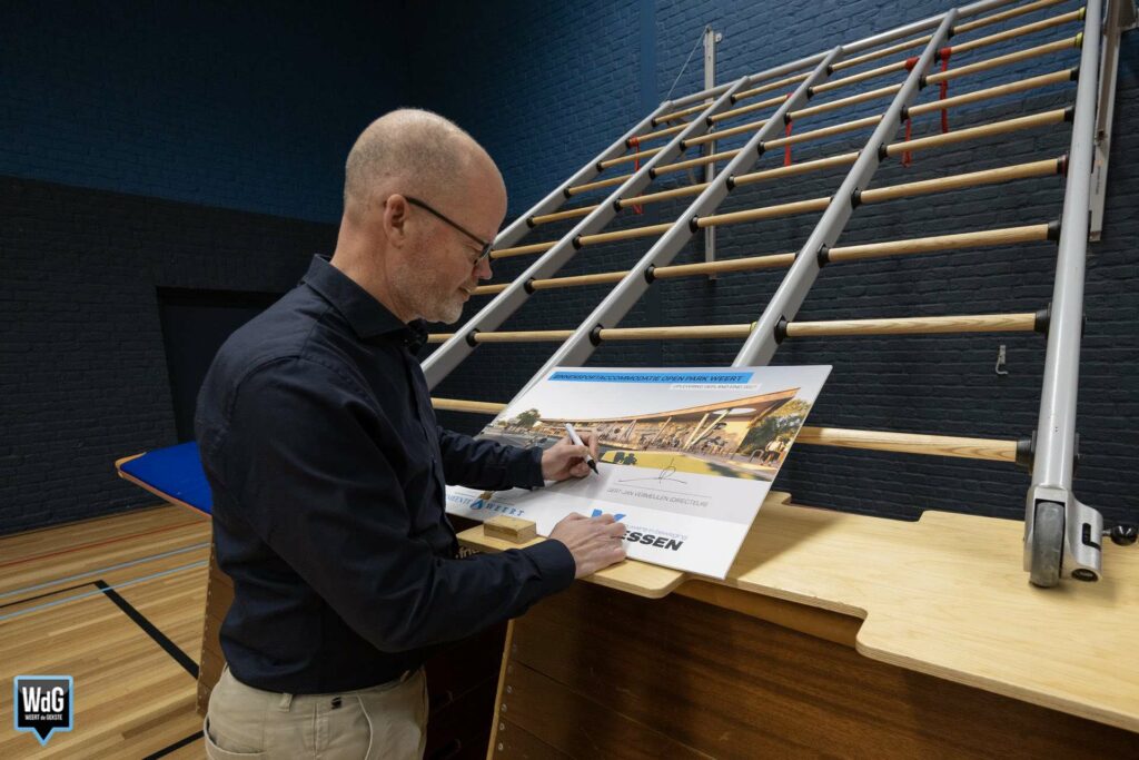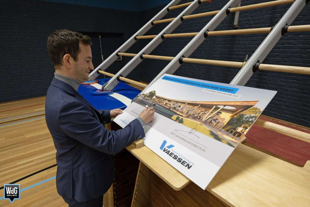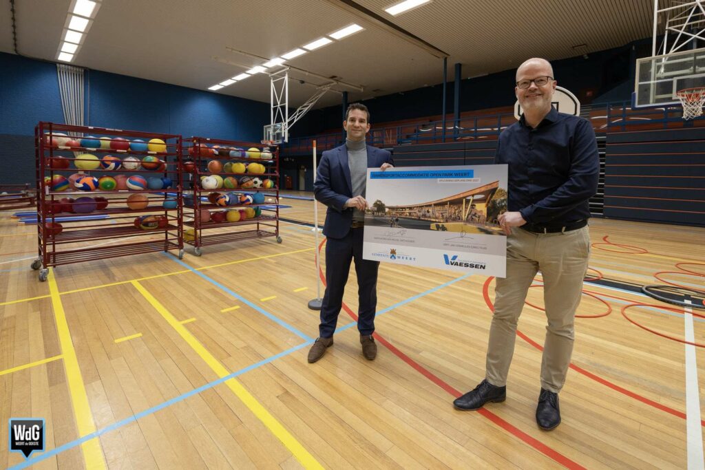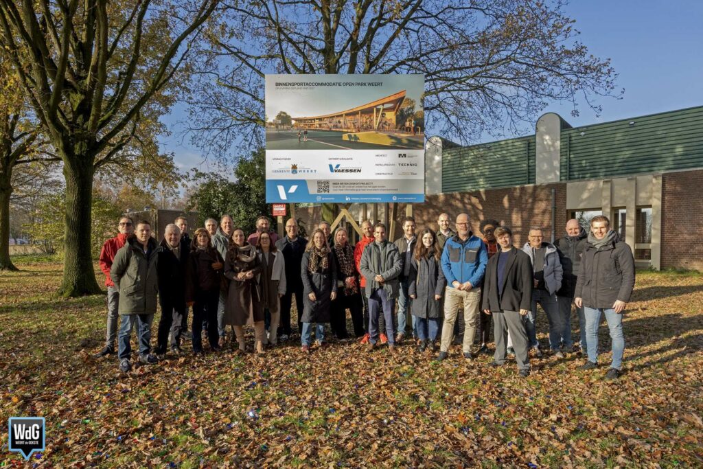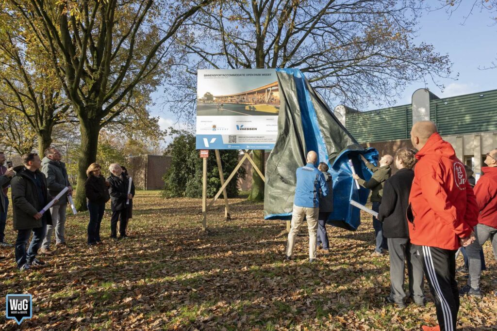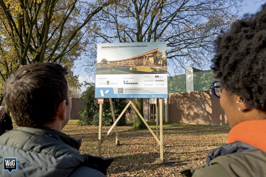 Het nieuwe bouwbord dat woensdag is onthuld op Open Park Weert (ook nog bekend als Sportpark Boshoven), laat zien hoe de toekomstige binnensportaccommodatie eruit komt te zien. Het winnende ontwerp is gemaakt door bouwbedrijf Vaessen. Het plan bestaat uit twee sportzalen, een turnhal, een jongerencentrum en diverse facilitaire en horecavoorzieningen. De accommodatie moet eind 2027 klaar zijn.