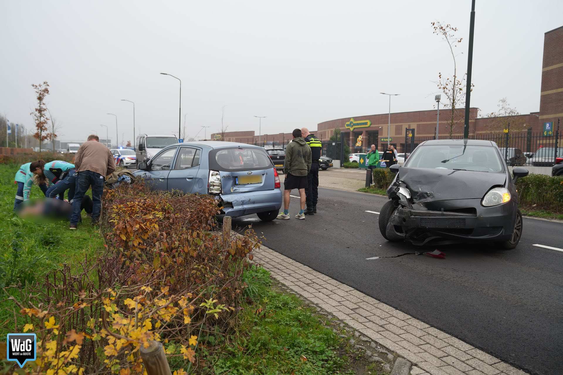 De vrouw raakte gewond en is naar het ziekenhuis in Weert gebracht. De bestuurders van beide auto’s kwamen met de schrik vrij. Wel liepen hun voertuigen flinke schade op.