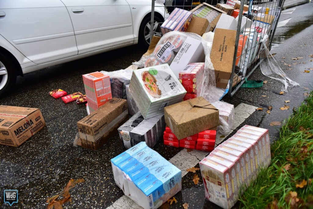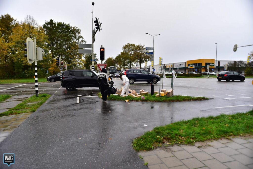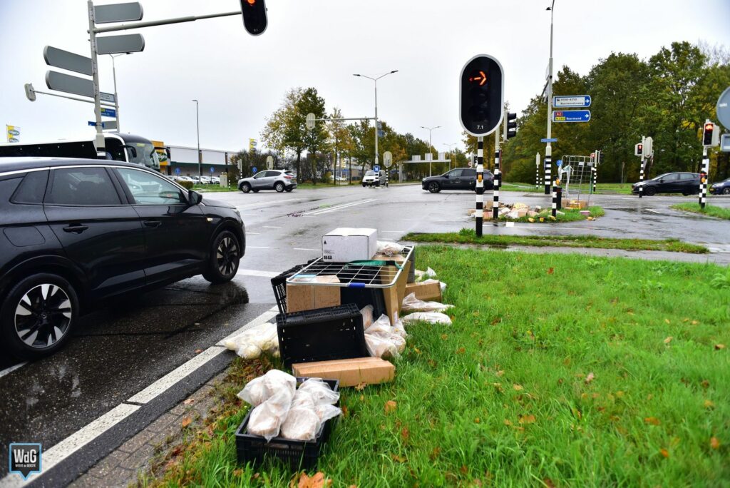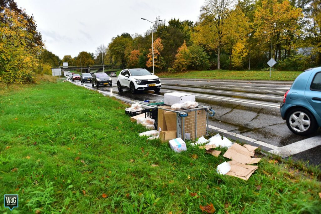 Update – Zaterdagmiddag is een vrachtwagen op meerdere plekken in Weert zijn vracht verloren. Langs de Ringbaan-Zuid en Ringbaan-Oost lagen transporttrolleys verspreid op en langs de weg. De trolleys bevatten onder andere dozen frikandellen, boter, frituurvet en kroketten.