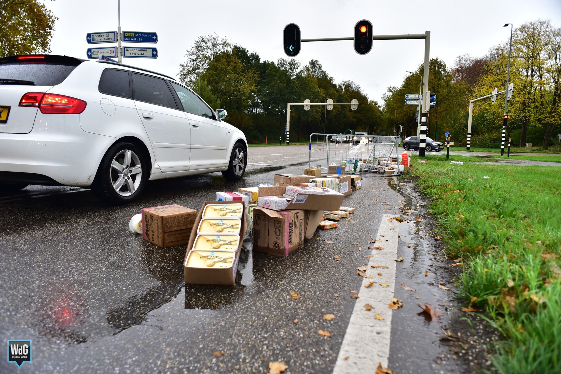 Update – Zaterdagmiddag is een vrachtwagen op meerdere plekken in Weert zijn vracht verloren. Langs de Ringbaan-Zuid en Ringbaan-Oost lagen transporttrolleys verspreid op en langs de weg. De trolleys bevatten onder andere dozen frikandellen, boter, frituurvet en kroketten.