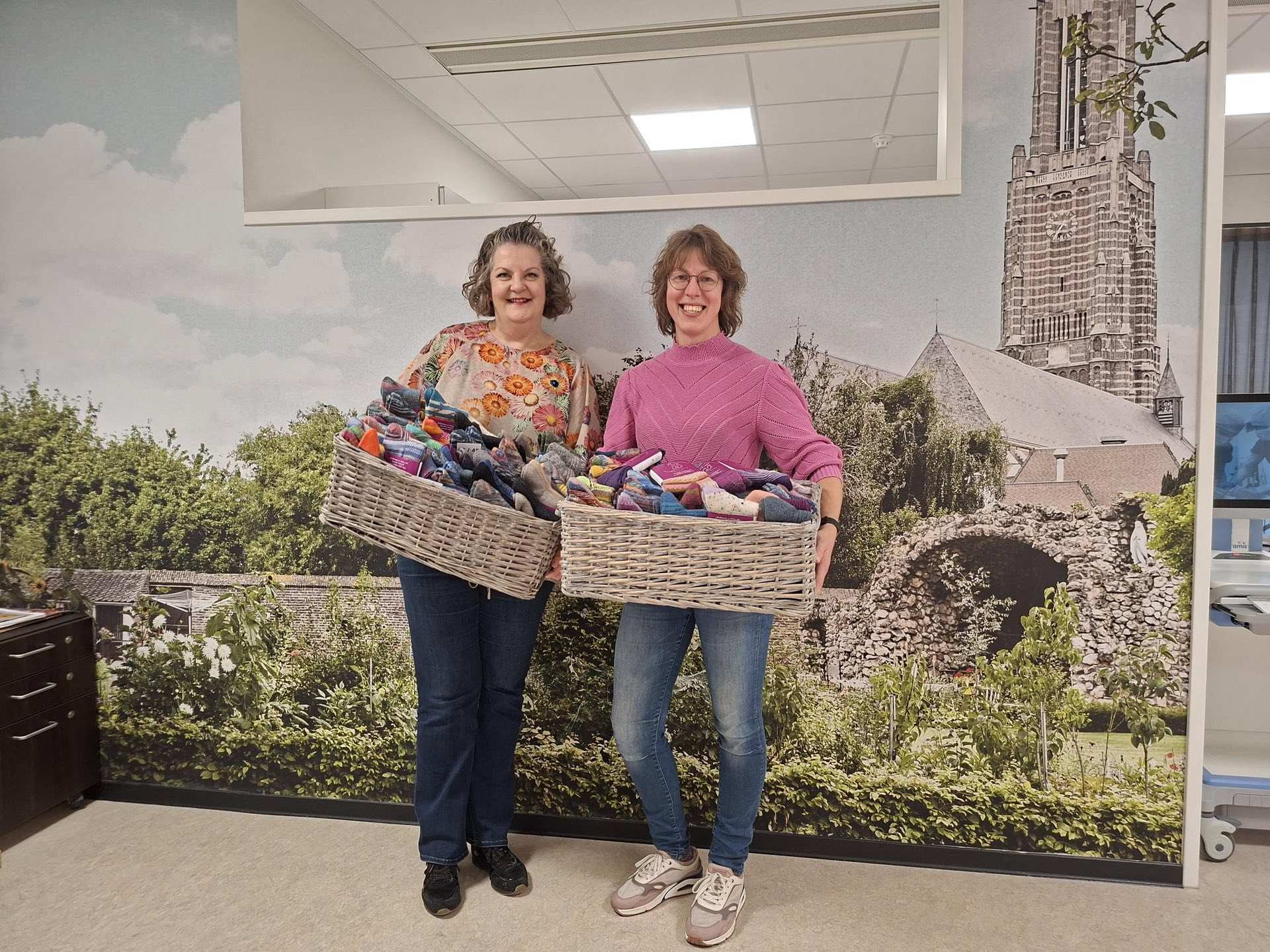 Nederweert/Weert – Afgelopen maandag hebben Yvonne Wulms (Madebyvonne) uit Weert en Anja Stienen (Tante Tuttebol) uit Nederweert namens de Paarse Sokken Actie 190 paar handgebreide sokken geschonken aan patiënten van de oncologische dagbehandeling van het SJG Weert.