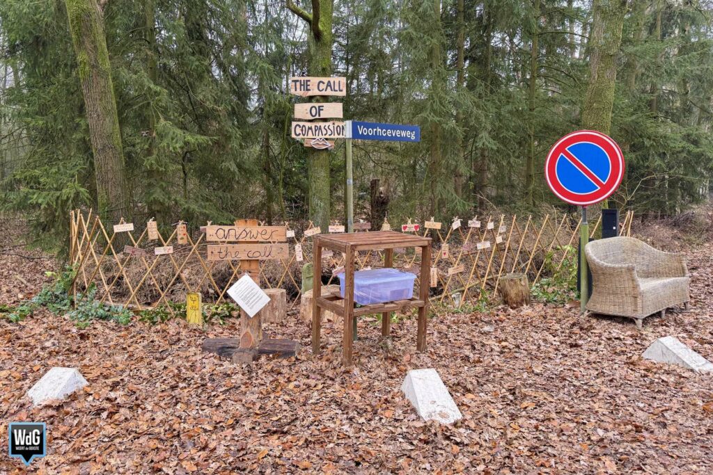 Het idee is simpel. Bezoekers kunnen plaatsnemen op een boomstam en vijf minuten stilte nemen. Daarna stellen zij zichzelf één vraag: wat kan ik doen om meer compassie te tonen? Het antwoord mag worden opgeschreven op een stukje hout en toegevoegd aan de wand. Zo groeit de plek langzaam verder.