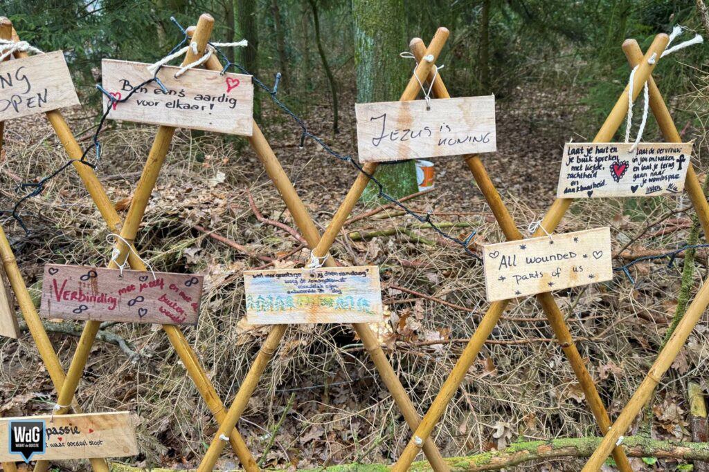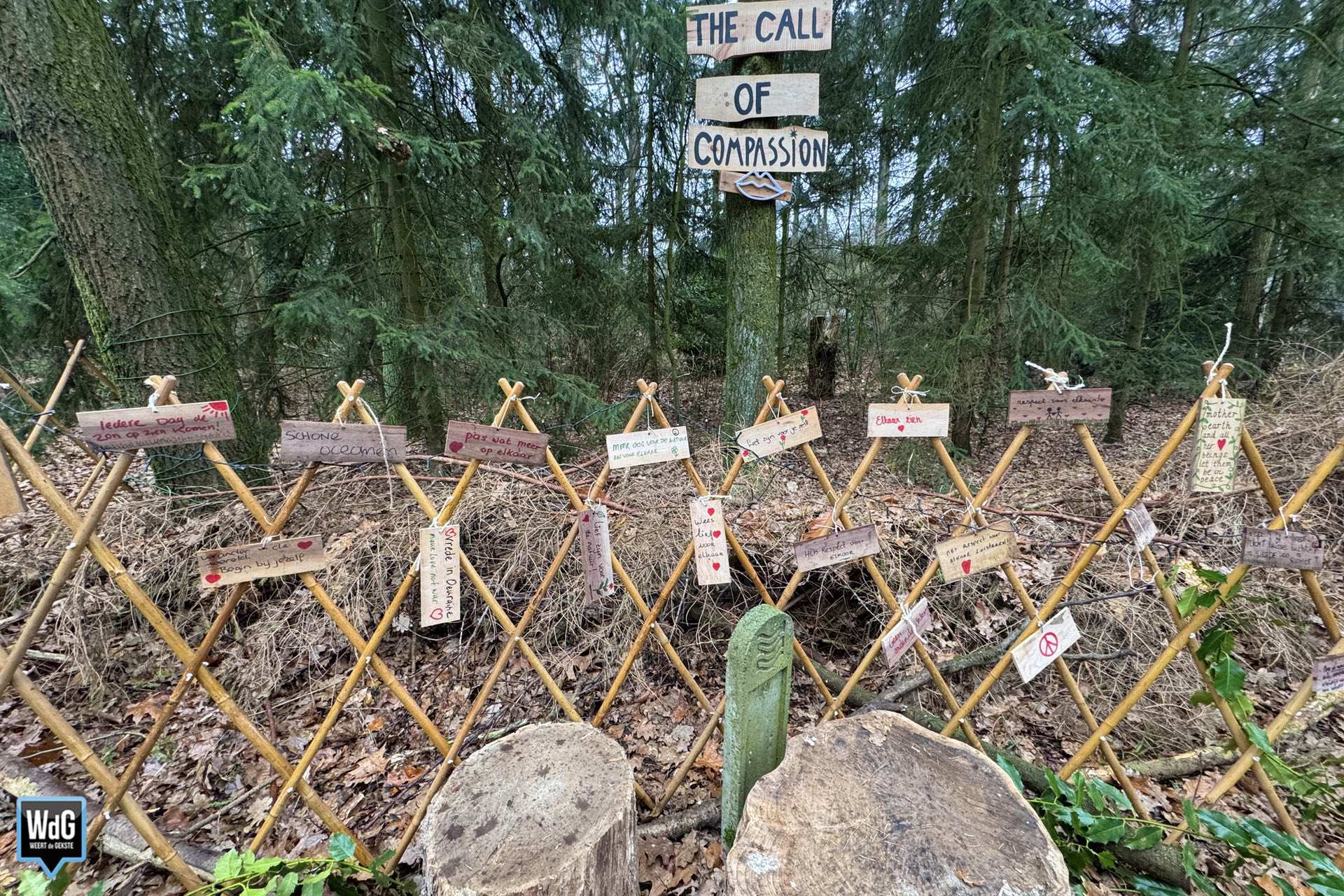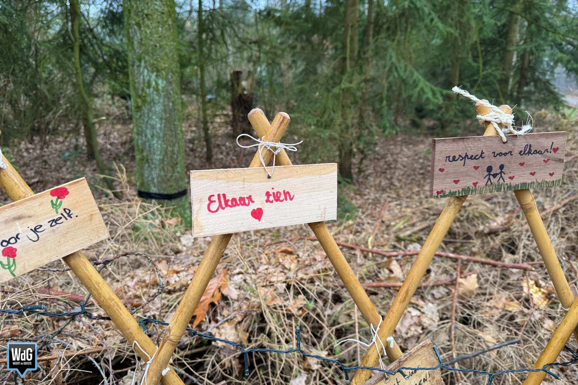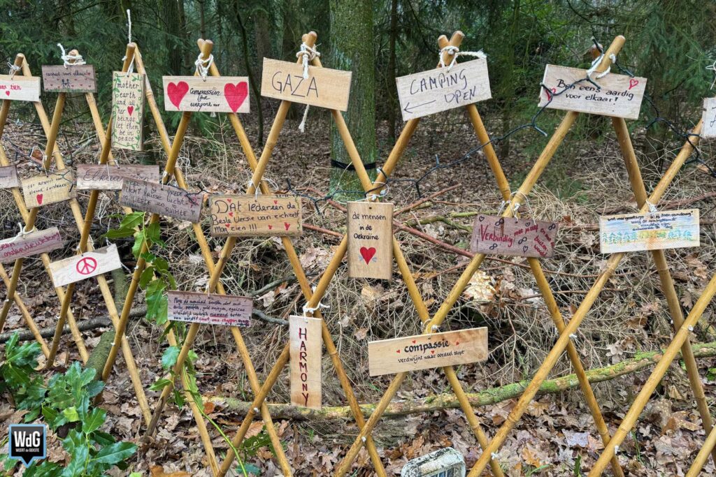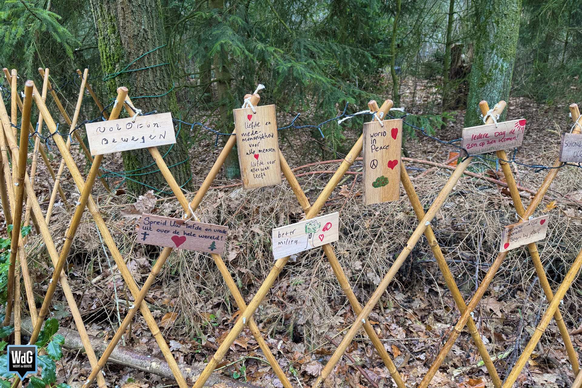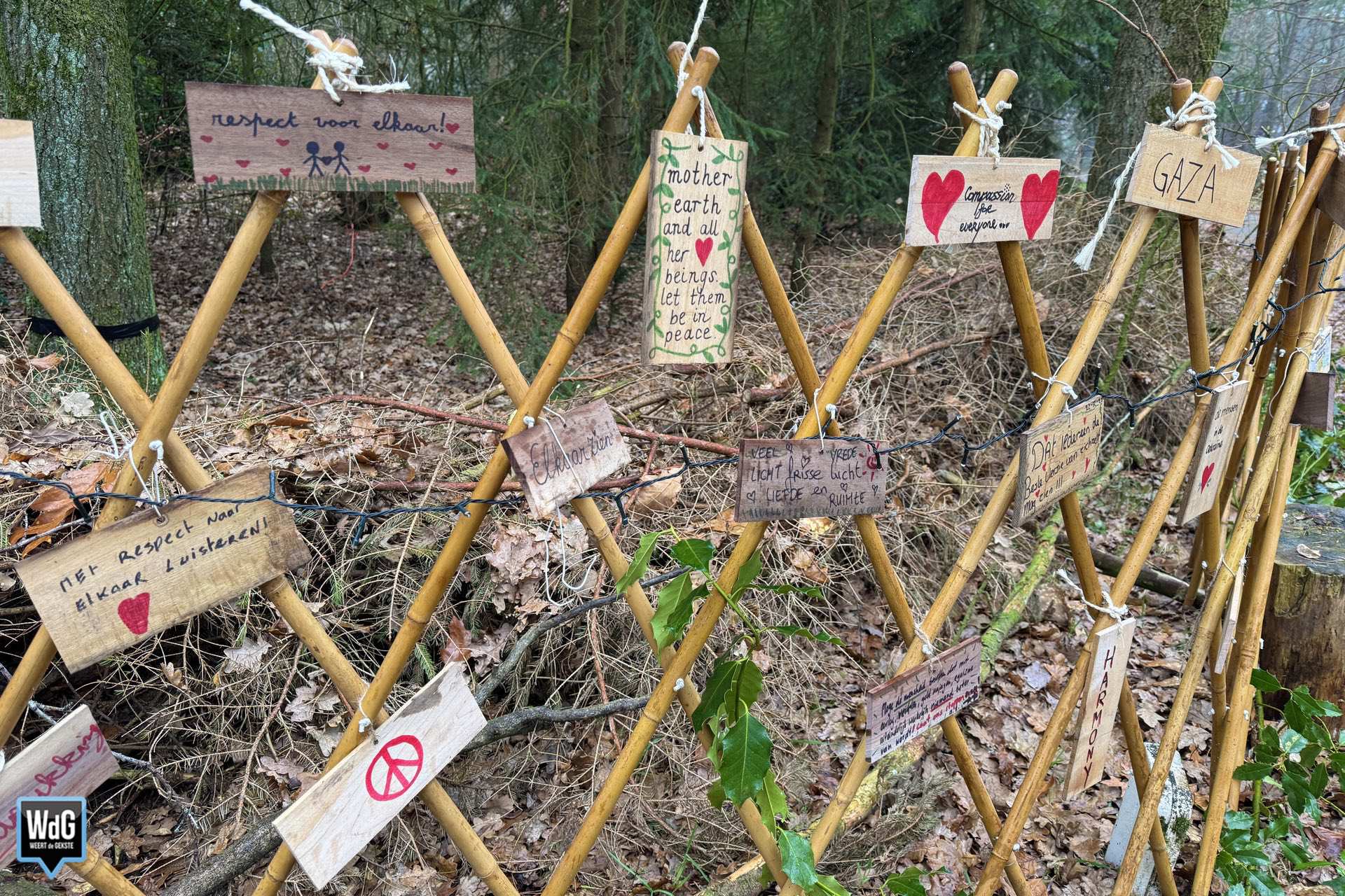 Tussen de bomen staat een eenvoudige bamboewand. Daaraan hangen tientallen houten bordjes met korte teksten en tekeningen. Deze zijn achtergelaten door bezoekers. Op de bordjes staan woorden als respect, liefde, vrede en verbinding. Sommige mensen schrijven iets voor zichzelf, anderen denken aan de wereld om hen heen of aan mensen die het moeilijk hebben.