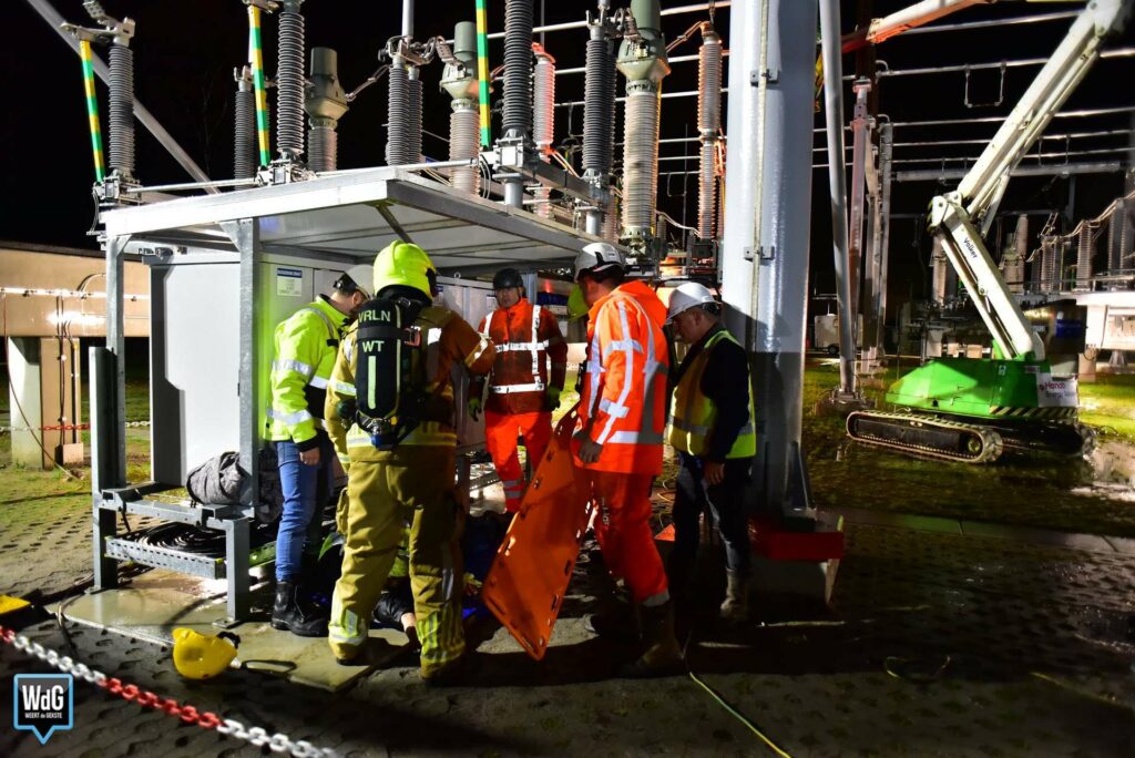 Het nagespeelde scenario was spannend. Tijdens werkzaamheden aan een installatie van 150.000 volt ging het mis. Door een verkeerde bedieningshandeling ontstond een gevaarlijke situatie. Daardoor kwam één persoon vast te zitten boven in een hoogwerker. Tegelijkertijd lag een ander slachtoffer gewond op de grond.