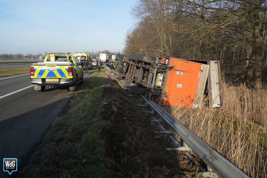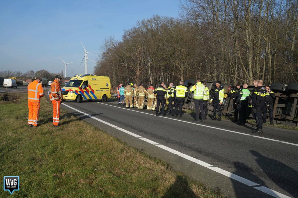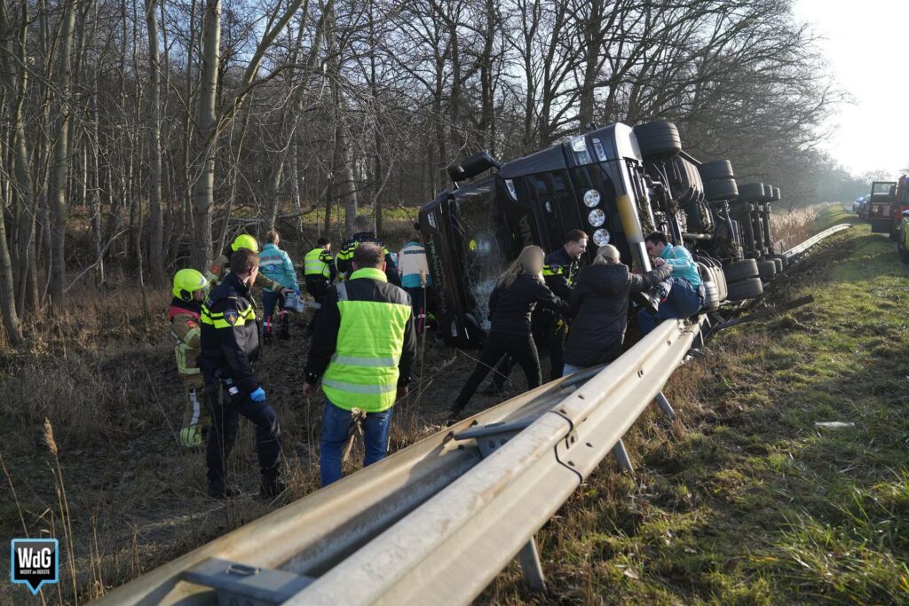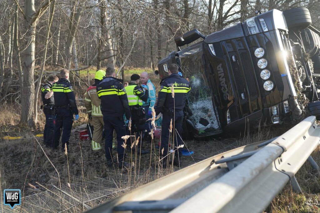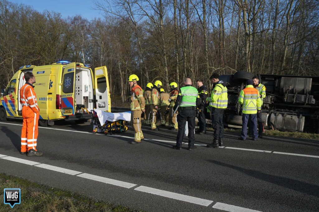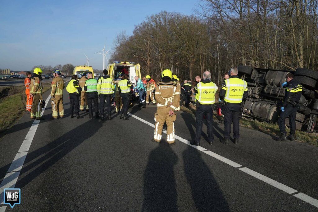 De vrachtwagen kwam via de vangrail op zijn zijkant in de berm terecht. De chauffeur raakte daarbij zwaargewond. Voorbijgangers verleenden eerste hulp in afwachting van de hulpdiensten. Ook een traumahelikopter werd ingezet.