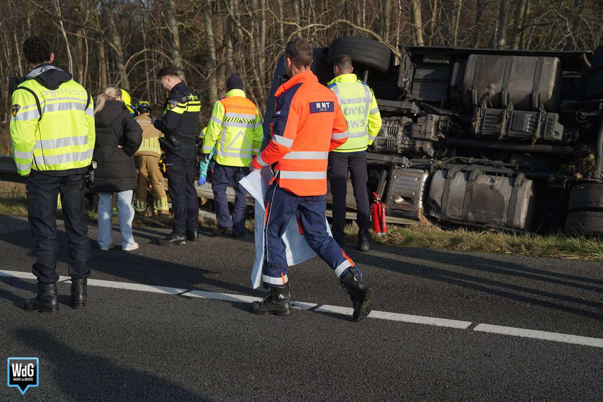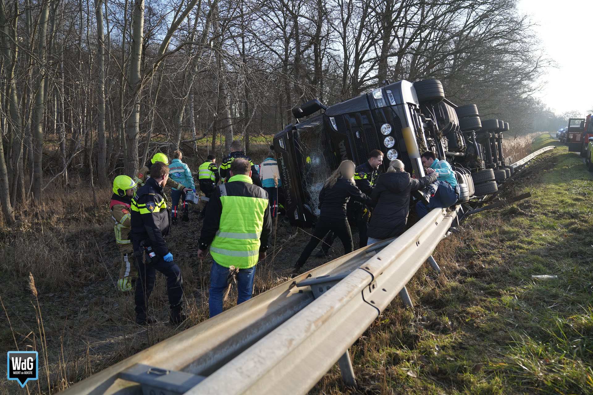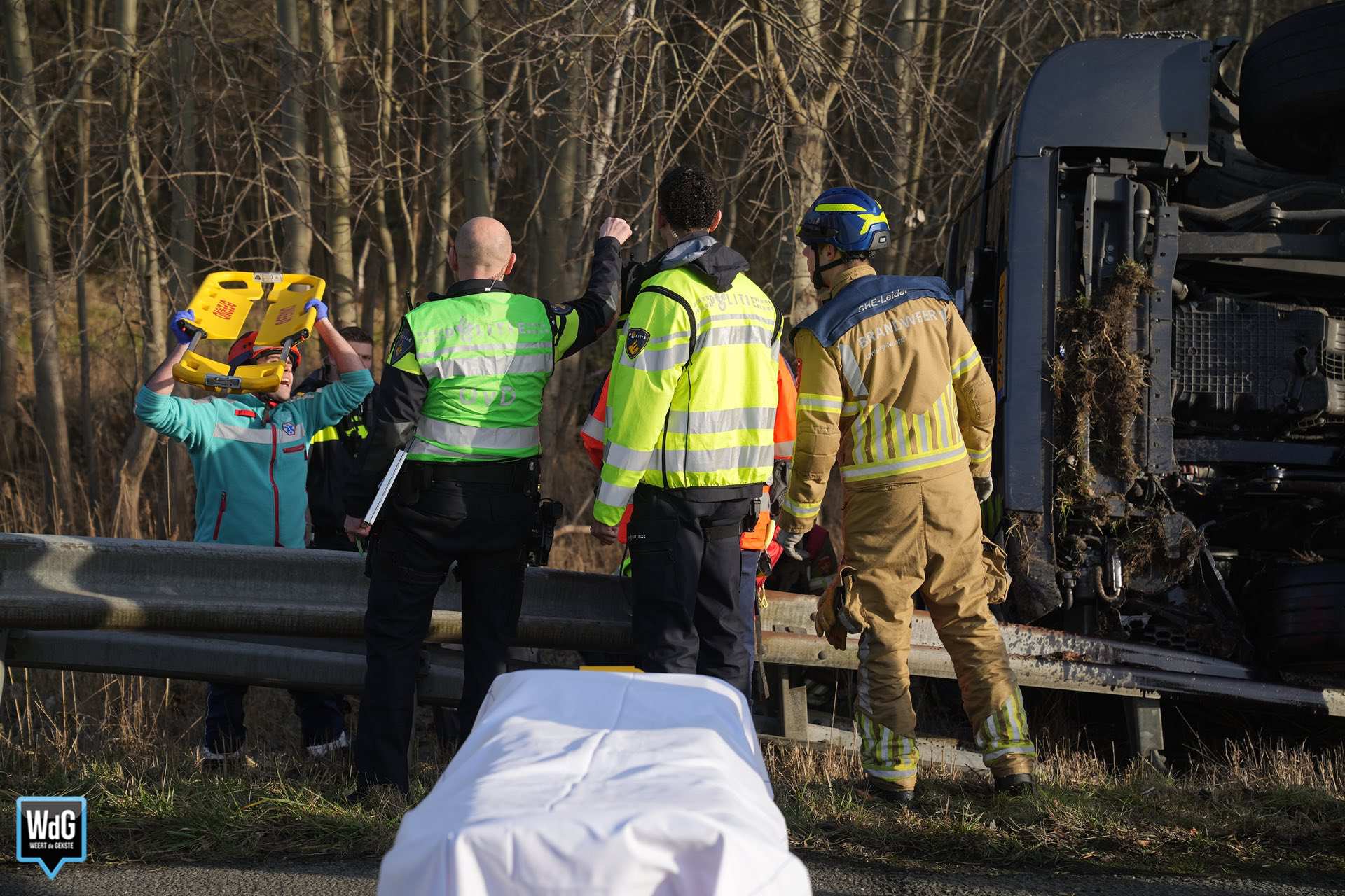 De vrachtwagen kwam via de vangrail op zijn zijkant in de berm terecht. De chauffeur raakte daarbij zwaargewond. Voorbijgangers verleenden eerste hulp in afwachting van de hulpdiensten. Ook een traumahelikopter werd ingezet.