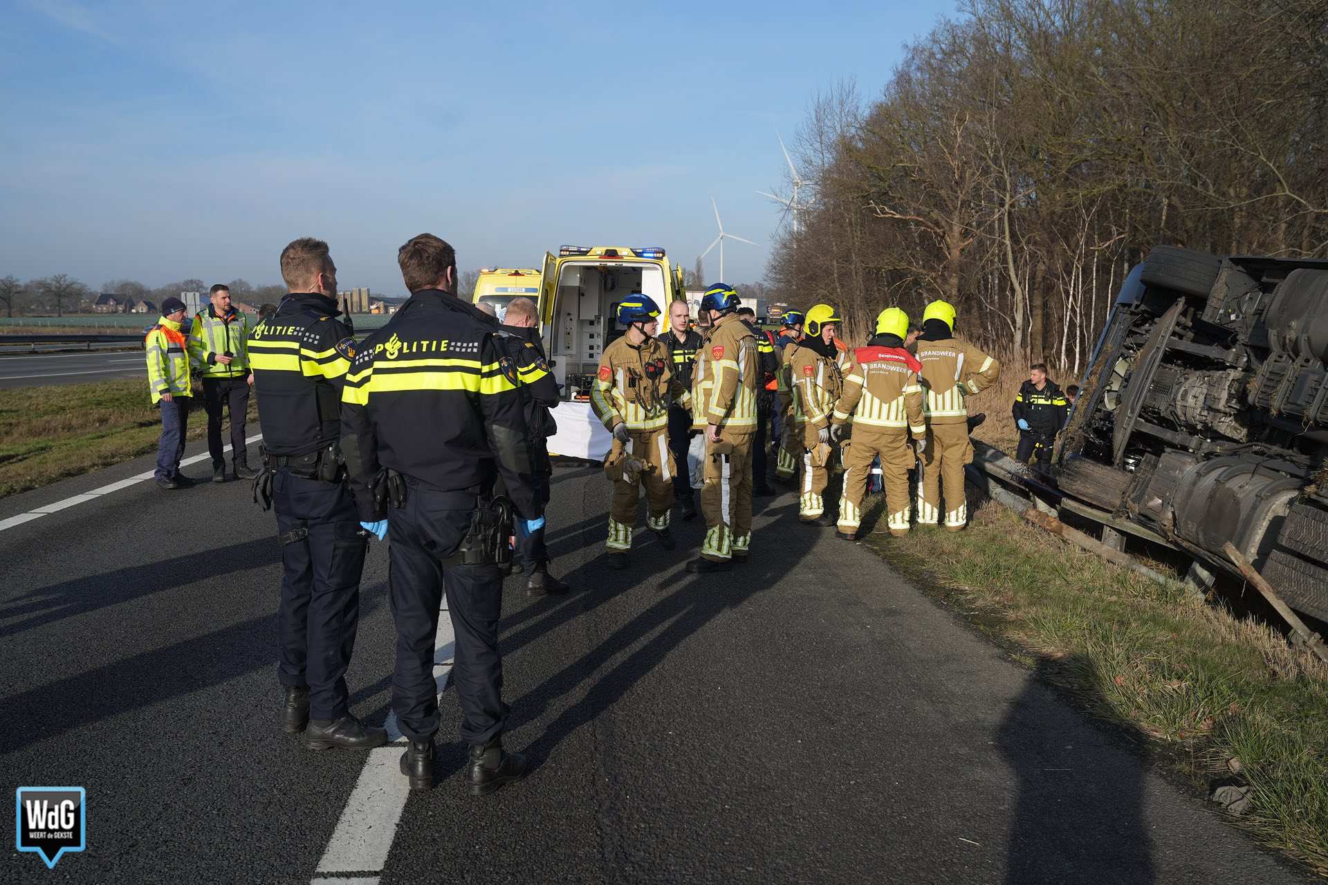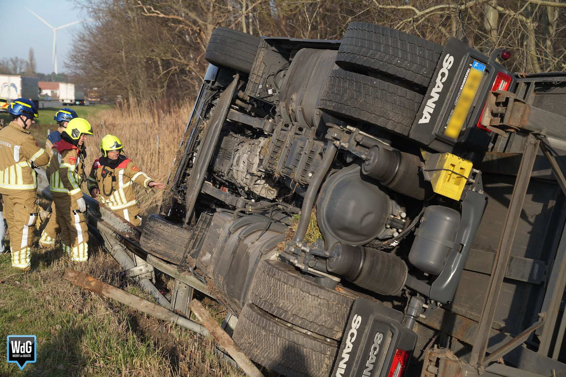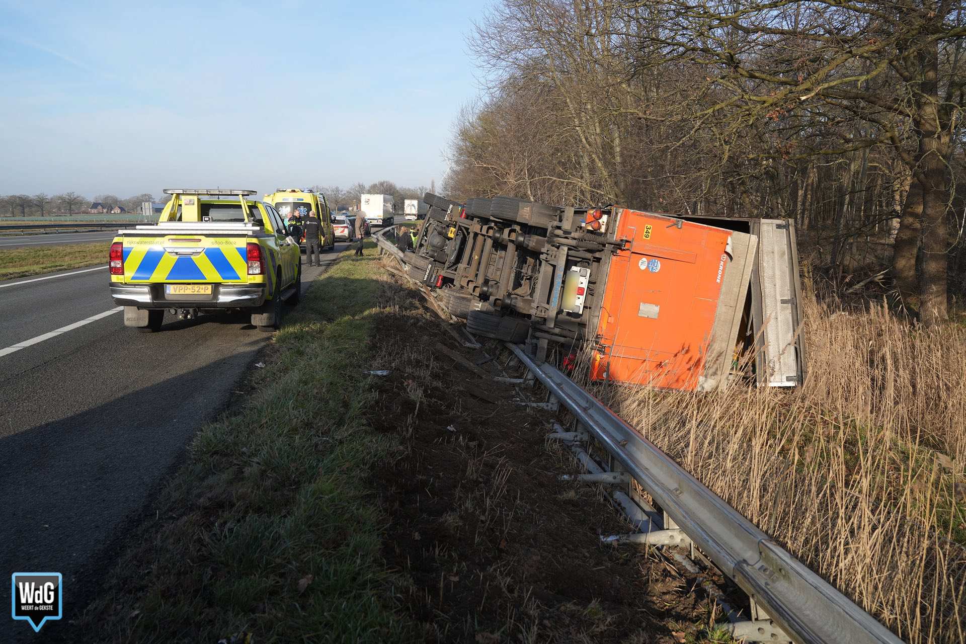 De vrachtwagen kwam via de vangrail op zijn zijkant in de berm terecht. De chauffeur raakte daarbij zwaargewond. Voorbijgangers verleenden eerste hulp in afwachting van de hulpdiensten. Ook een traumahelikopter werd ingezet.