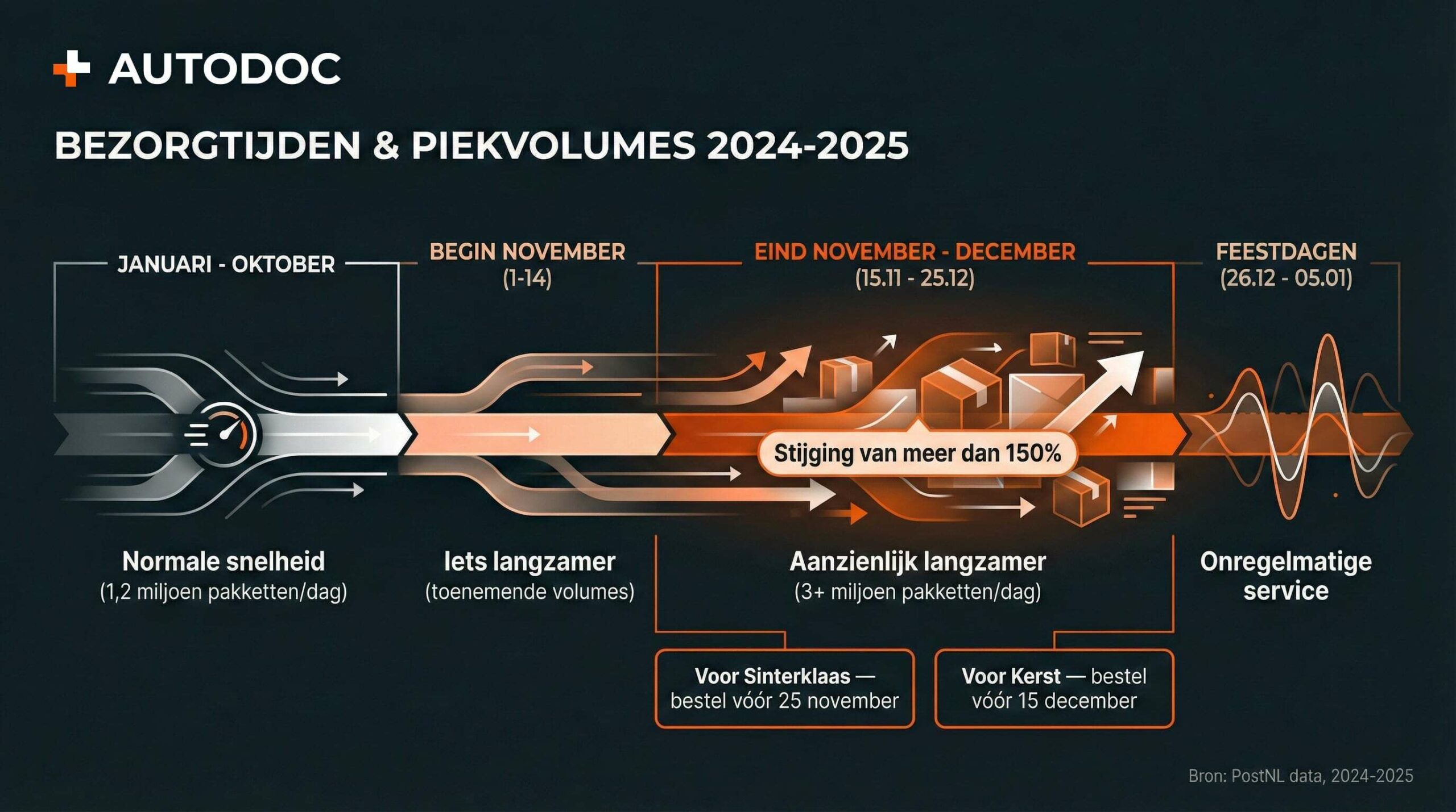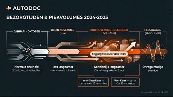 De boosdoener? Seizoenspieken. PostNL bereidt zich voor op piekdagen met ruim 3 miljoen pakketten per dag, terwijl er normaal 1,2 miljoen worden verwerkt, een stijging van meer dan 150% tijdens Black Friday en Sinterklaas. Deze enorme volumes zorgen samen met Kerst voor ongekende drukte.