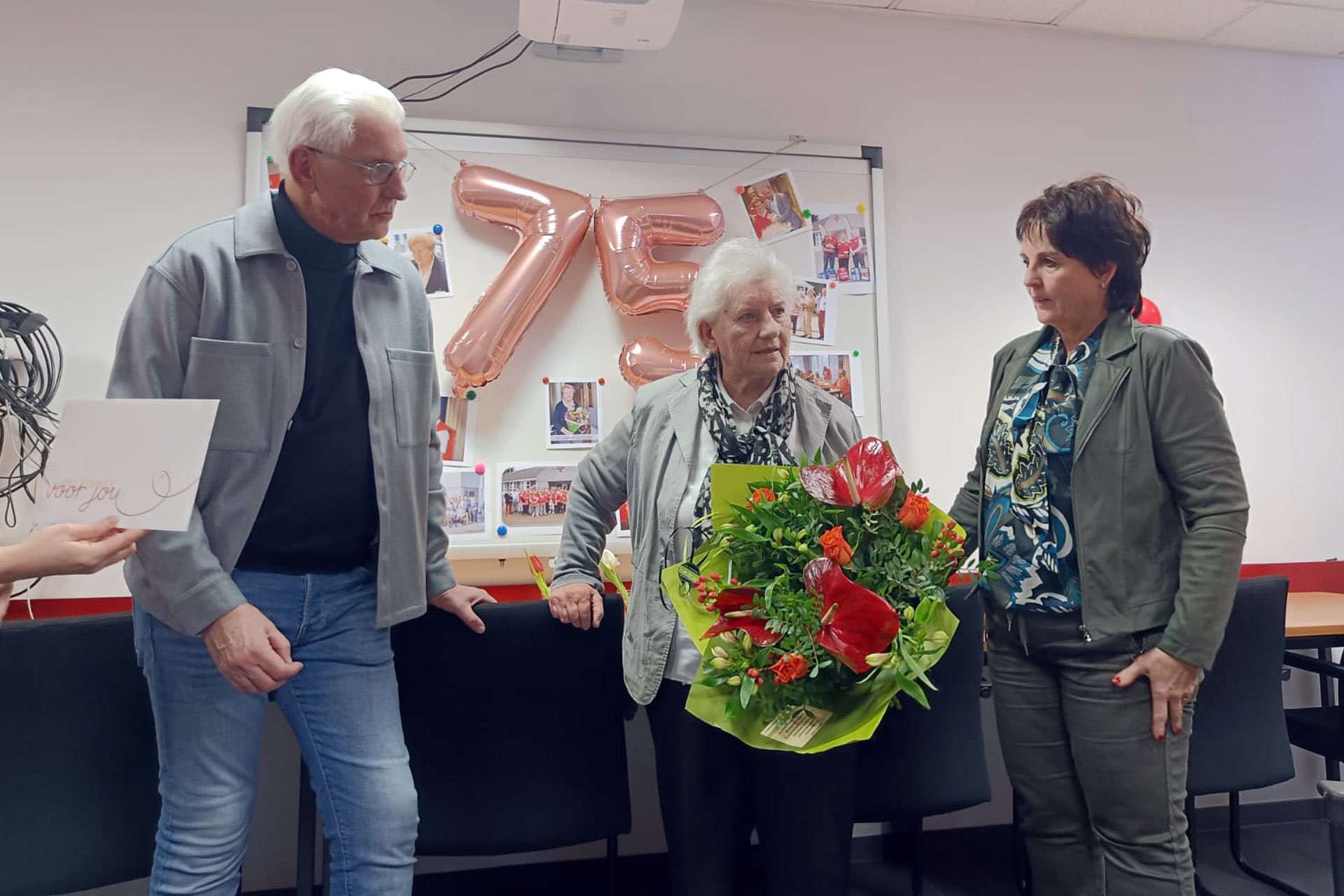 Het Rode Kruis in Weert heeft op vrijdag 23 januari Tiny Wullems-Peerlings gehuldigd voor haar 75-jarig lidmaatschap van de hulporganisatie. Tijdens de feestelijke bijeenkomst ontving de jubilaris bloemen en een speech van haar collega-vrijwilligers.