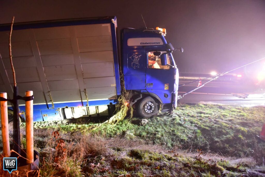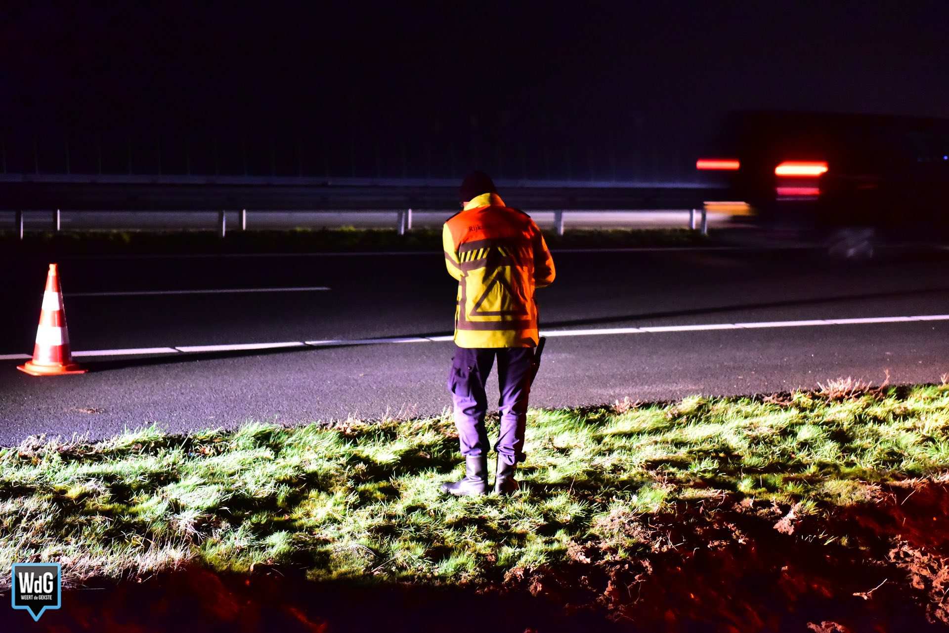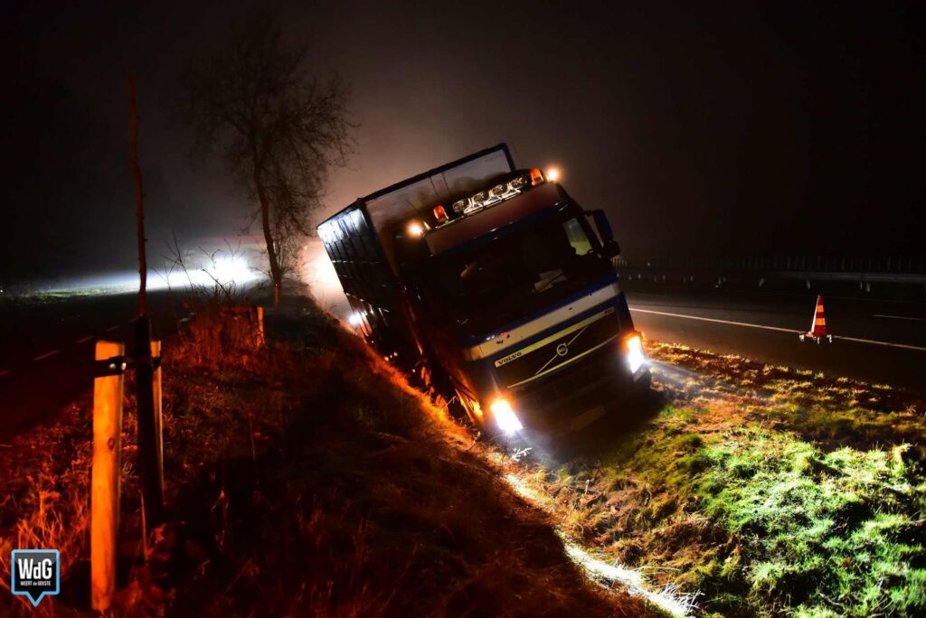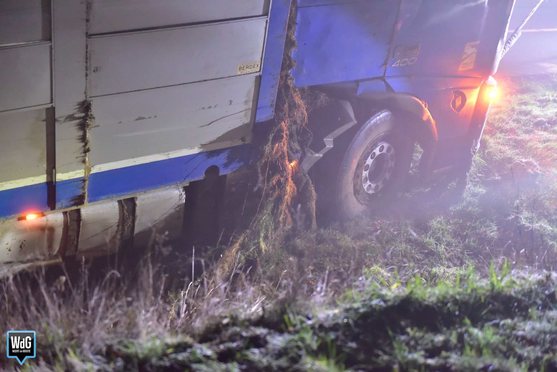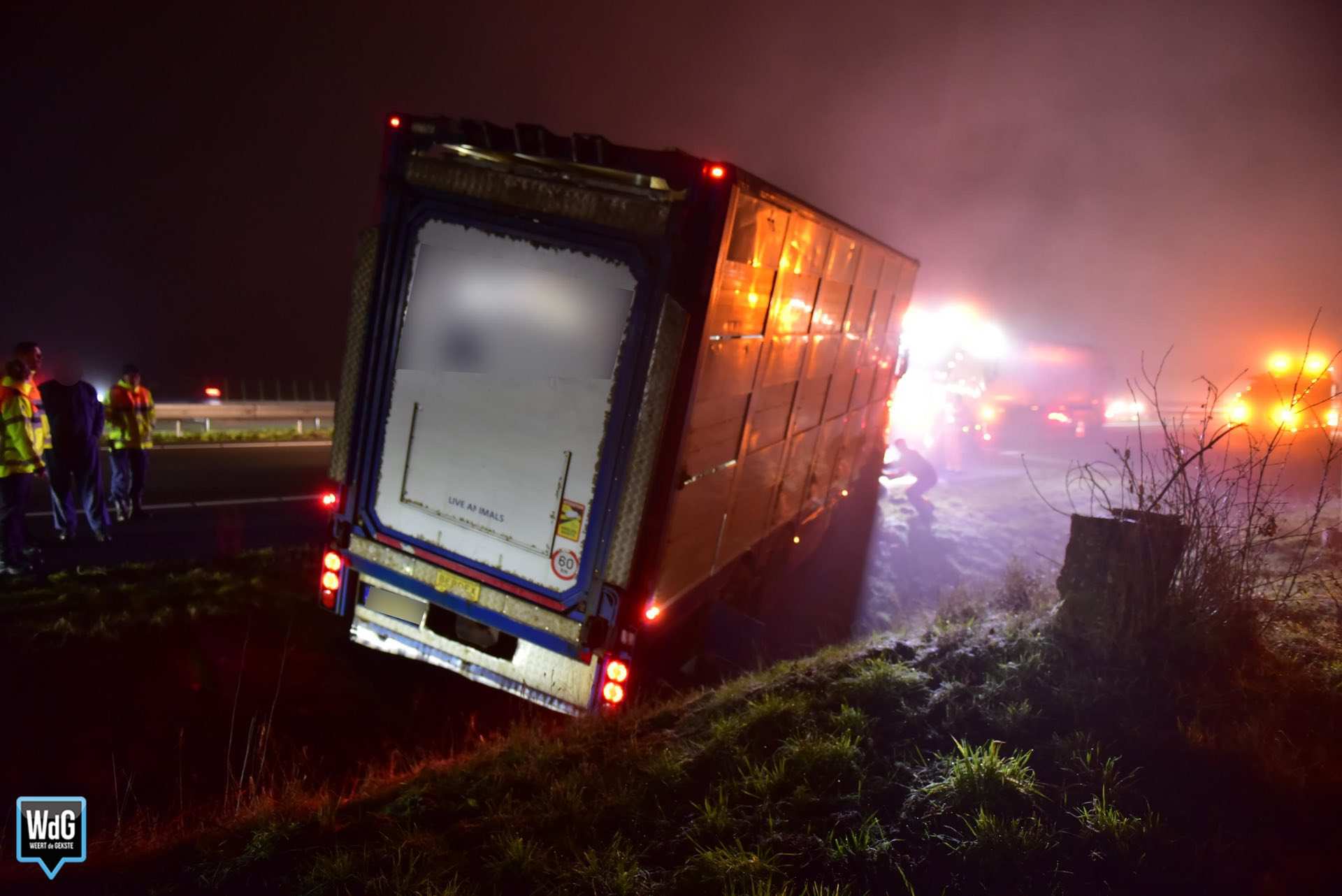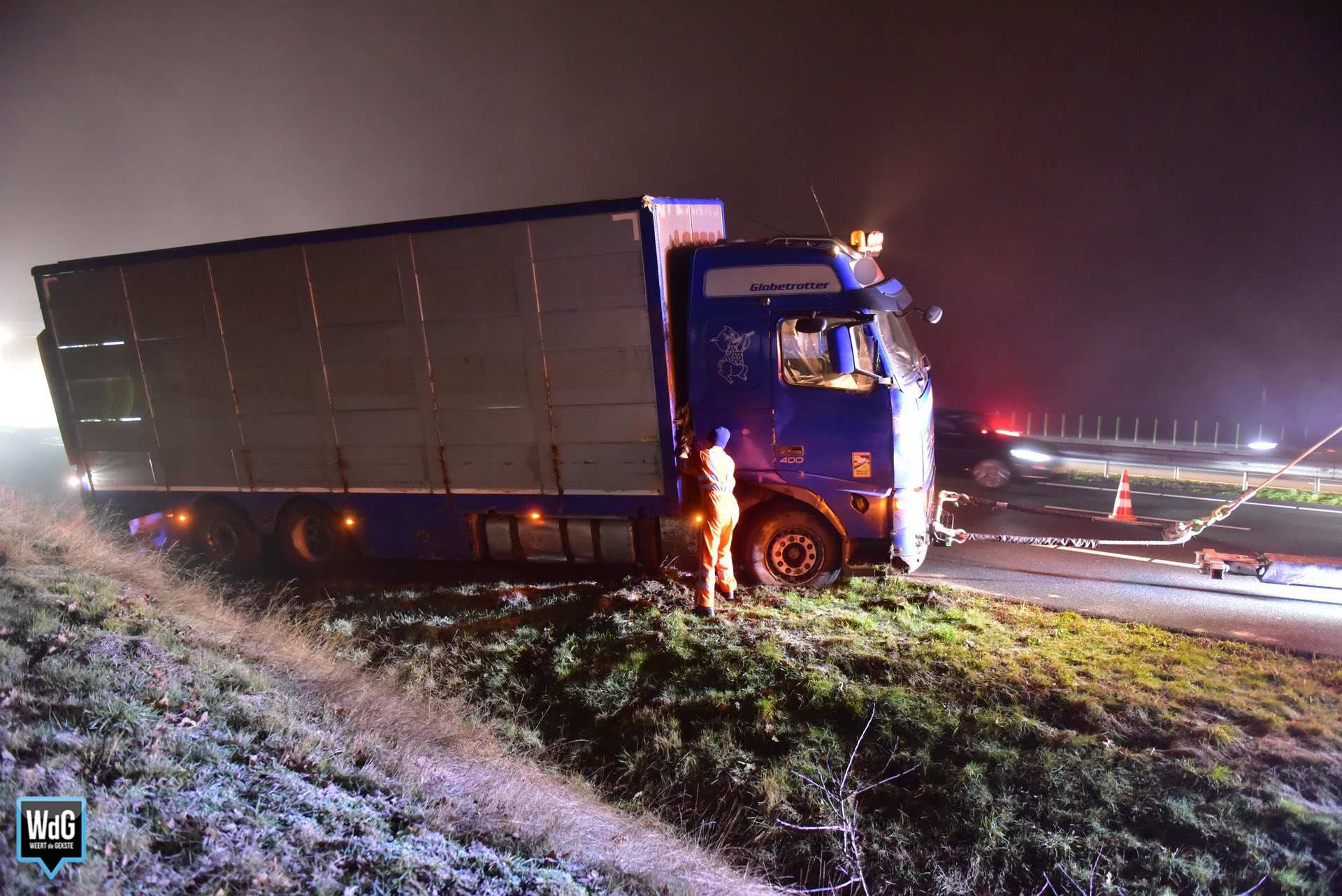 De vrachtwagen, die jonge geiten vervoerde, raakte van de weg en belandde in een greppel langs de snelweg. Door het ongeval ontstond een lange file richting het zuiden. De chauffeur bleef ongedeerd en ook de geiten kwamen er zonder verwondingen vanaf.