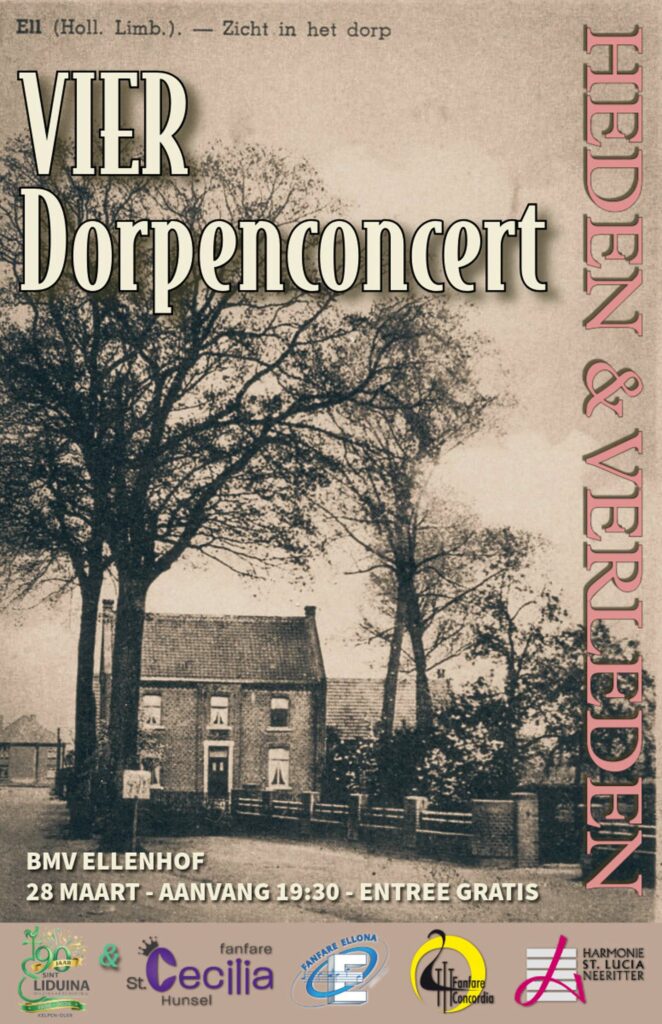 Leudal – Op zaterdag 28 maart vindt in Ell het jaarlijkse 4-Dorpenconcert plaats. Tijdens deze bijzondere avond bundelen de muziekverenigingen uit de voormalige gemeente Hunsel hun krachten. Het publiek kan rekenen op een veelzijdig programma rond het thema ‘Heden en Verleden’.