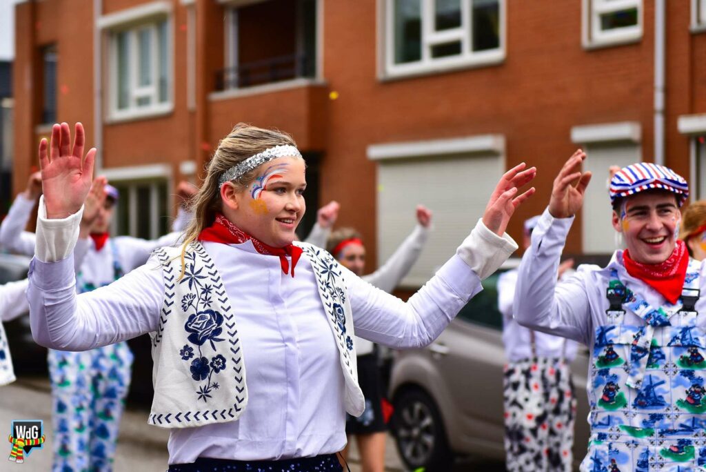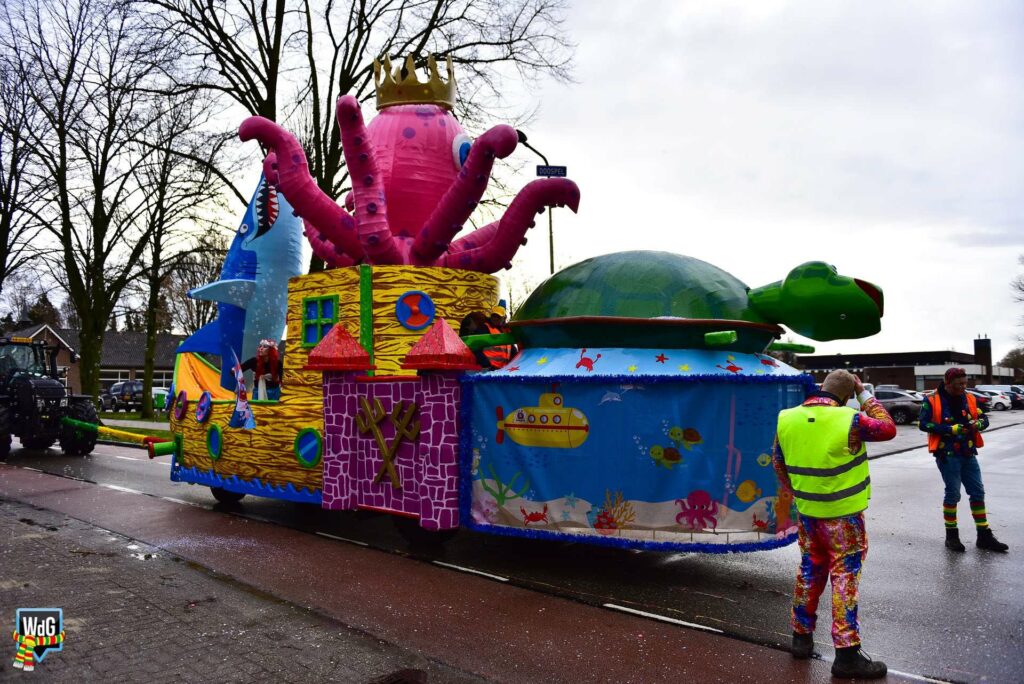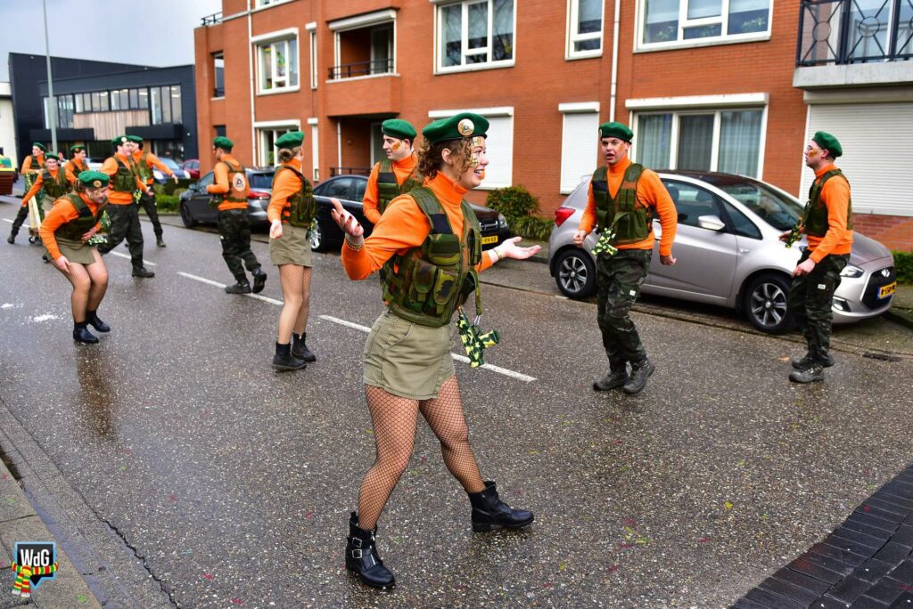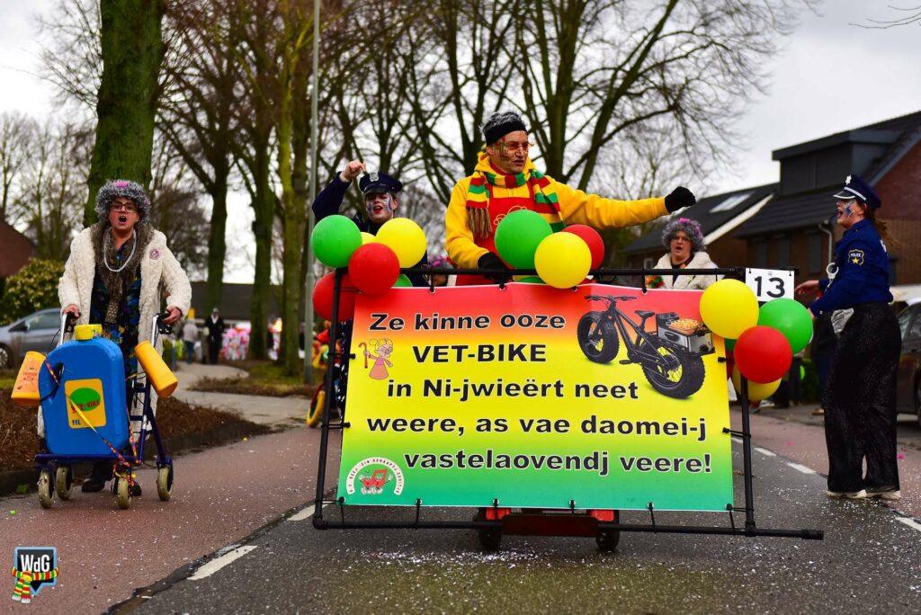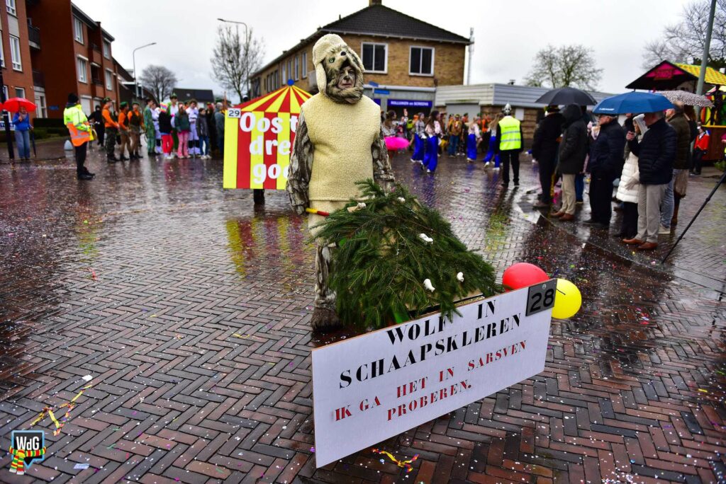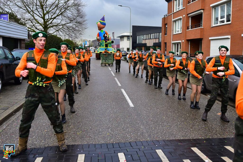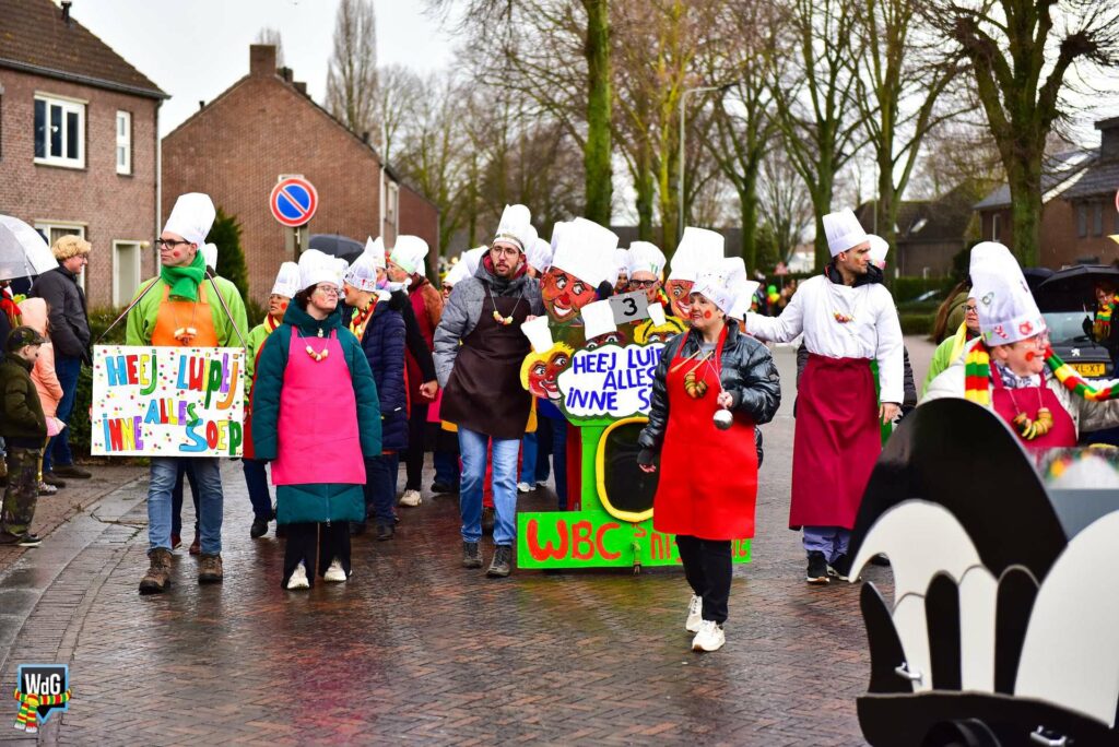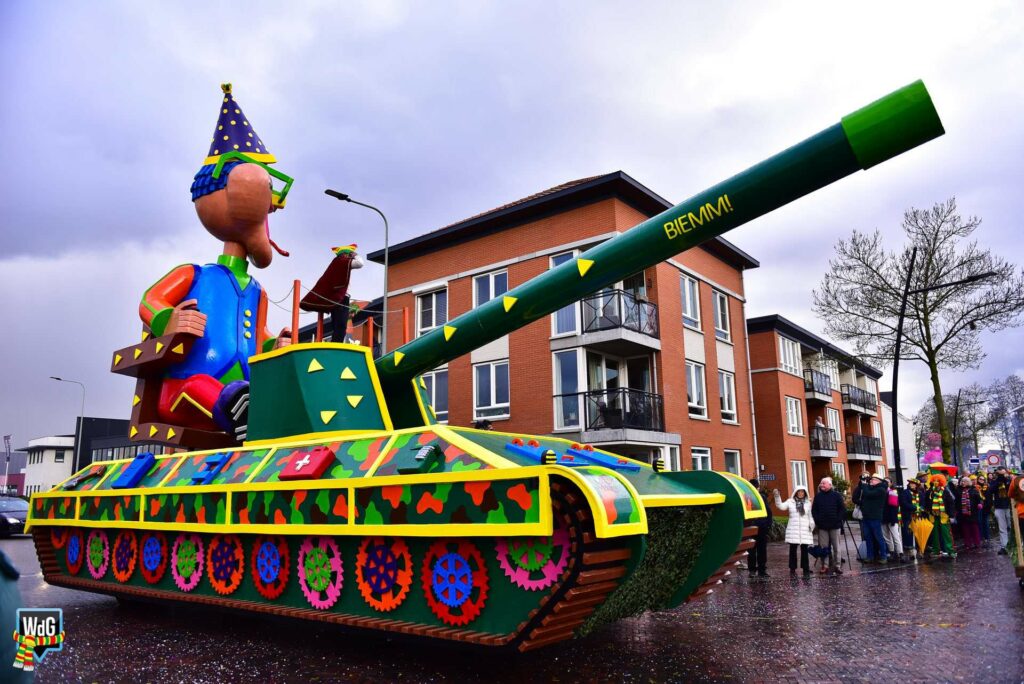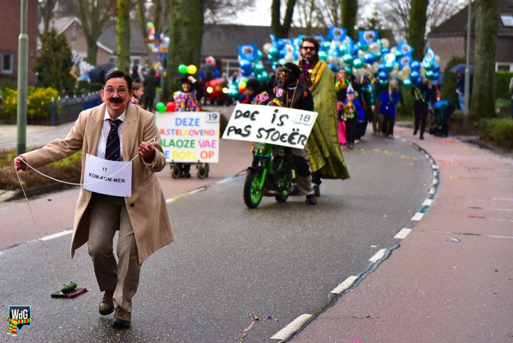 De stoet bestond uit een gevarieerd gezelschap van eenlingen, loopgroepen en imposante praalwagens zoals een grote tank. De creativiteit was zichtbaar in de tot in detail uitgewerkte kostuums, ludieke thema’s en actuele knipogen naar het dorp en de actualiteit zoals de ‘vet-bike’.