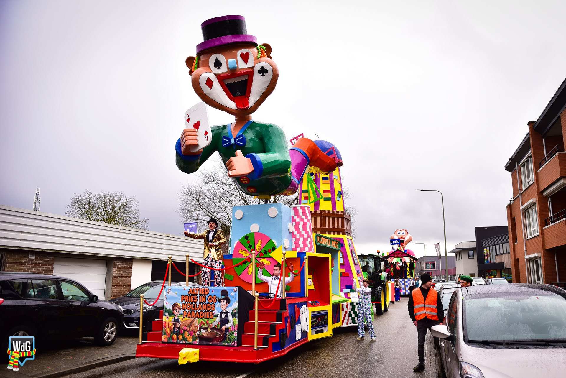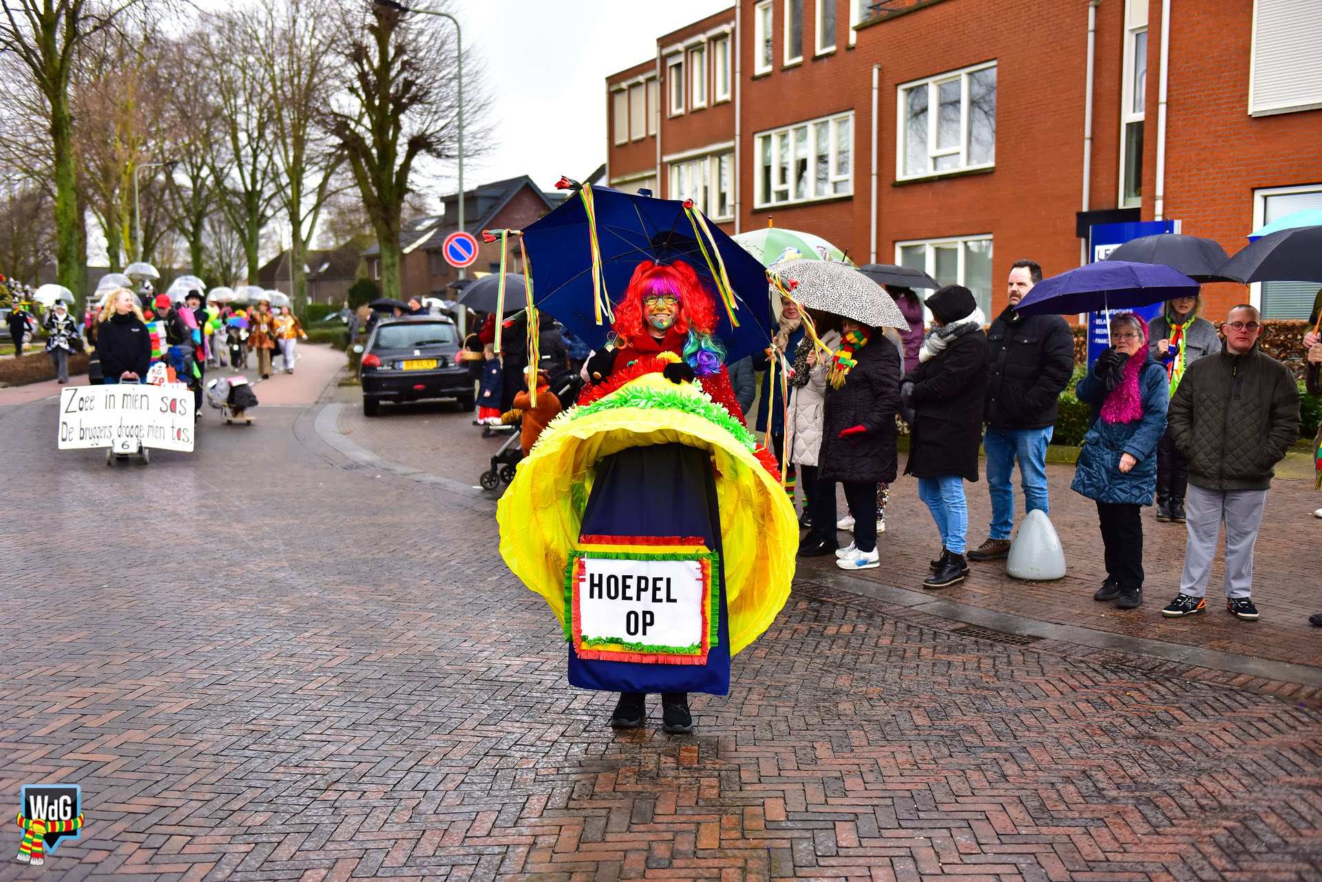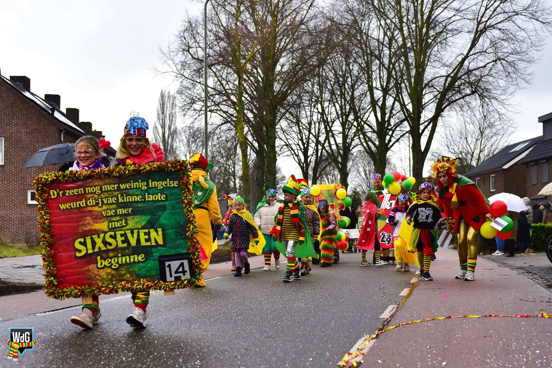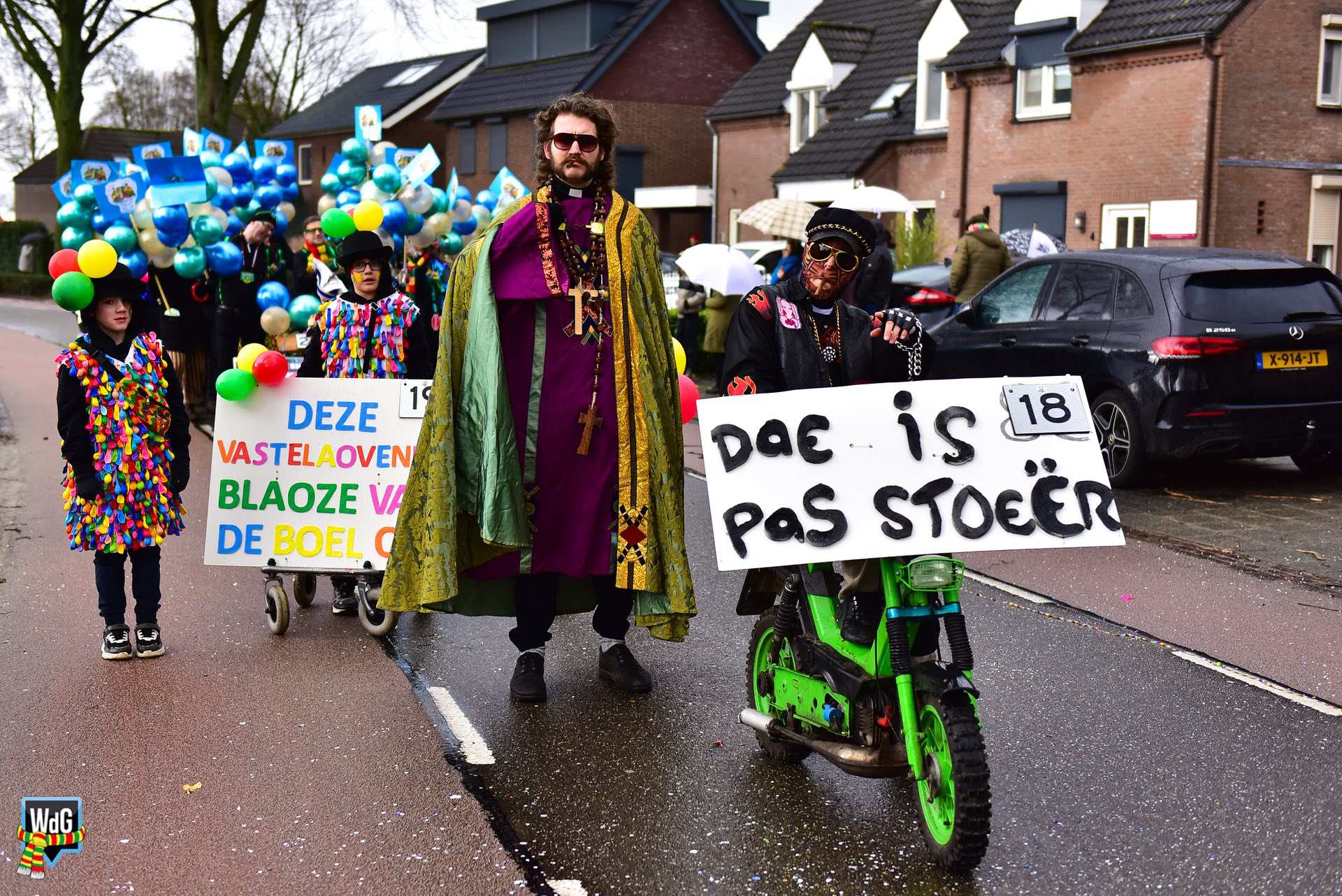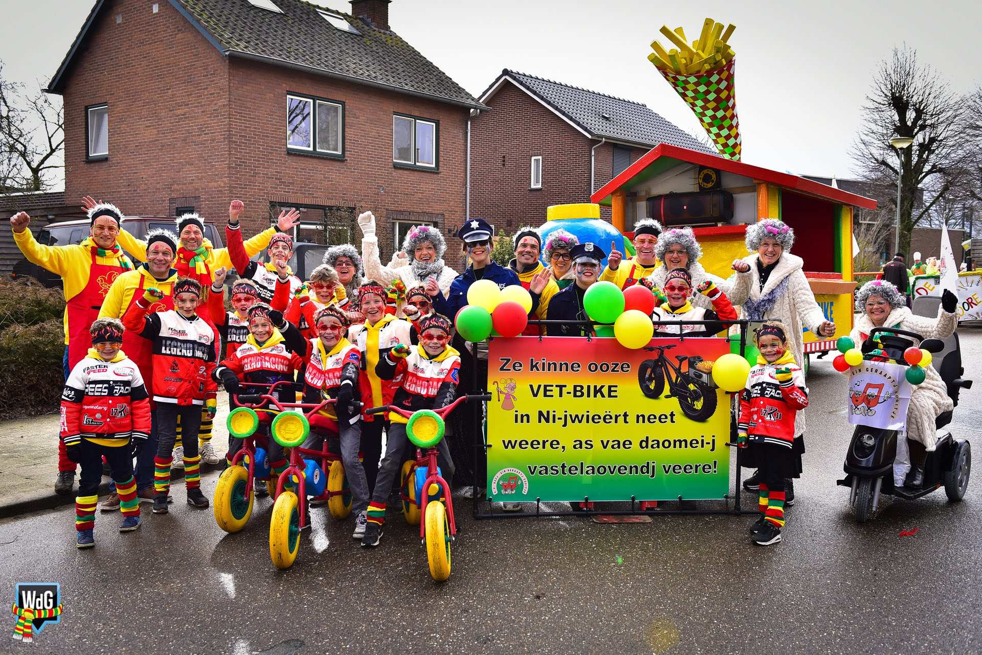 De stoet bestond uit een gevarieerd gezelschap van eenlingen, loopgroepen en imposante praalwagens zoals een grote tank. De creativiteit was zichtbaar in de tot in detail uitgewerkte kostuums, ludieke thema’s en actuele knipogen naar het dorp en de actualiteit zoals de ‘vet-bike’.