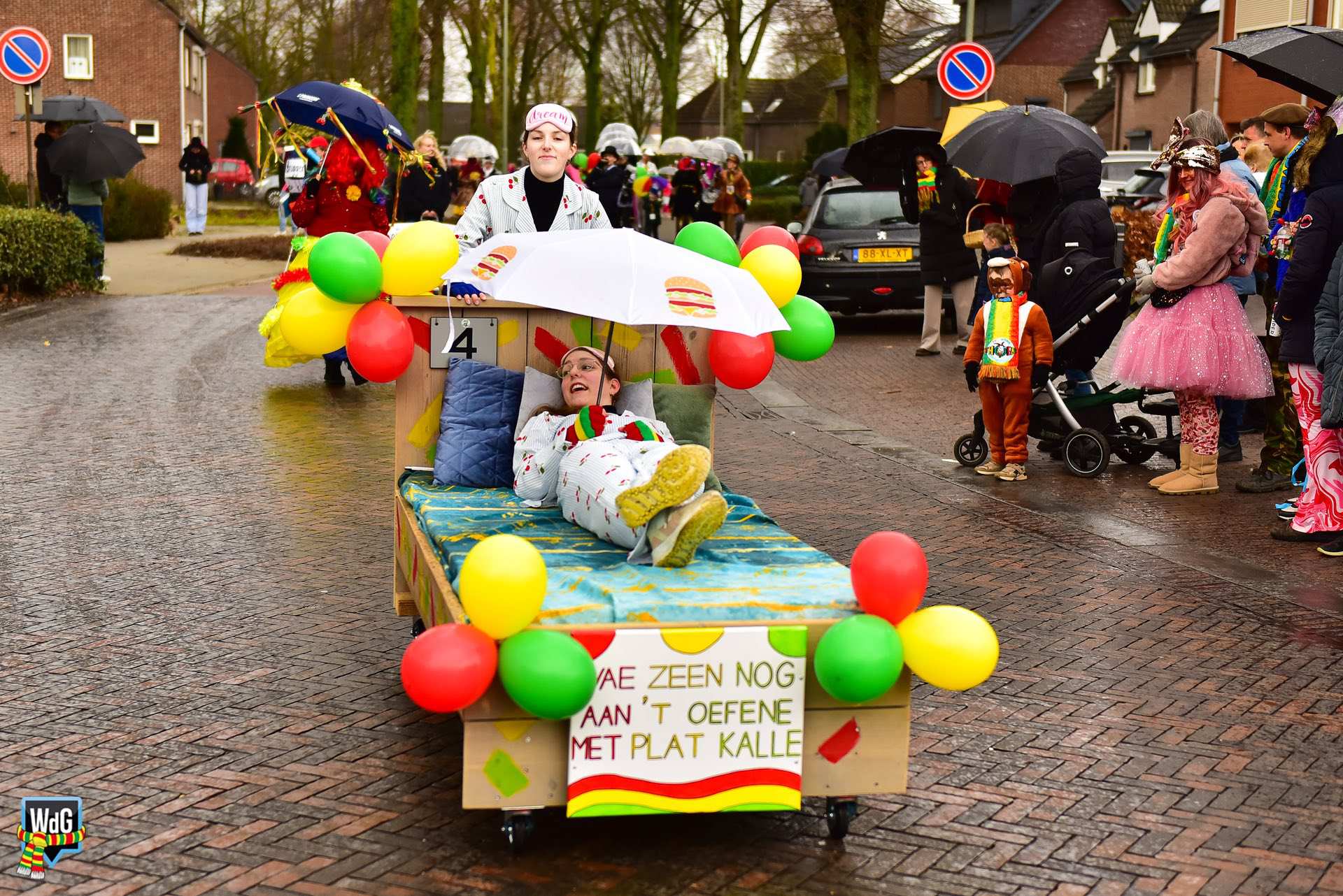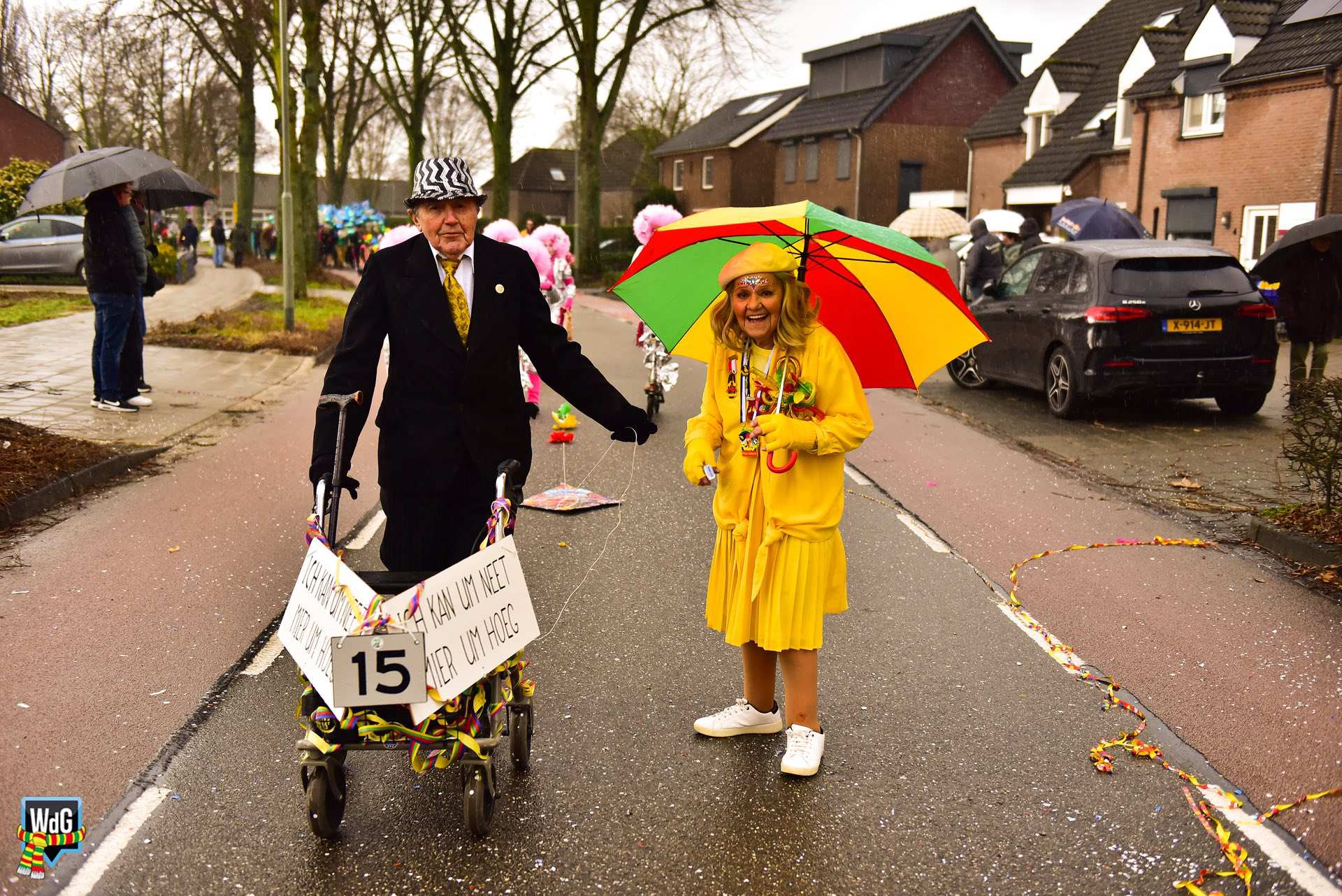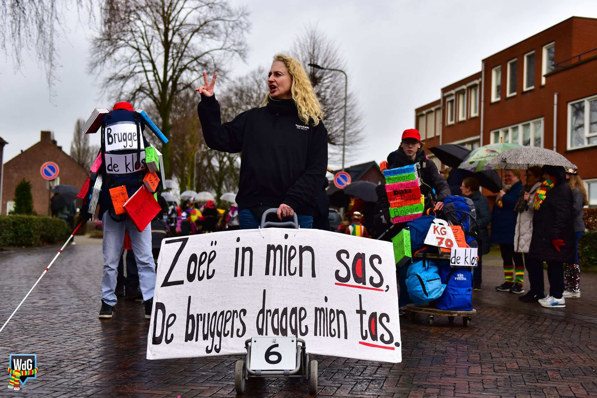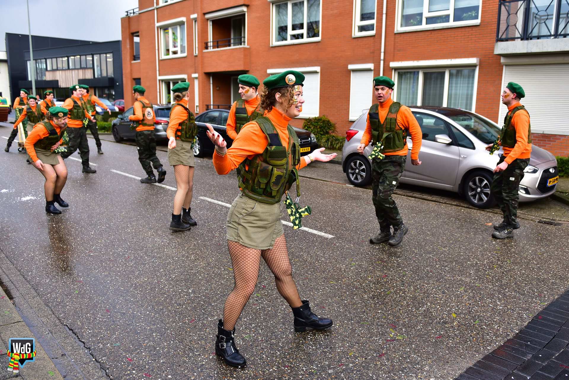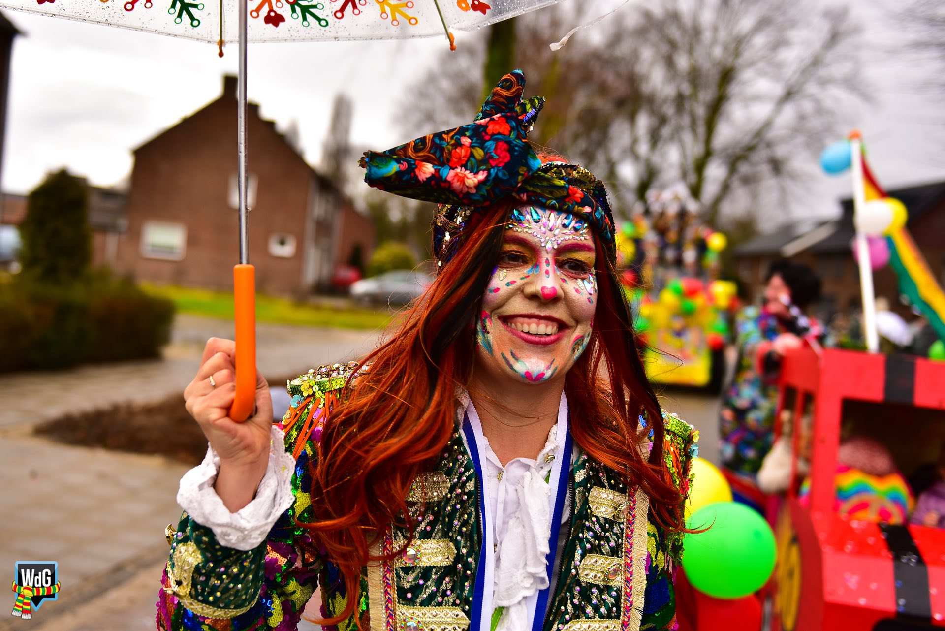 De stoet bestond uit een gevarieerd gezelschap van eenlingen, loopgroepen en imposante praalwagens zoals een grote tank. De creativiteit was zichtbaar in de tot in detail uitgewerkte kostuums, ludieke thema’s en actuele knipogen naar het dorp en de actualiteit zoals de ‘vet-bike’.