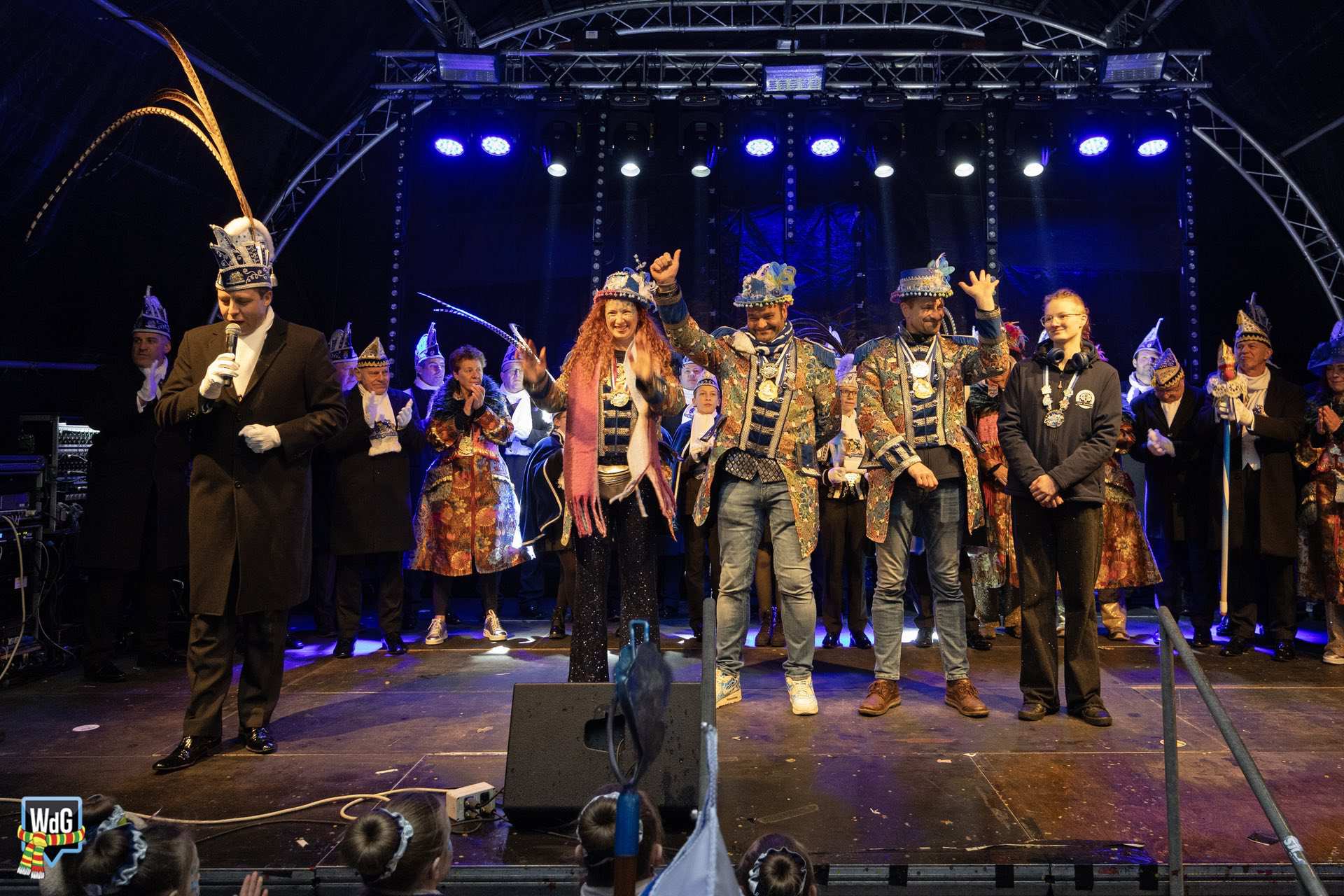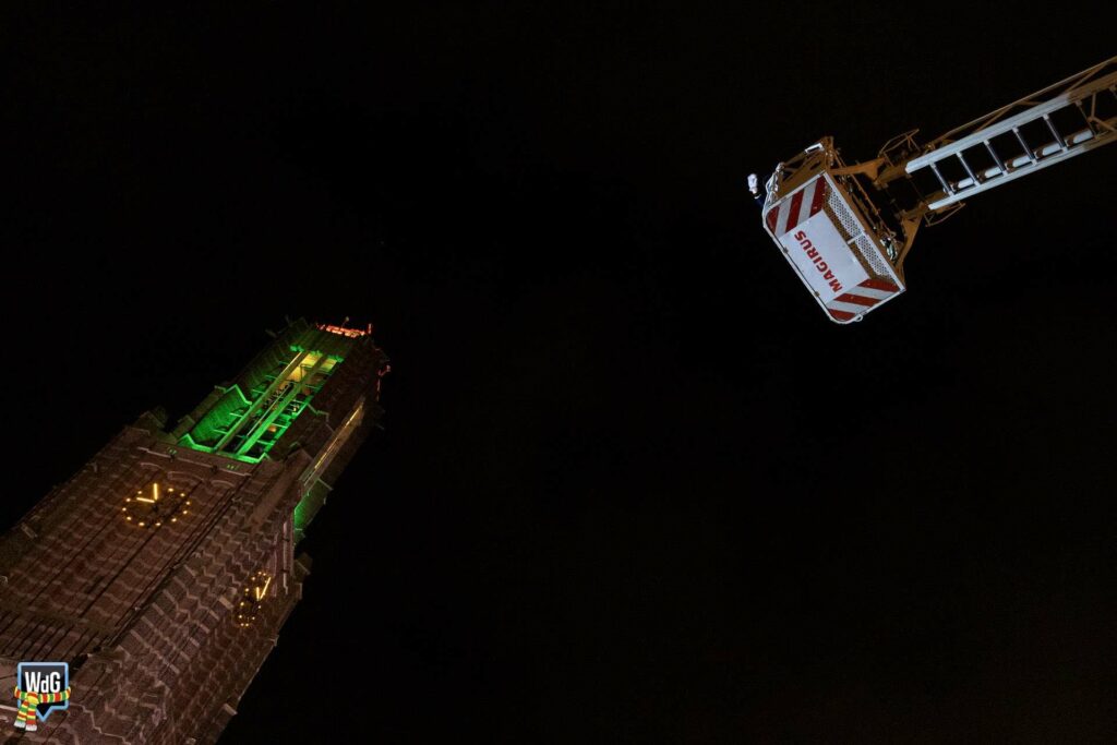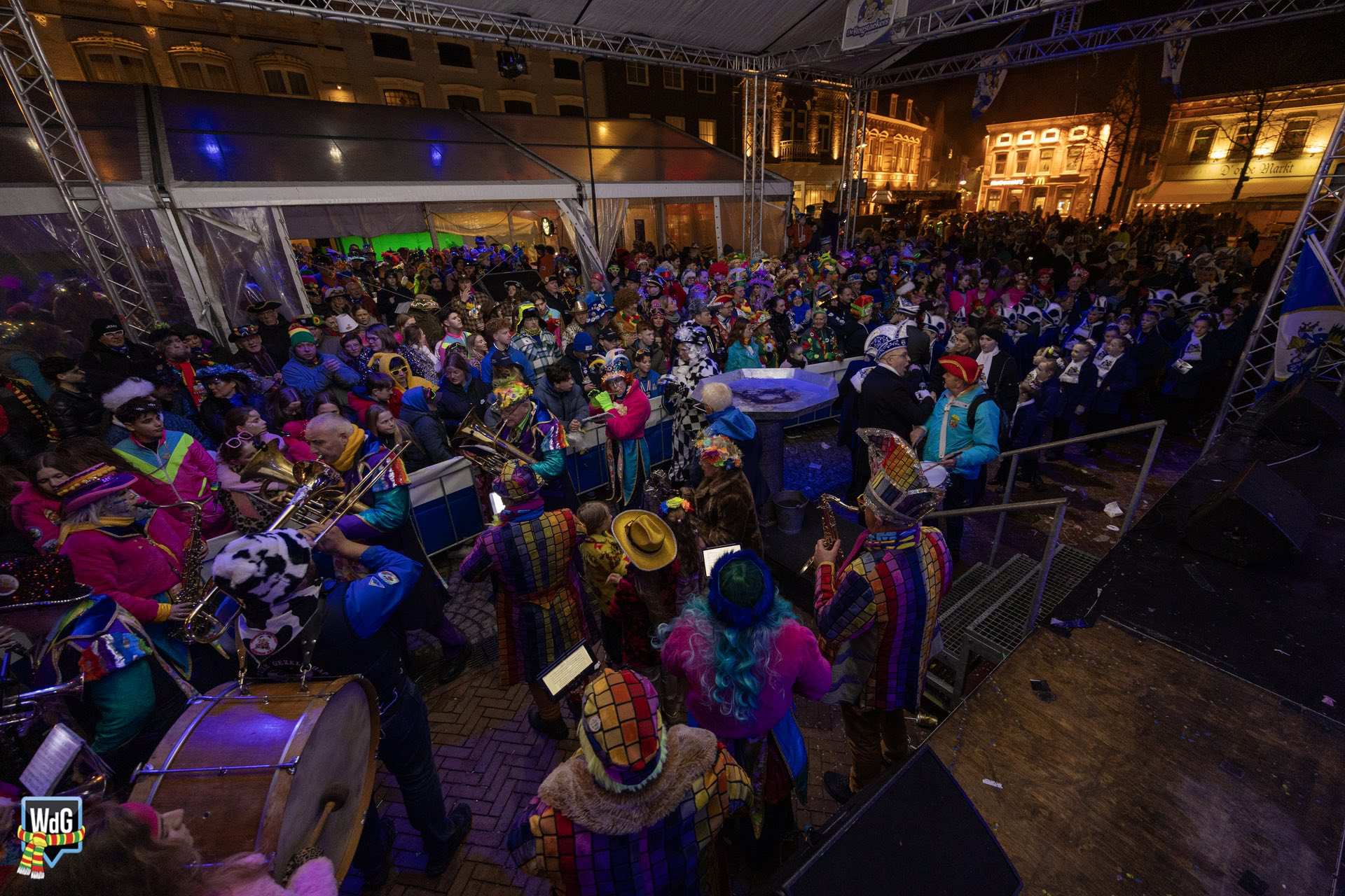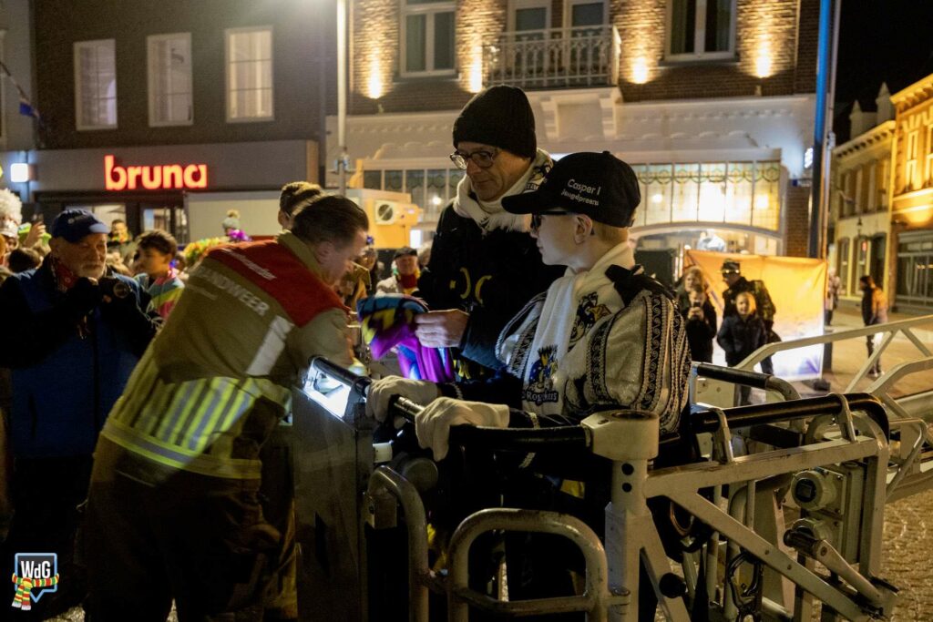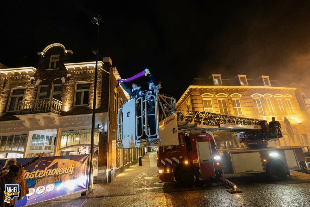 Na het afleggen van hun versierselen volgde een laatste bijzonder moment. De prinsen namen plaats in de ladderwagen van de brandweer en brachten vanaf hoogte nog één keer een groet aan het publiek op de Markt.