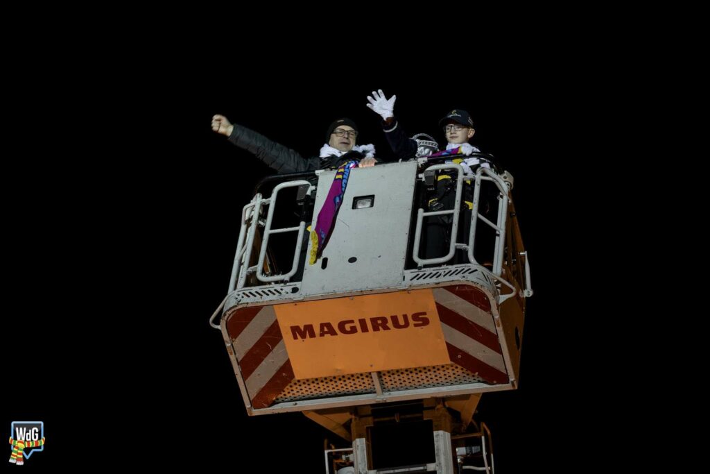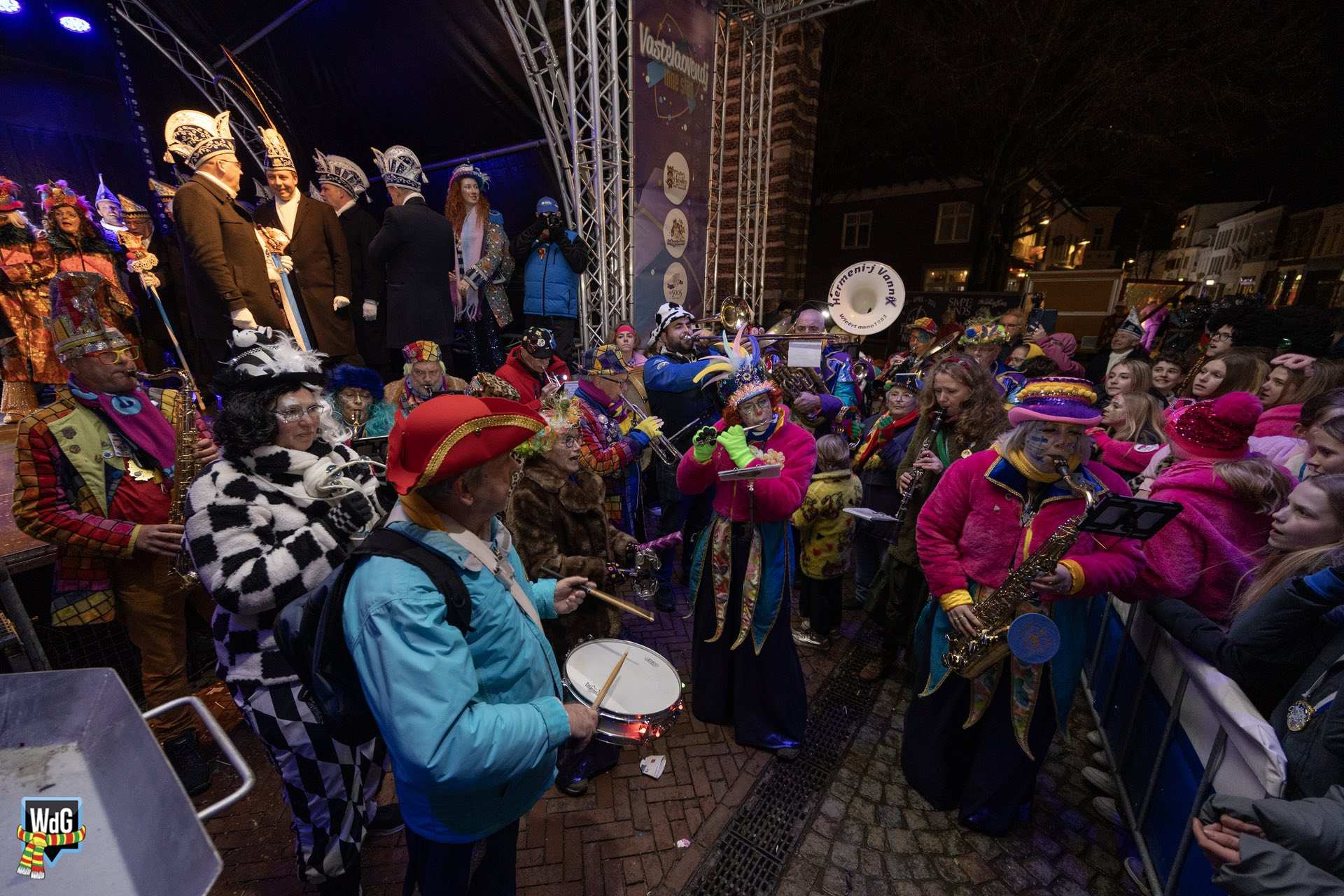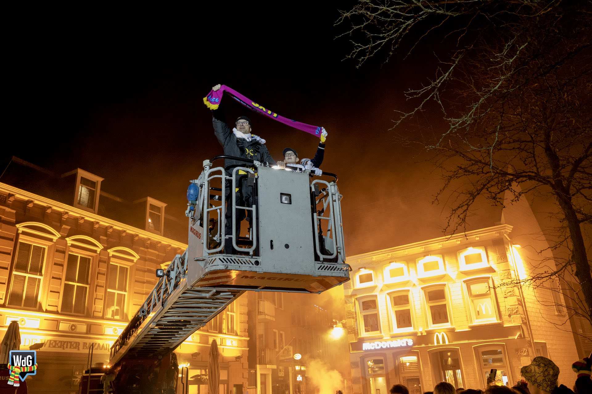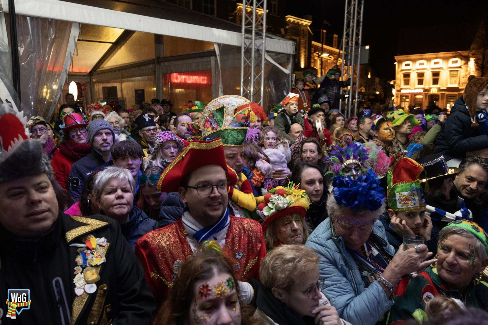 Na het afleggen van hun versierselen volgde een laatste bijzonder moment. De prinsen namen plaats in de ladderwagen van de brandweer en brachten vanaf hoogte nog één keer een groet aan het publiek op de Markt.