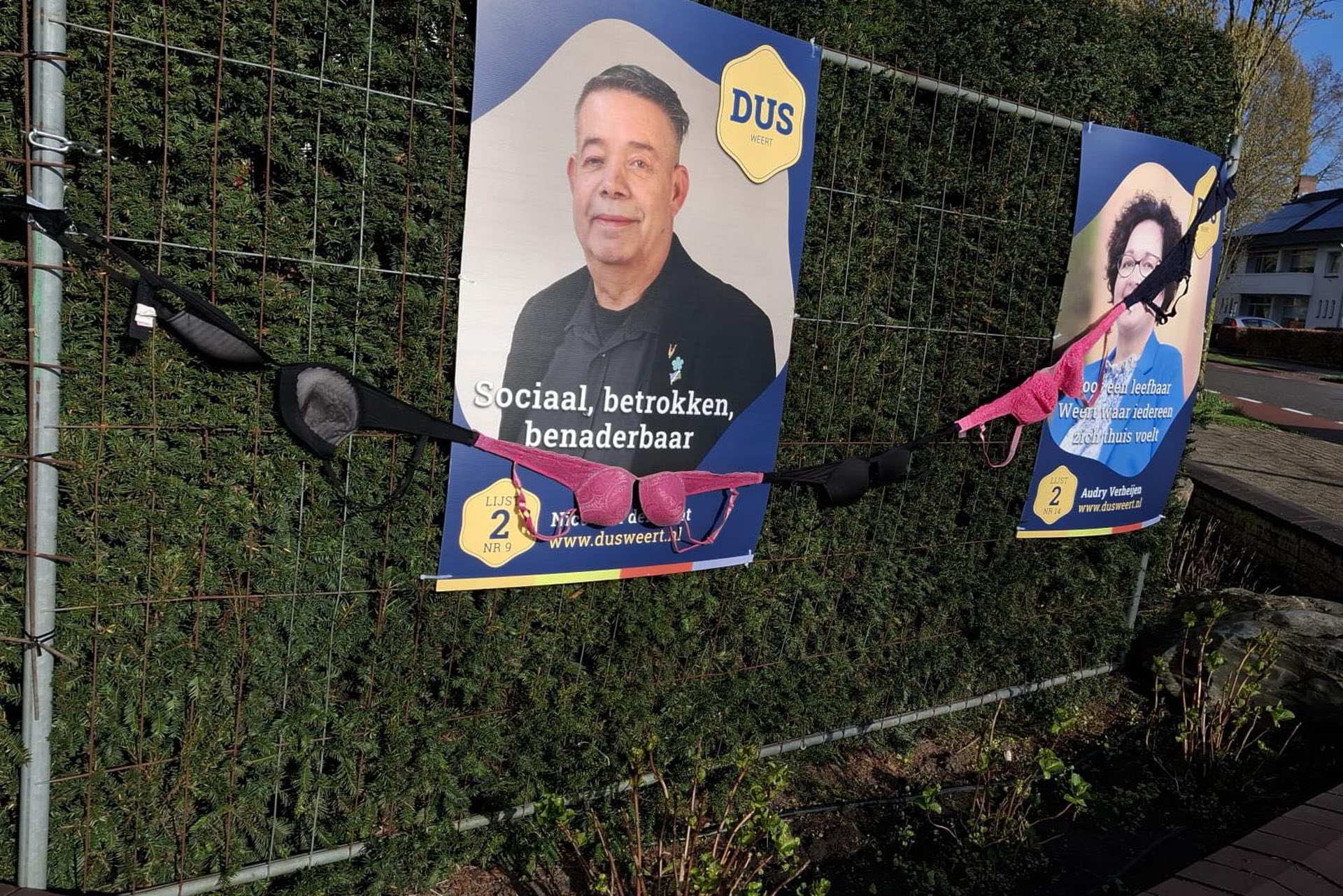In Weert zijn vanochtend vroeg verkiezingsborden versierd met beha’s. De actie is uitgevoerd door de Limburgse Dolle Mina’s, die daarmee aandacht vragen voor de positie van vrouwen in aanloop naar de gemeenteraadsverkiezingen.