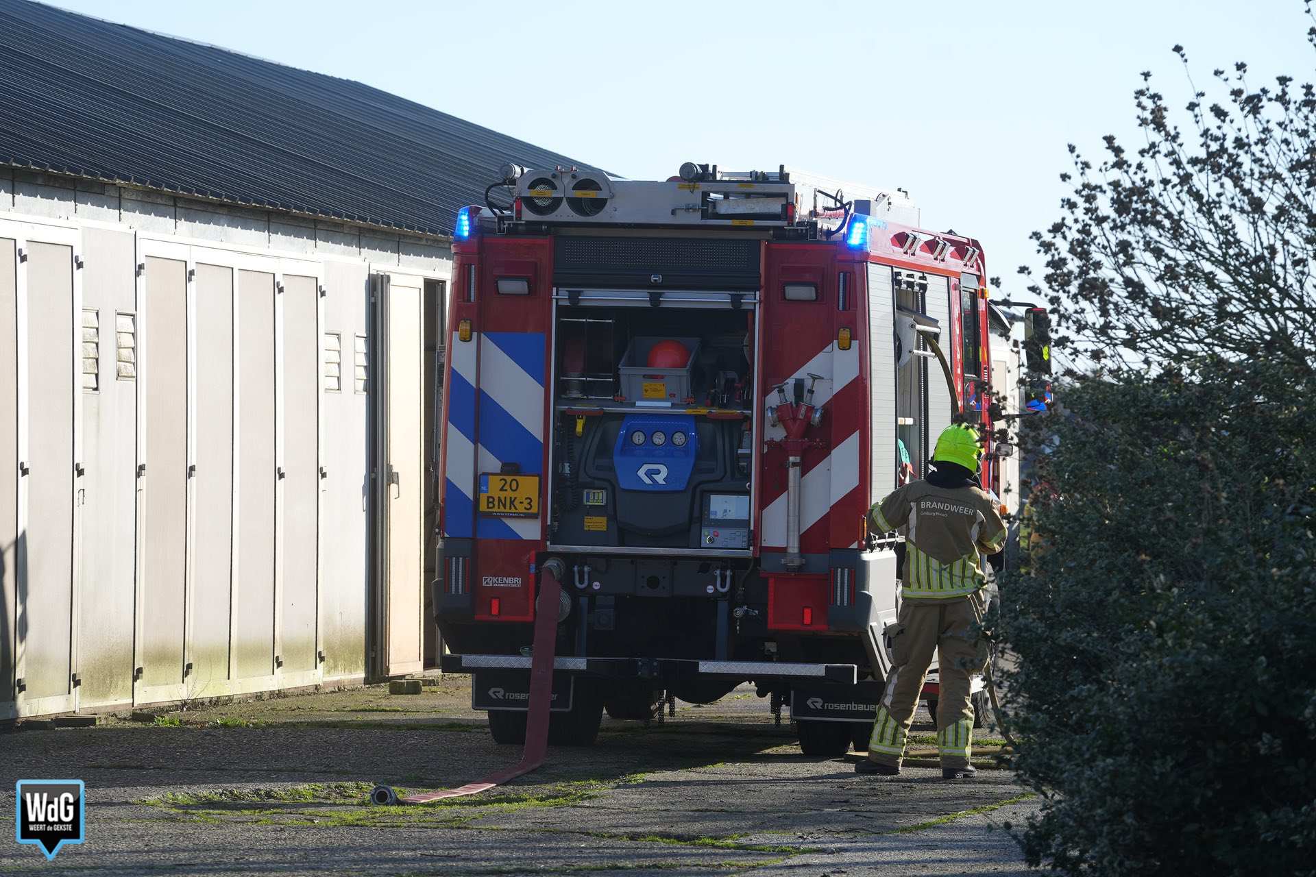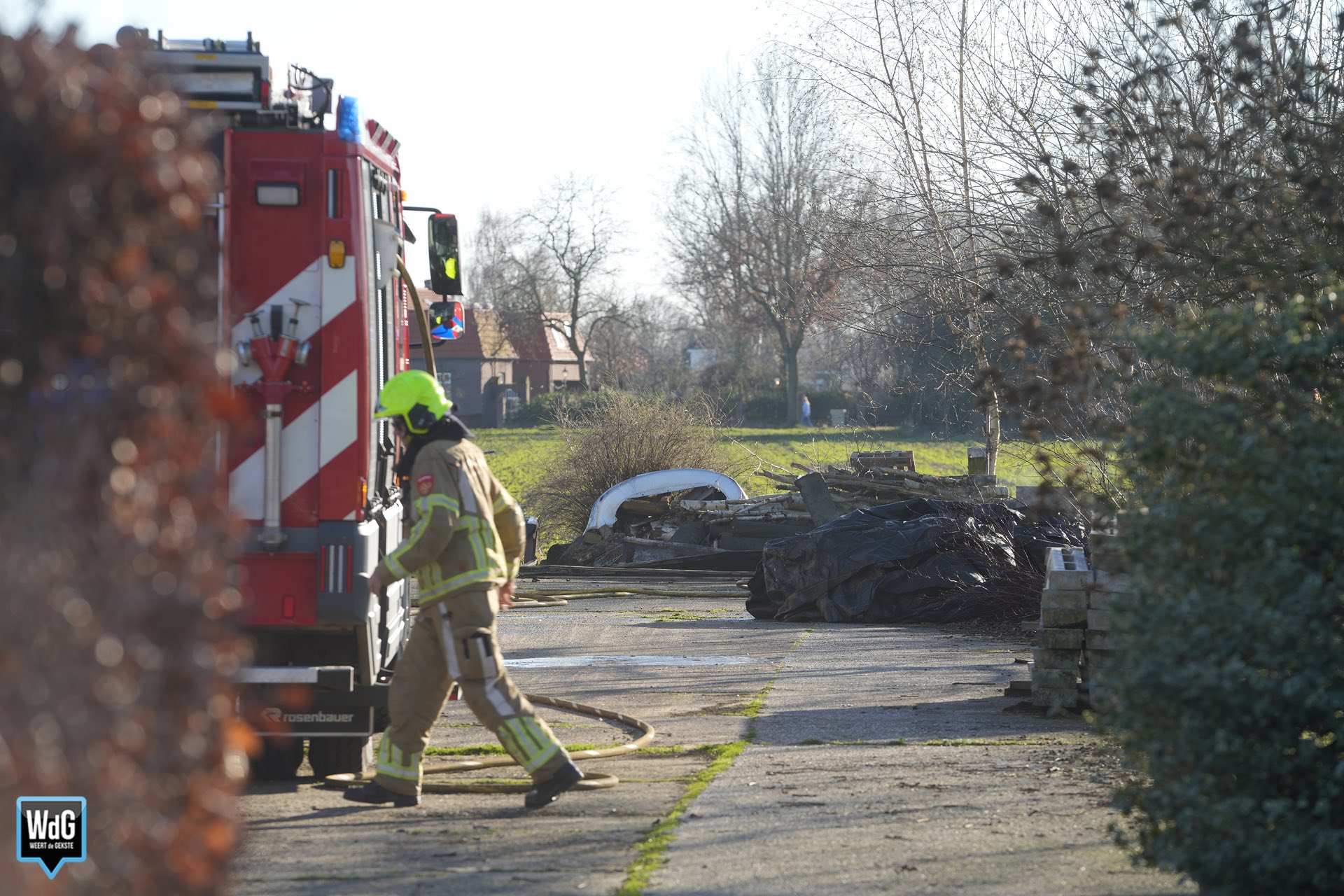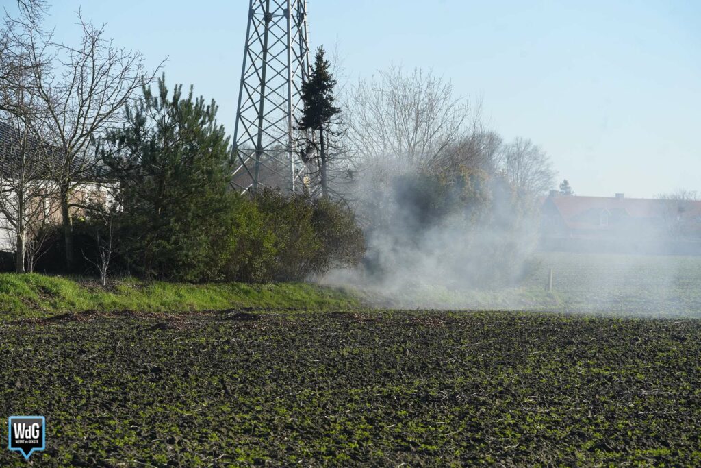 Op het perceel van een agrariër wilde men een vuur maken in een vuurton. Door de harde wind sloegen de vlammen echter over naar omliggende materialen, die vervolgens vlam vatten.
