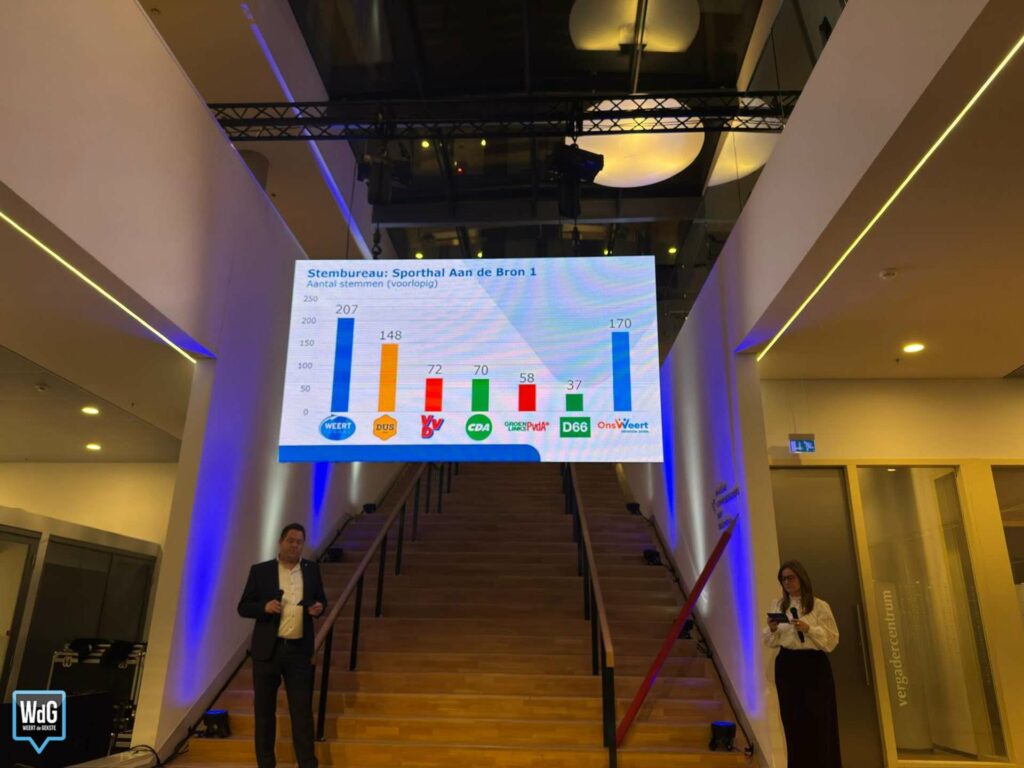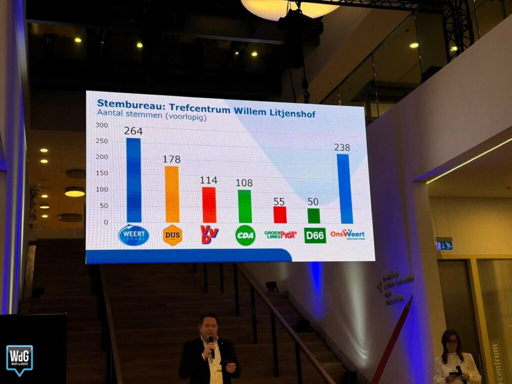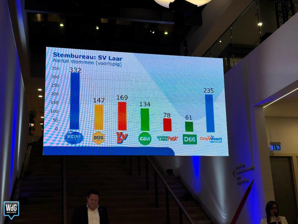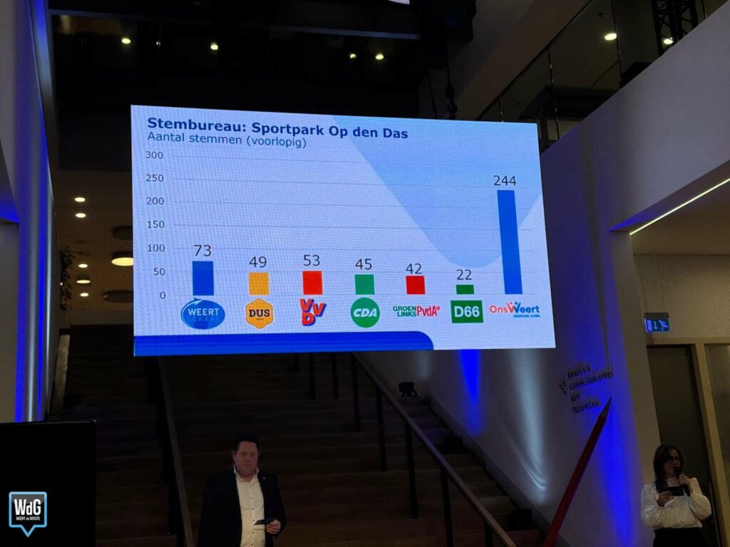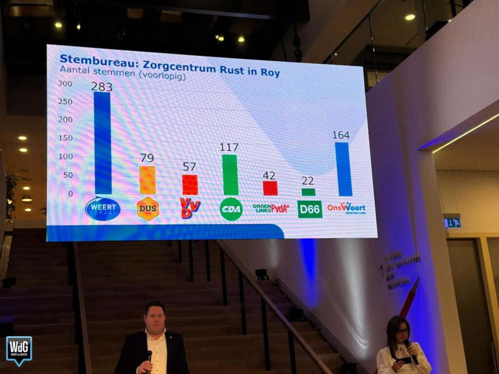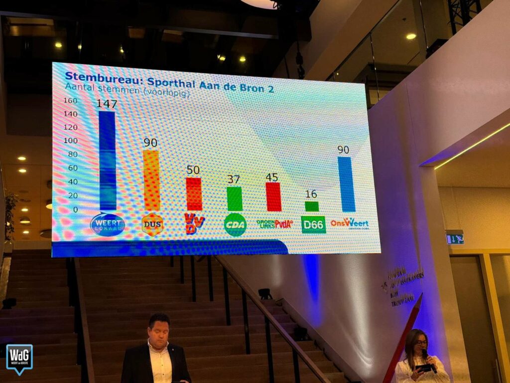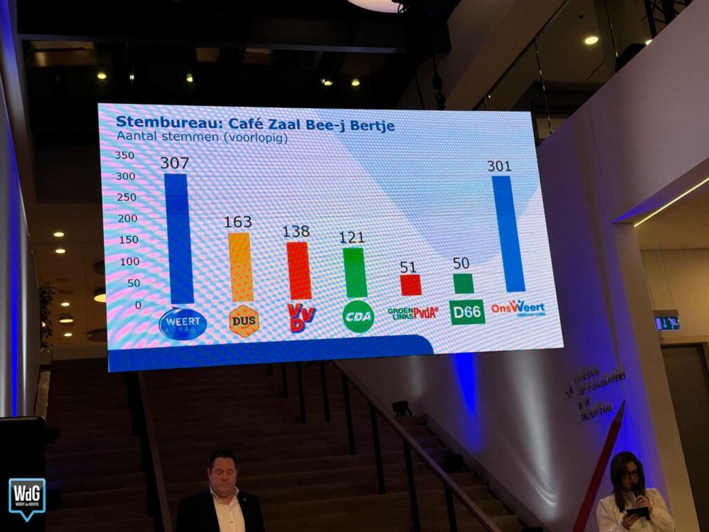 In sporthal Aan de Bron noteert Weert Lokaal 207 stemmen en blijft daarmee de grootste. Ons Weert volgt met 170 stemmen en DUS Weert met 148. VVD komt uit op 72 stemmen, CDA op 70, GroenLinks/PvdA op 58 en D66 op 37.