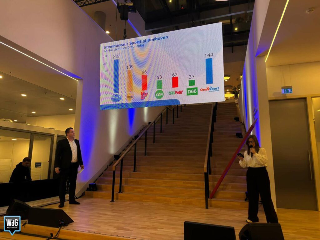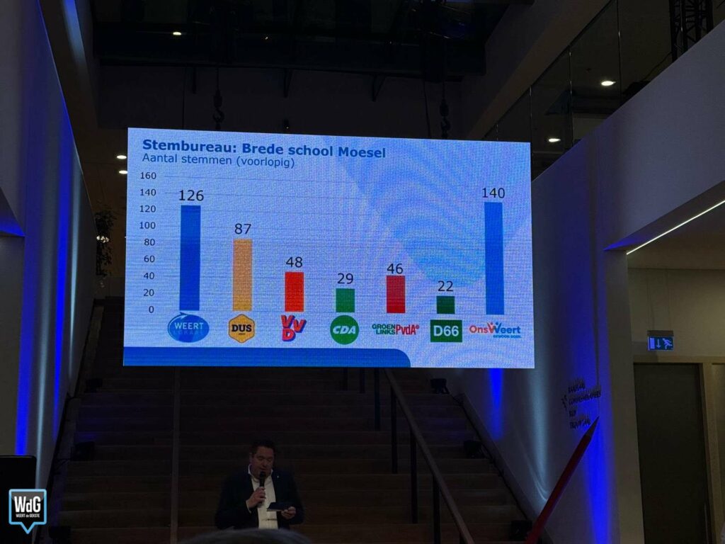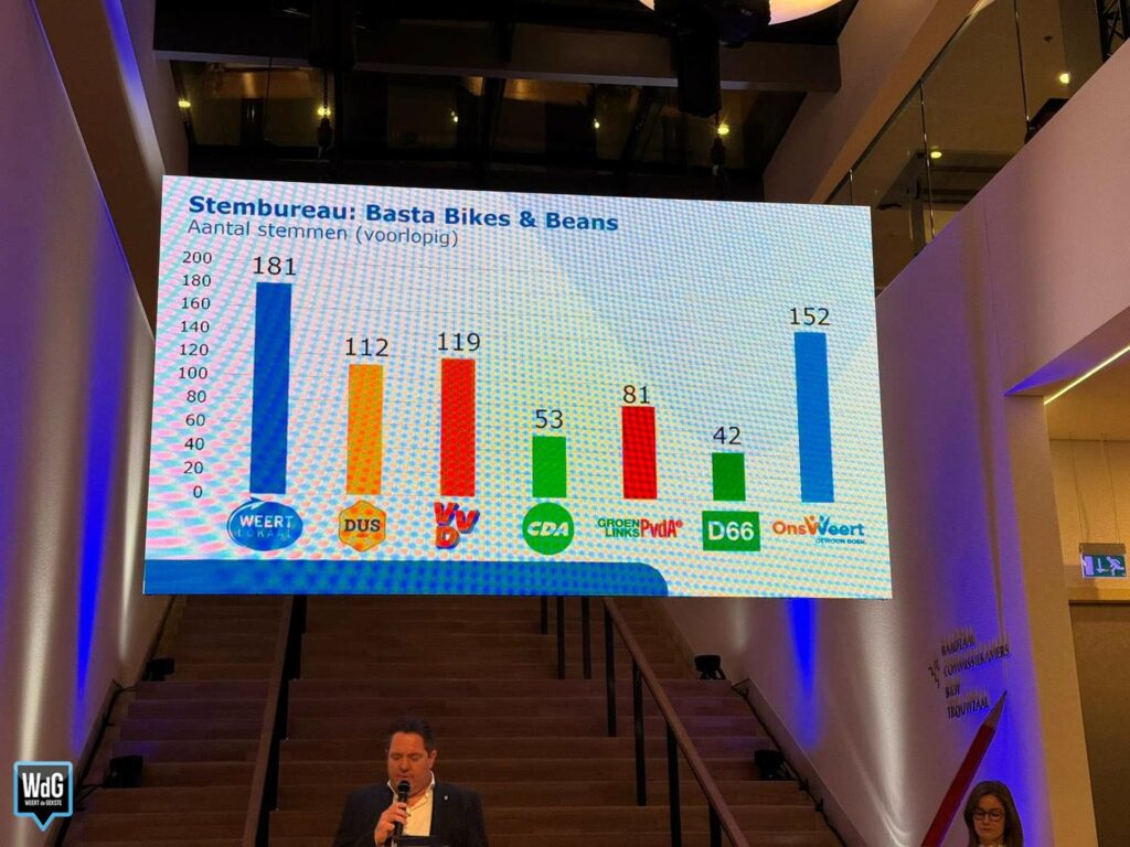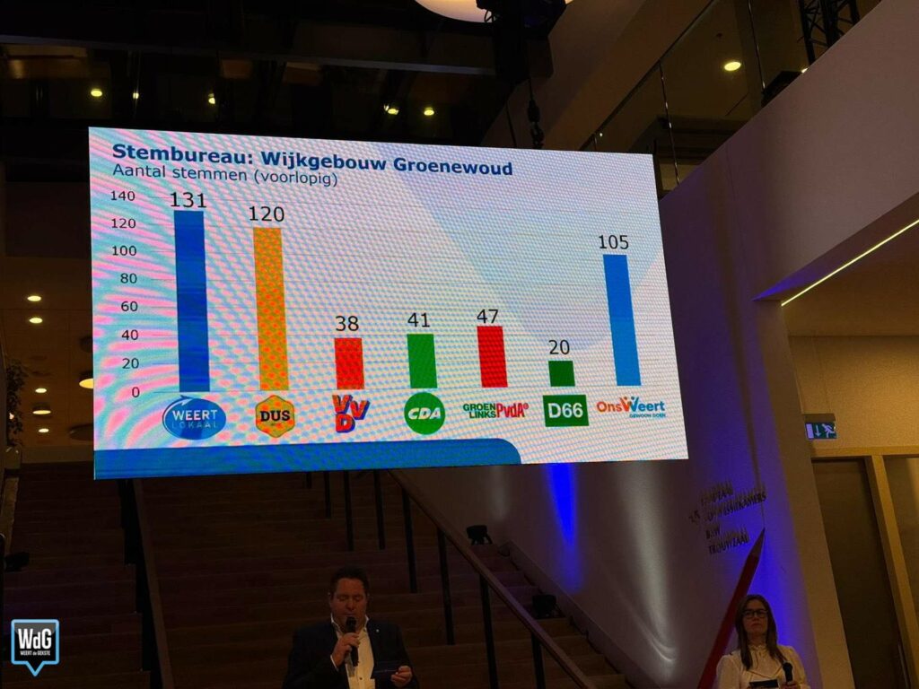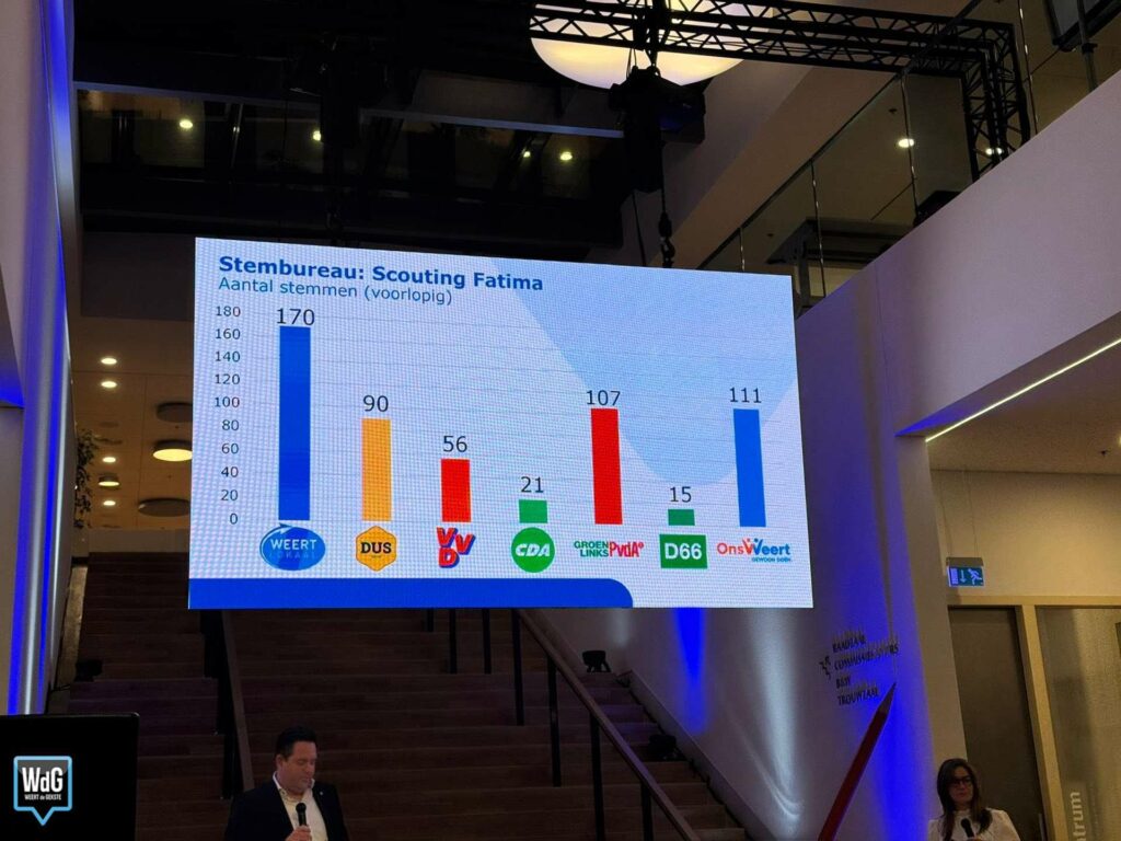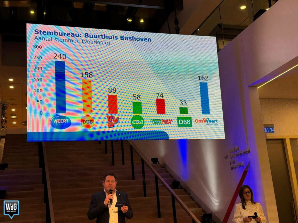 In sporthal Aan de Bron noteert Weert Lokaal 207 stemmen en blijft daarmee de grootste. Ons Weert volgt met 170 stemmen en DUS Weert met 148. VVD komt uit op 72 stemmen, CDA op 70, GroenLinks/PvdA op 58 en D66 op 37.