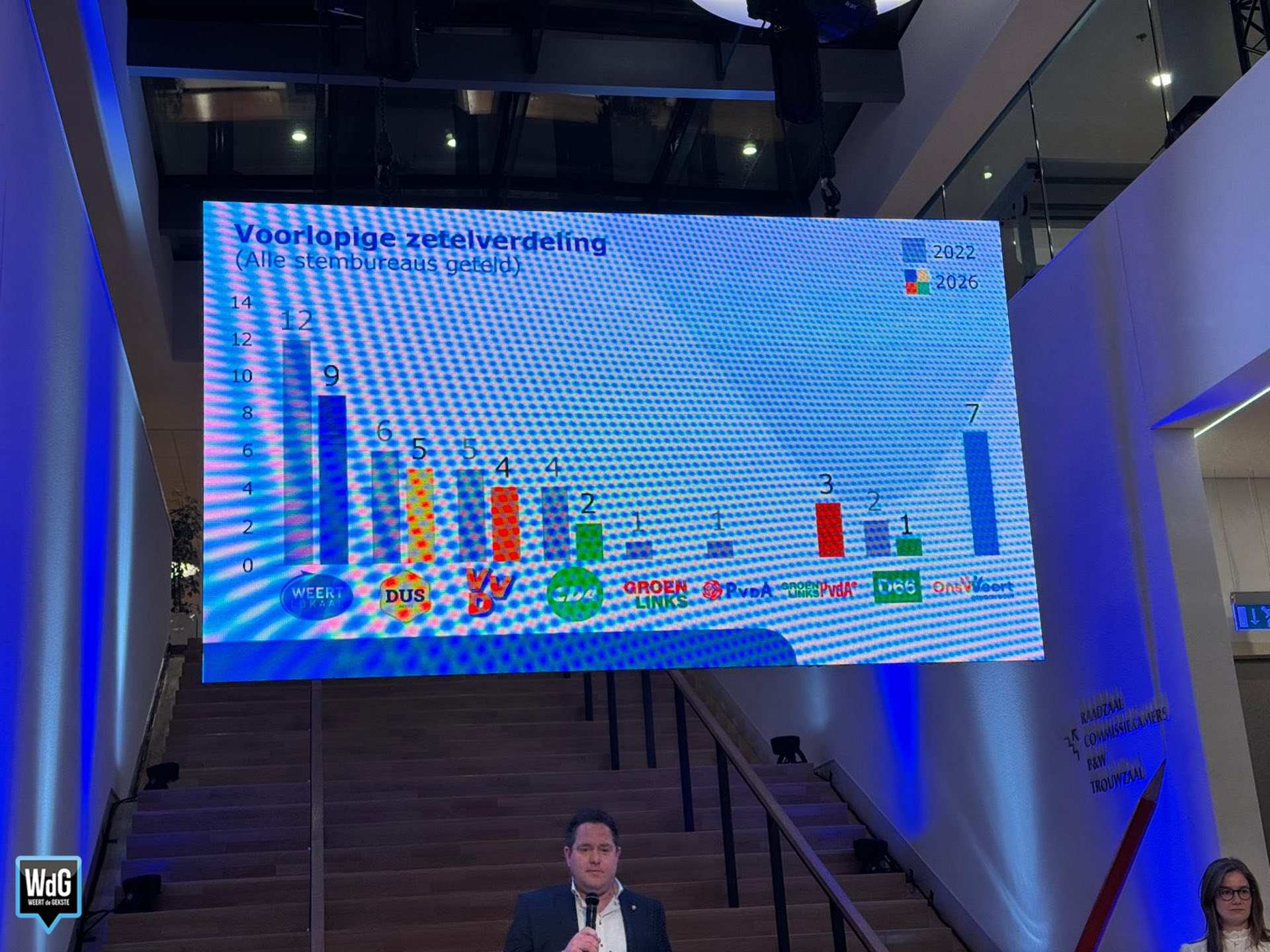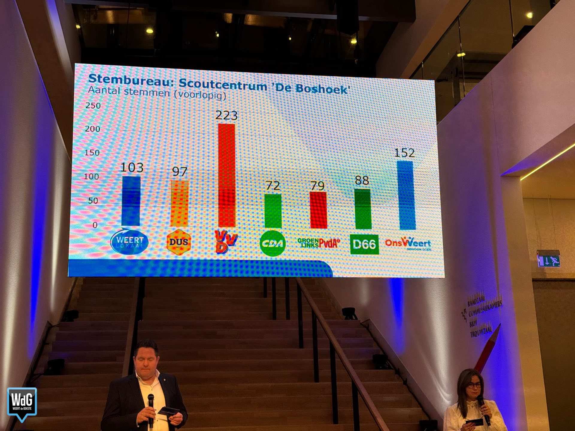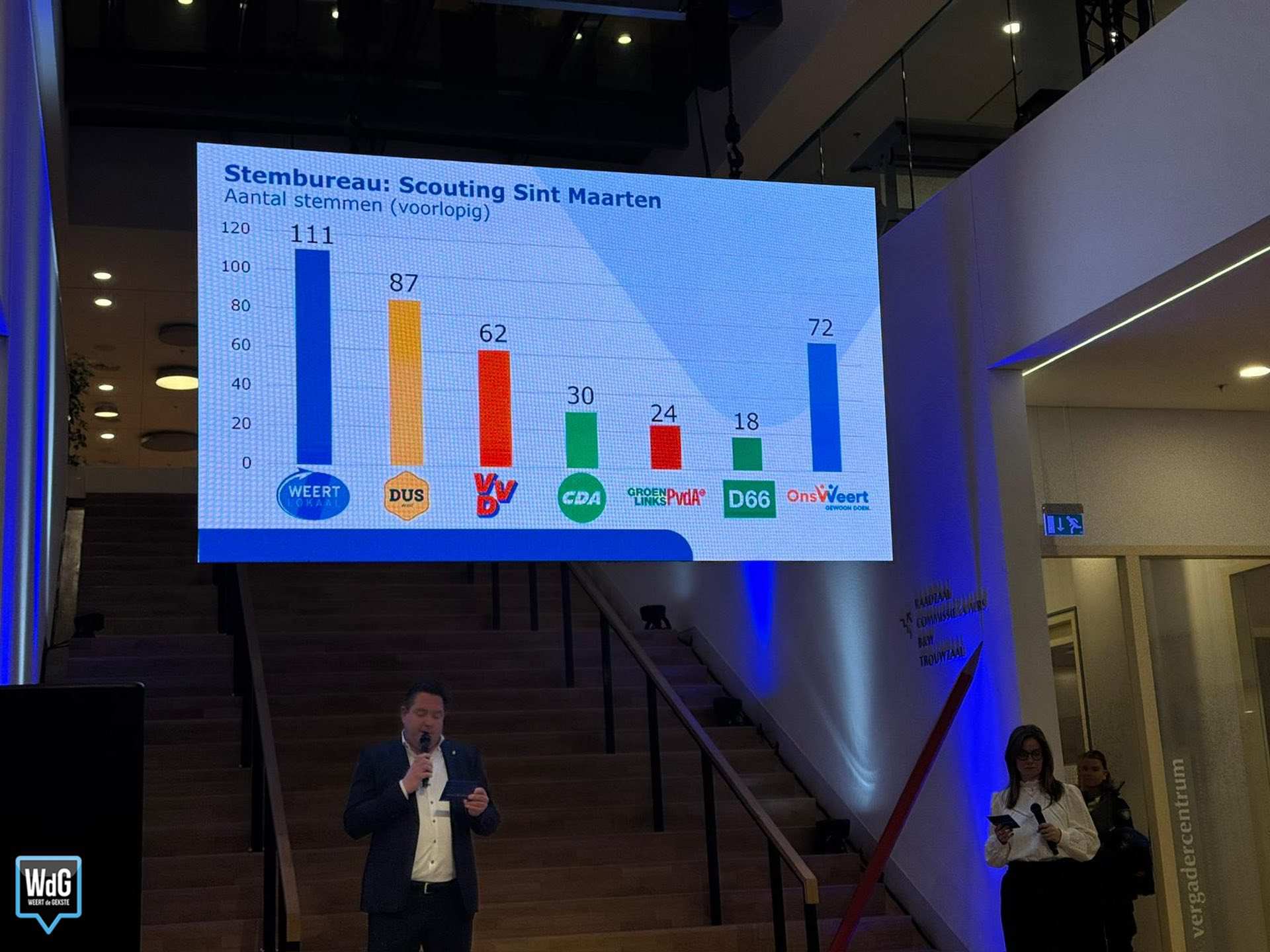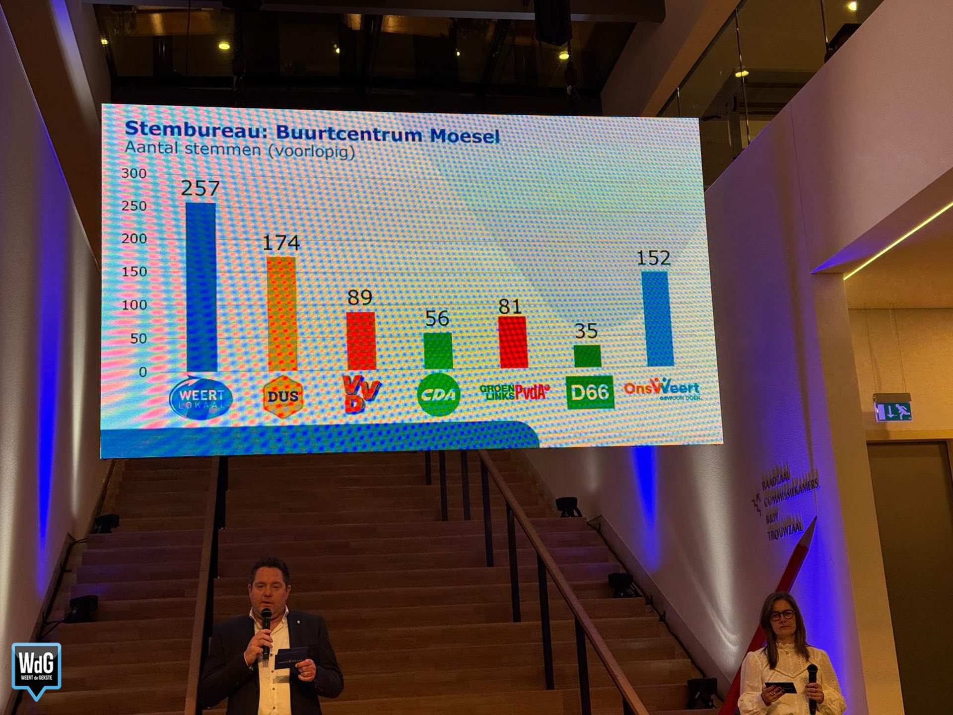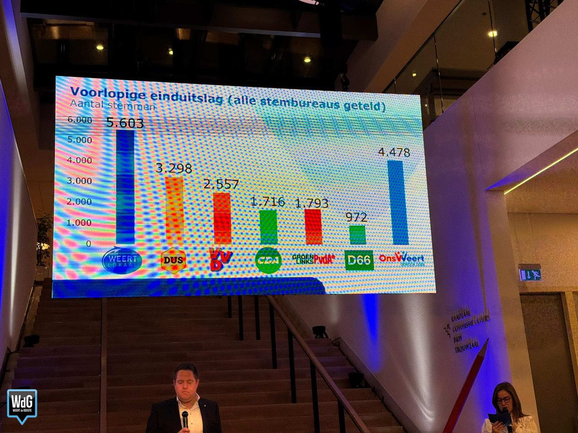 In sporthal Aan de Bron noteert Weert Lokaal 207 stemmen en blijft daarmee de grootste. Ons Weert volgt met 170 stemmen en DUS Weert met 148. VVD komt uit op 72 stemmen, CDA op 70, GroenLinks/PvdA op 58 en D66 op 37.