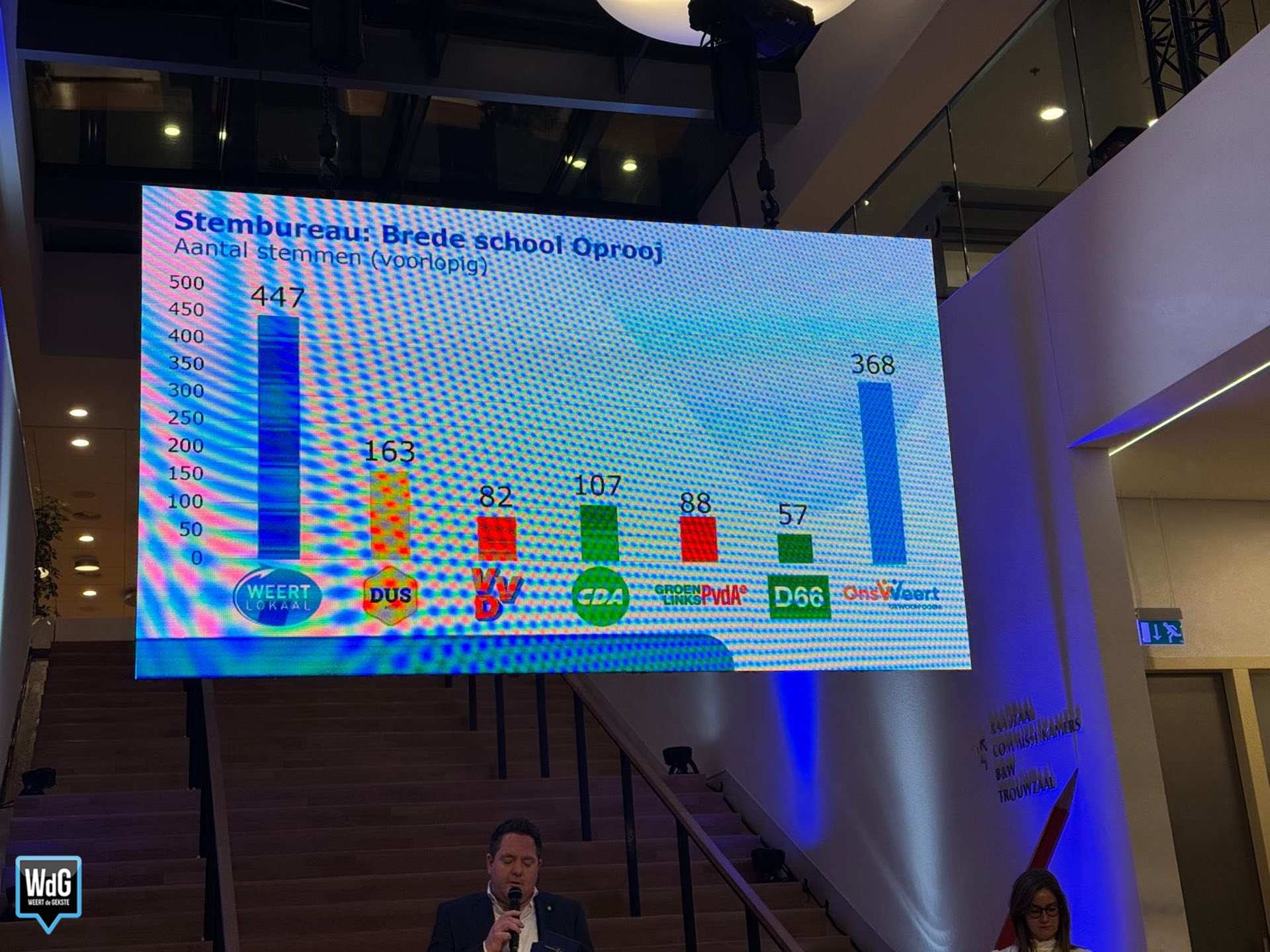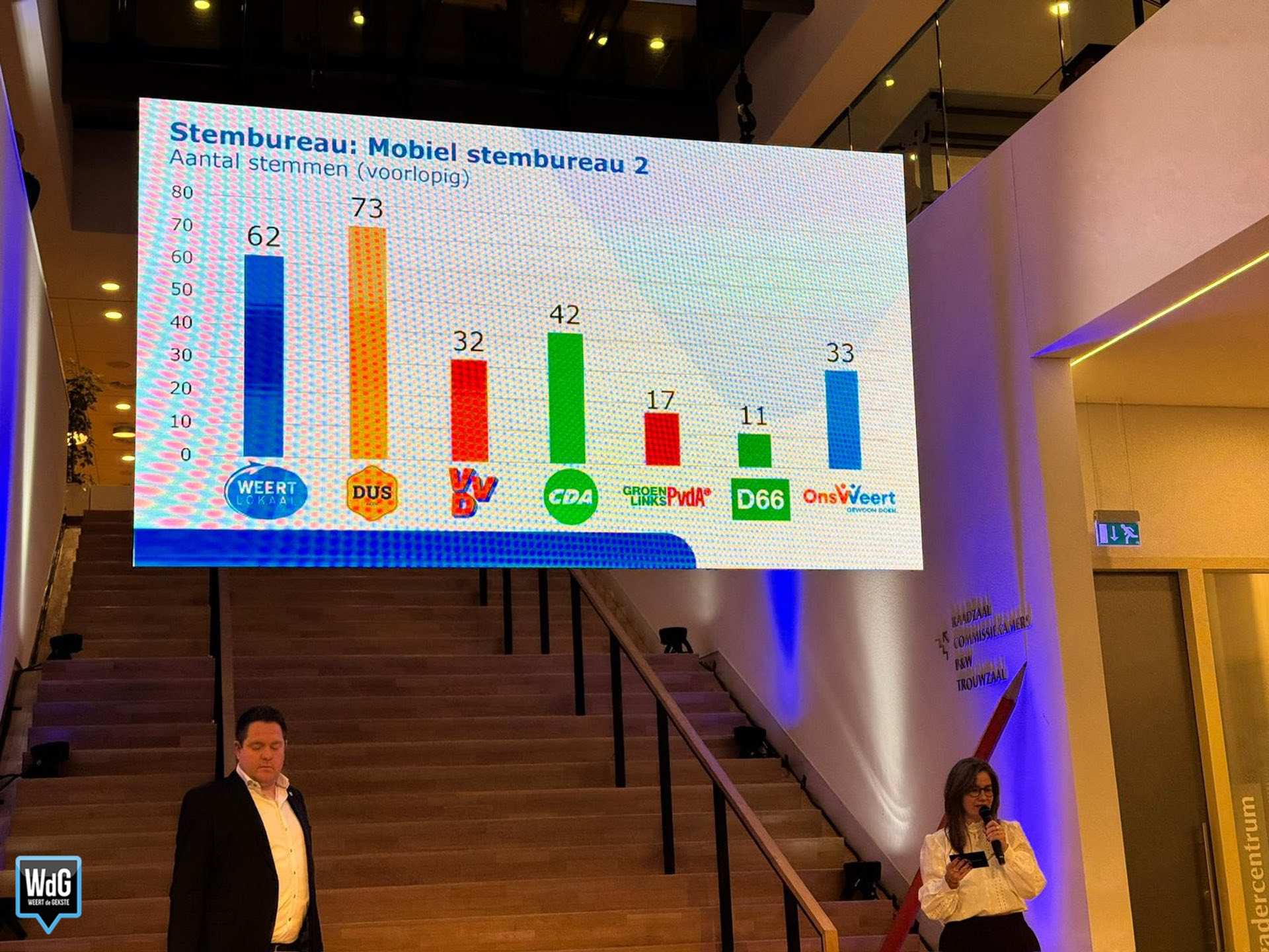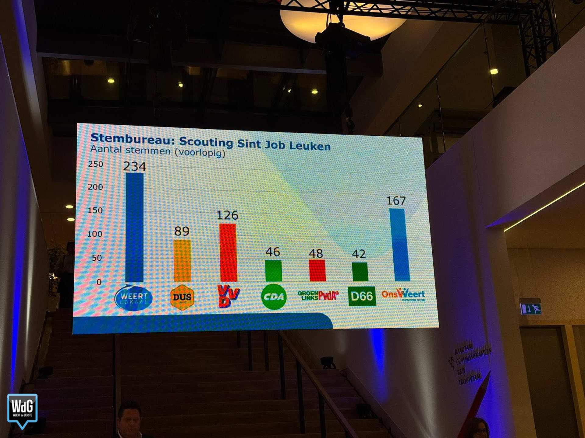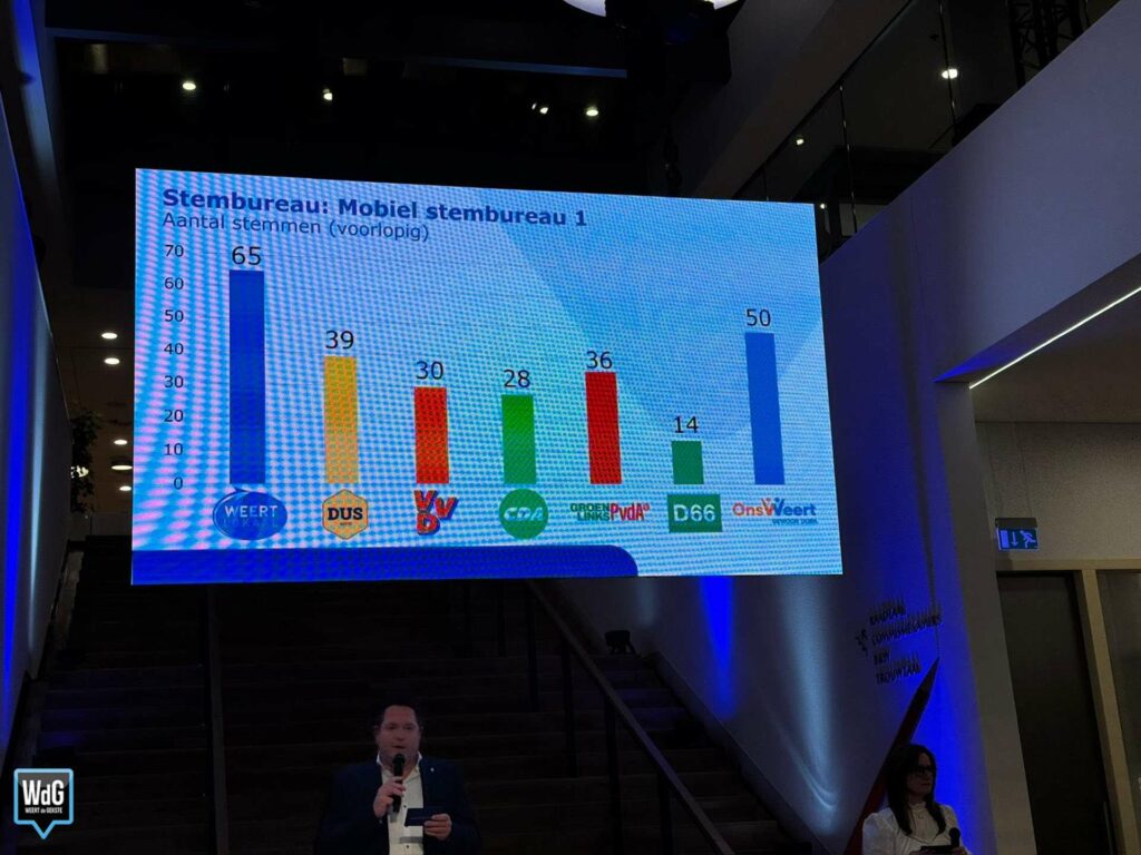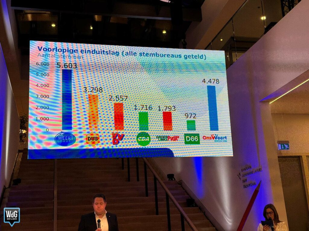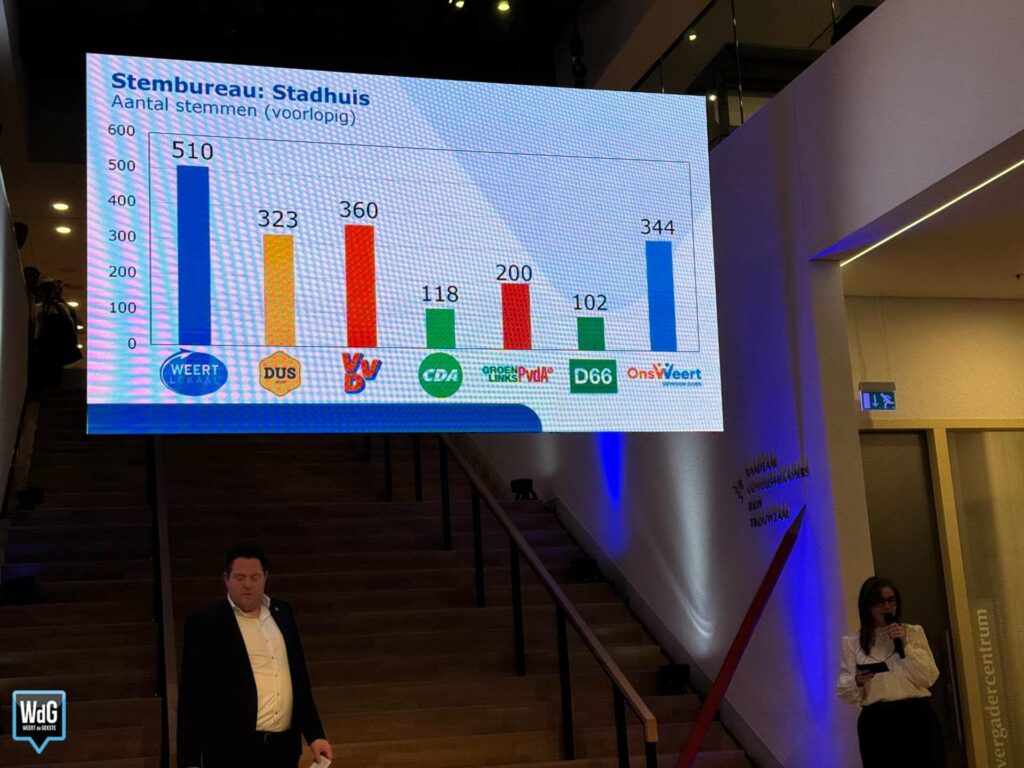 Ook de uitslag van het stembureau in het stadhuis is inmiddels bekend. Daar komt Weert Lokaal als grootste uit de bus met 510 stemmen. VVD volgt op korte afstand met 360 stemmen, terwijl Ons Weert 344 stemmen behaalt. DUS Weert komt uit op 323 stemmen.