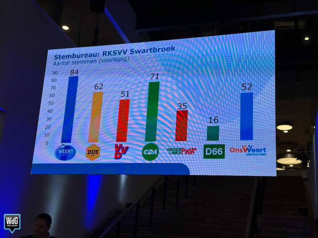 In Swartbroek (RKSVV) ligt het beeld anders. Daar is het CDA de grootste met 71 stemmen, gevolgd door Weert Lokaal (84), DUS Weert (62) en VVD (51). Ons Weert komt daar uit op 52 stemmen. GroenLinks/PvdA behaalt 35 stemmen en D66 16.