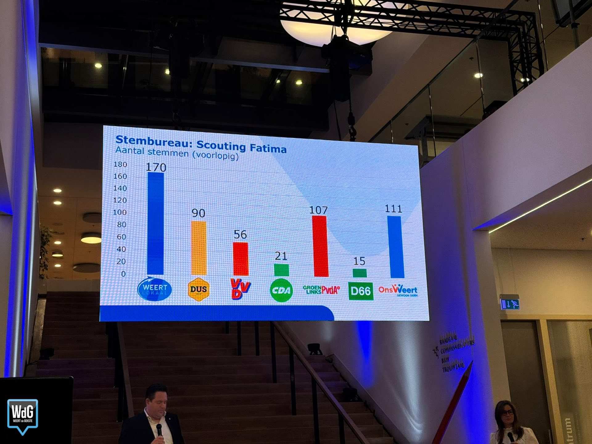 Ook van andere stembureaus zijn inmiddels voorlopige uitslagen bekendgemaakt. Bij Scouting Fatima is Weert Lokaal de grootste met 170 stemmen, gevolgd door Ons Weert (111) en GroenLinks/PvdA (107). DUS Weert behaalt daar 90 stemmen, VVD 56, CDA 21 en D66 15.