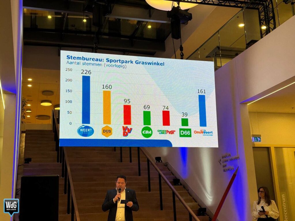 Bij sportpark Graswinkel noteert Weert Lokaal eveneens de meeste stemmen met 226. Ons Weert volgt met 161 stemmen en DUS Weert met 160 stemmen. VVD komt daar uit op 95 stemmen, GroenLinks/PvdA op 74, CDA op 69 en D66 op 39.
