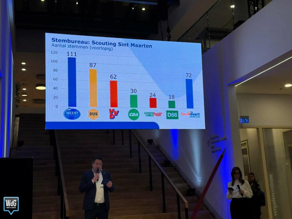 Bij Scouting Sint Maarten is Weert Lokaal opnieuw de grootste met 111 stemmen. DUS Weert volgt met 87 stemmen, terwijl Ons Weert daar 72 stemmen behaalt. VVD komt uit op 62 stemmen, CDA op 30, GroenLinks/PvdA op 24 en D66 op 18 stemmen.