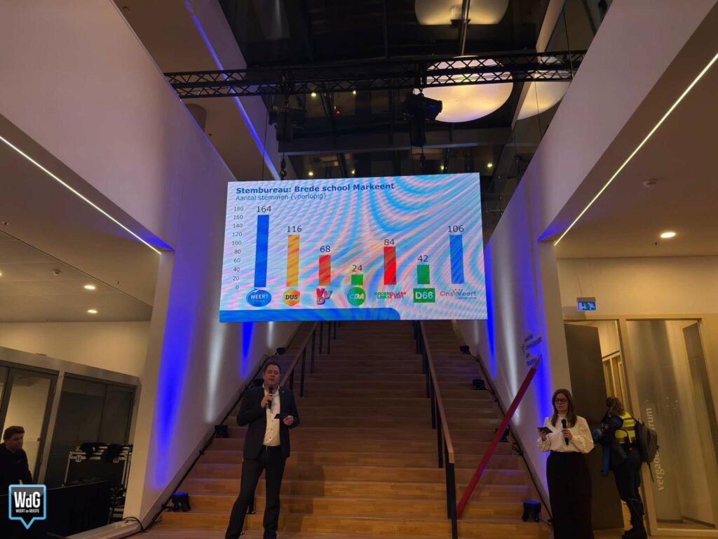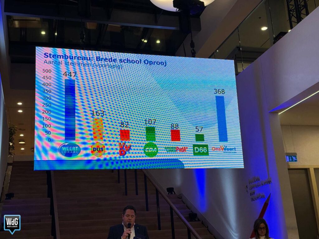 Bij Brede School Oprooj is het verschil groter: Weert Lokaal behaalt daar 447 stemmen, terwijl Ons Weert met 368 stemmen opnieuw stevig tweede wordt. DUS Weert komt uit op 163 stemmen, gevolgd door CDA (107), GroenLinks/PvdA (88), VVD (82) en D66 (57).