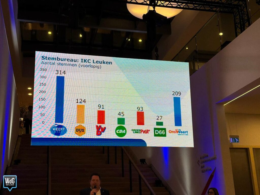 Bij IKC Leuken blijft Weert Lokaal met 314 stemmen duidelijk de grootste, gevolgd door Ons Weert met 209 stemmen. Daarachter volgen DUS Weert (124), GroenLinks/PvdA (93) en VVD (91). CDA komt uit op 45 stemmen en D66 op 27.