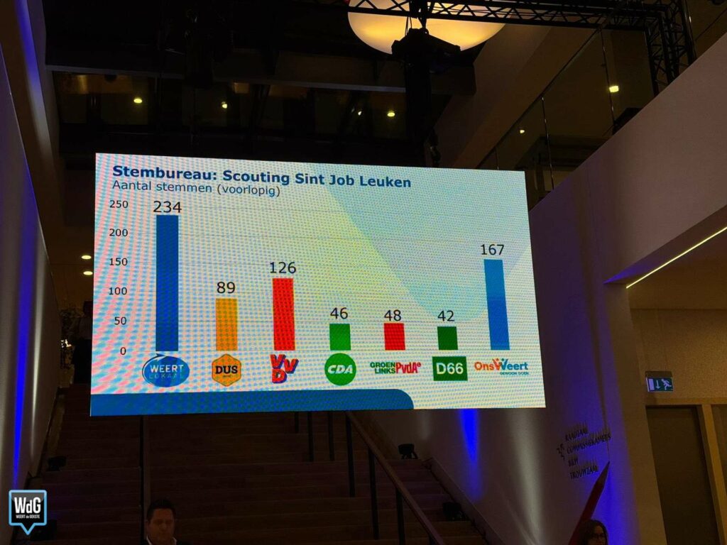 In scoutinggebouw Sint Job Leuken blijft Weert Lokaal opnieuw de grootste met 234 stemmen, gevolgd door Ons Weert (167). VVD behaalt daar 126 stemmen en DUS Weert 89. GroenLinks/PvdA komt uit op 48 stemmen, CDA op 46 en D66 op 42.