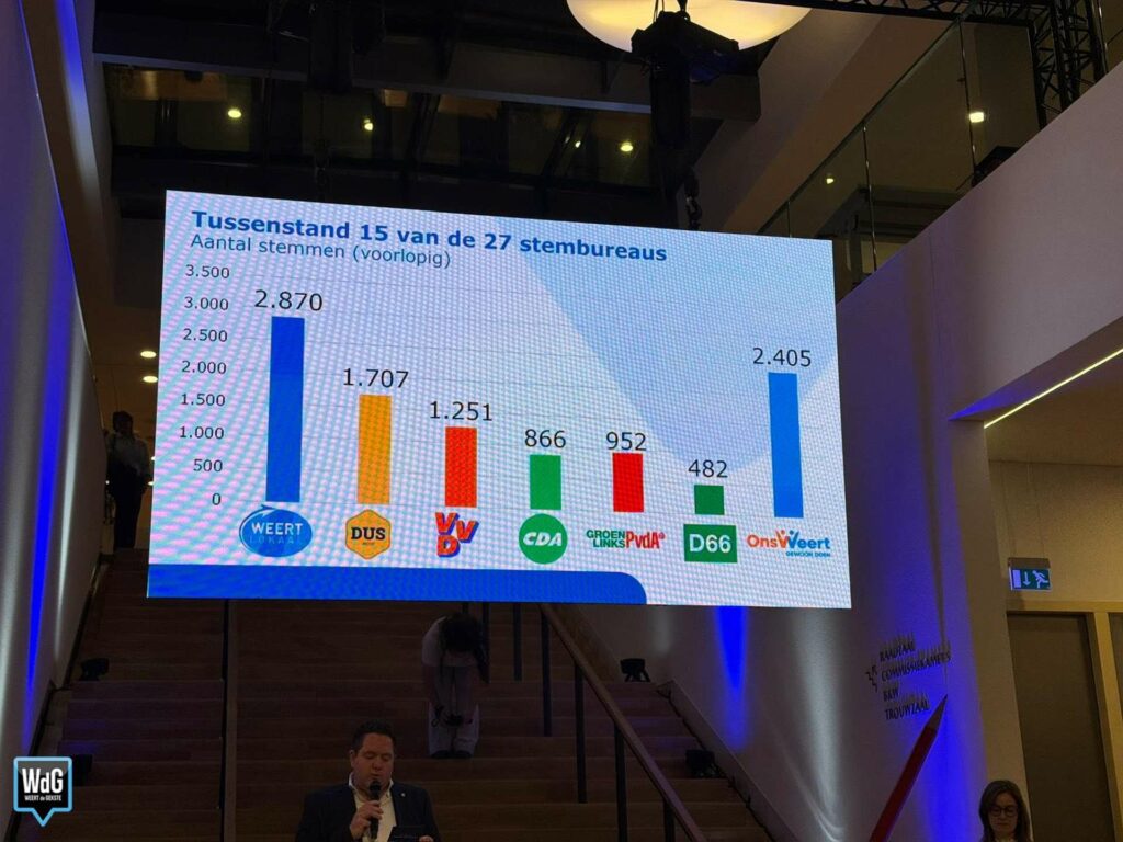 Na telling van 15 van de 27 stembureaus tekent zich een duidelijker beeld af. Weert Lokaal gaat voorlopig aan kop met 2.870 stemmen. Op de tweede plaats volgt Ons Weert met 2.405 stemmen, waarmee de nieuwkomer zich nadrukkelijk laat zien.