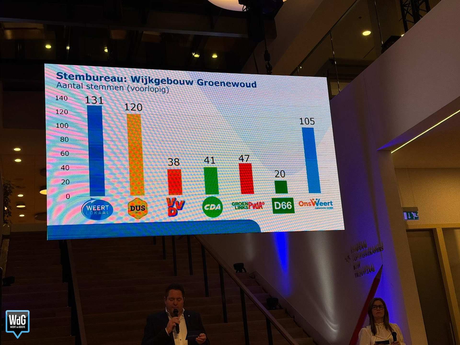 In Gemeenschapshuis Groenewoud ligt het dicht bij elkaar: Weert Lokaal behaalt 131 stemmen, gevolgd door DUS Weert met 120 en Ons Weert met 105.