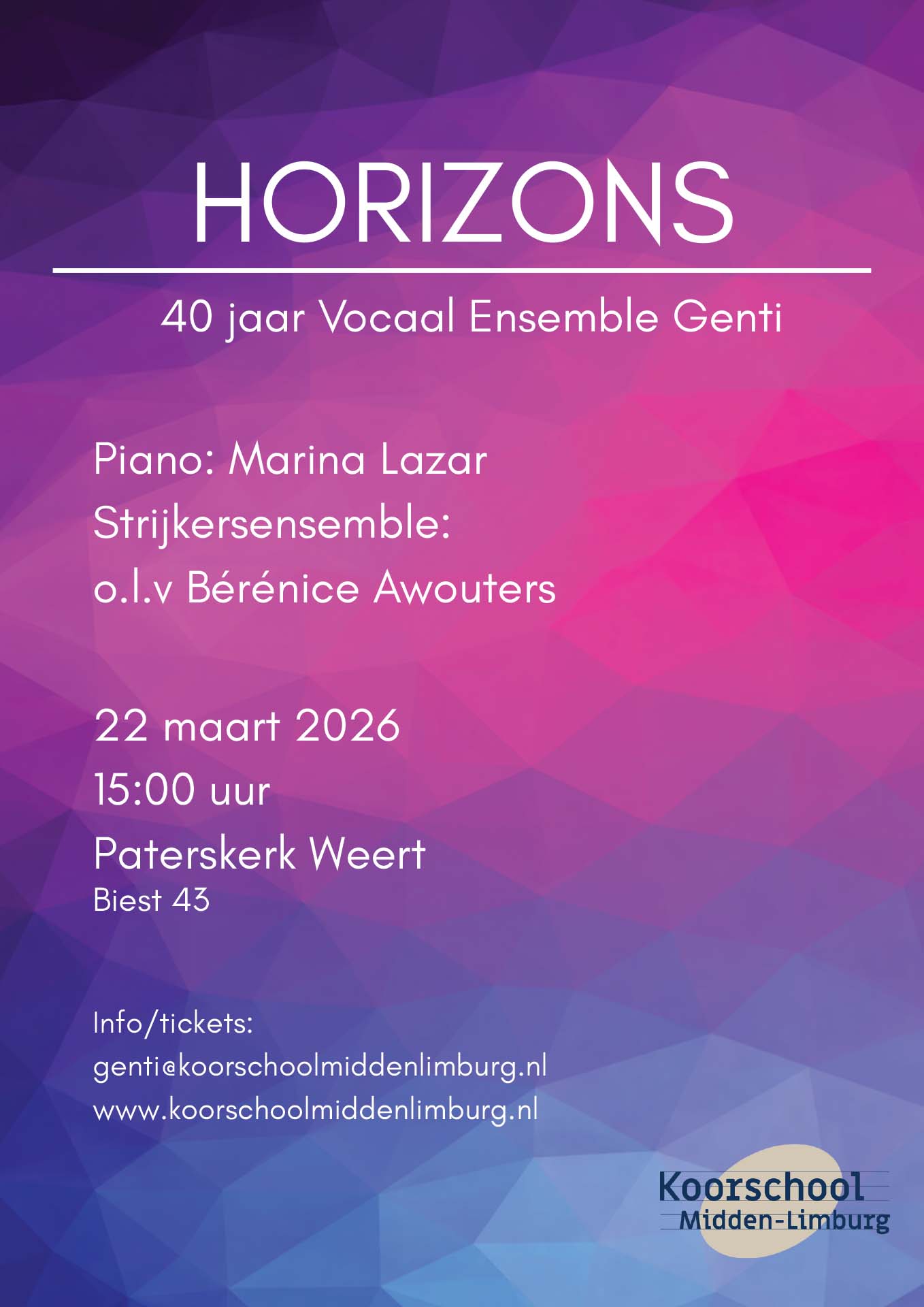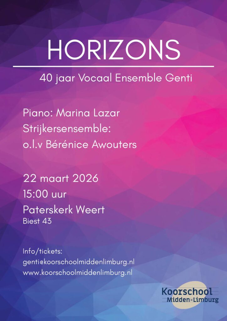 Ter gelegenheid van haar 40-jarig bestaan opent Vocaal Ensemble Genti op 22 maart haar jubileumjaar met het concert Horizons.