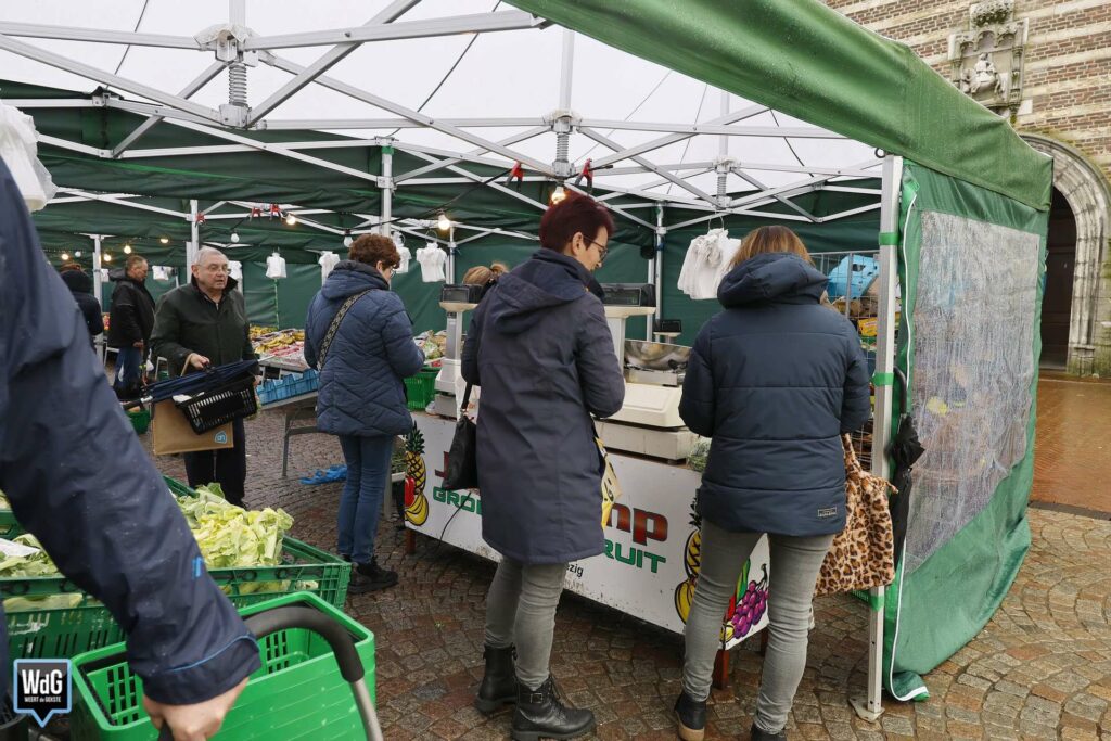 Toch lieten niet alle bezoekers zich tegenhouden door de regen. Her en der liepen mensen met een paraplu over de markt om hun boodschappen te doen. Vooral bij de kramen met brood, bloemen en andere verse producten stonden nog wat klanten.